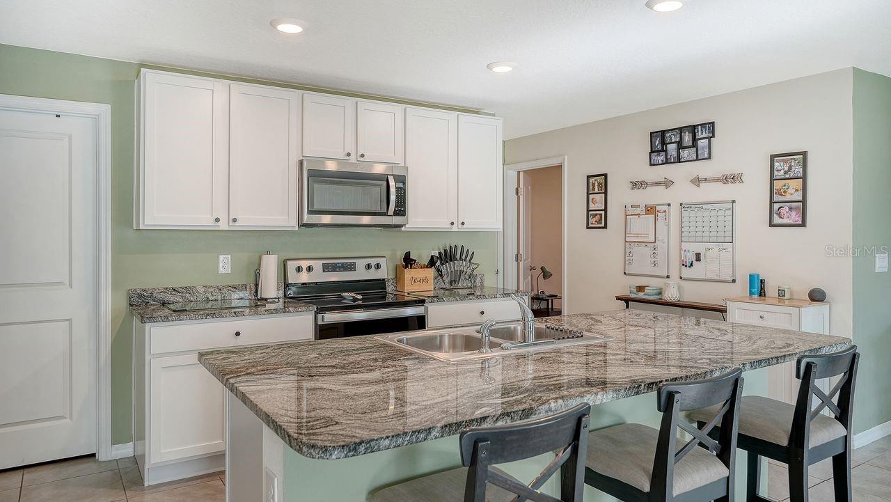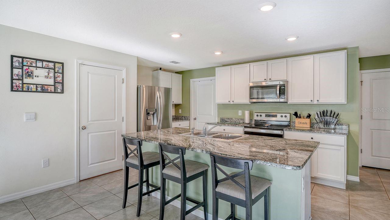 Located in the desirable Bella Lago community, this beautifully updated 5-bedroom, 3-bath home offers the perfect blend of comfort, space, and scenic living. Residents enjoy resort-style amenities including two pools, a fitness center, and a playground, all in a family-friendly setting. Inside, the home features a bright, open floor plan ideal for both everyday living and entertaining. The spacious kitchen boasts granite countertops, a large center island, and generous pantry storage. The flexible layout includes a bonus loft/flex space, perfect for homeschooling, a playroom, home office, or cozy reading nook. The primary suite is a relaxing retreat with a walk-in closet and a private en-suite bath with dual vanities and a walk-in shower. A second-floor laundry room adds everyday convenience for a busy household. Step outside to an extended screened lanai overlooking a peaceful water view with fountain, creating the perfect backdrop for morning coffee or evening relaxation. The fenced backyard offers privacy while preserving the view. This move-in-ready Bella Lago home delivers space, style, and scenic water views right now.