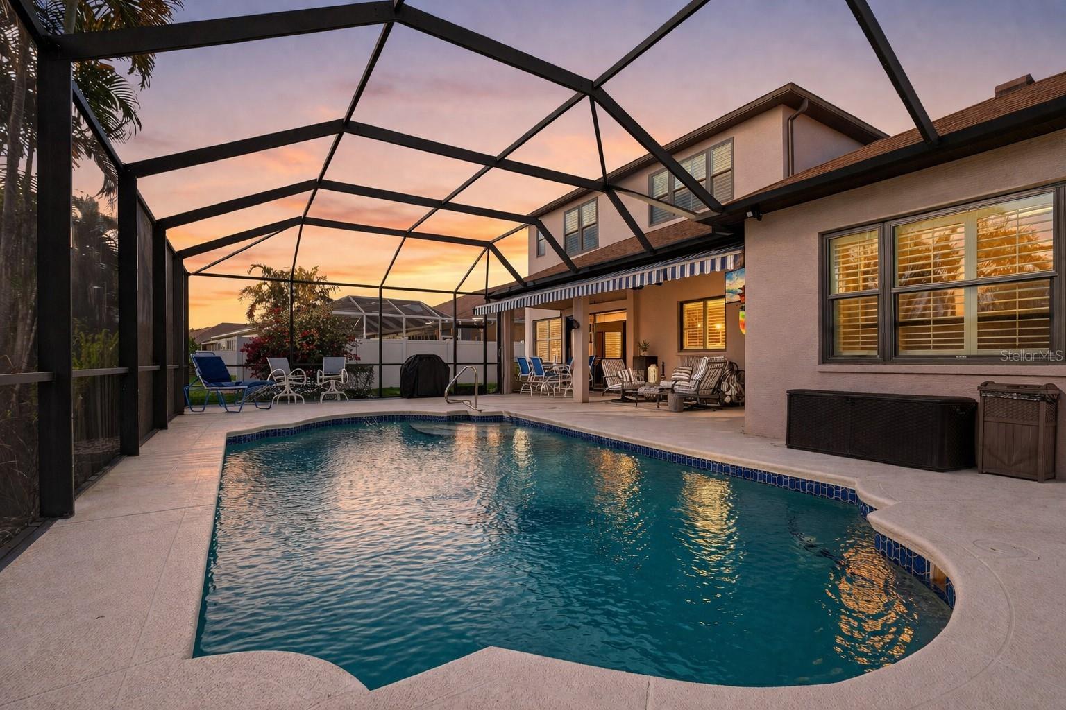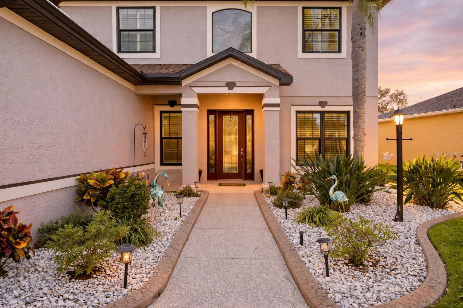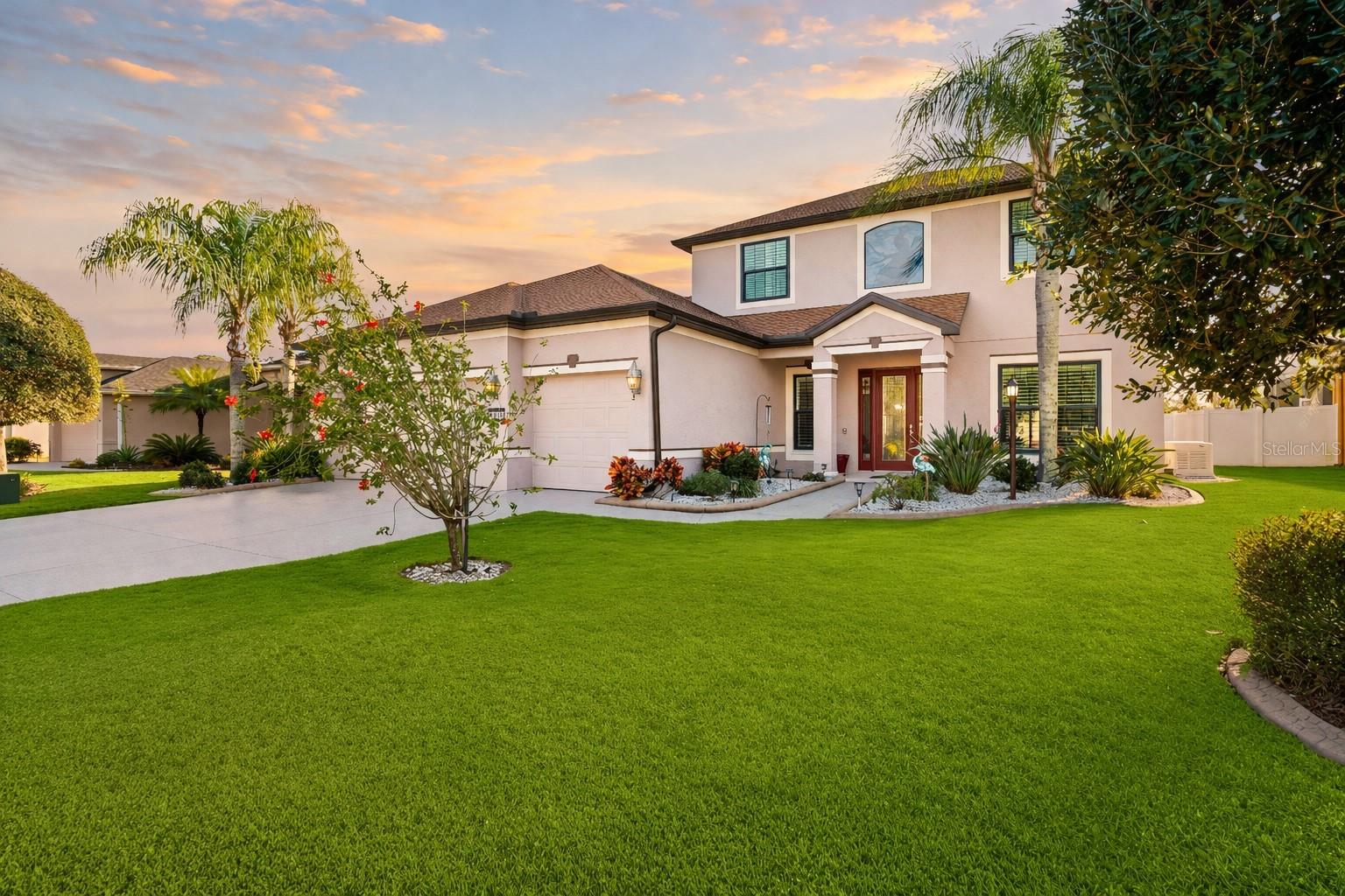 Set within the gated Chelsea Oaks community, the Nassau floorplan by Medallion Home has been thoughtfully transformed into a residence that blends smart design, timeless finishes, and exceptional peace-of-mind upgrades, all positioned on a tranquil water and preserve view lot in a quiet back corner of the neighborhood. From the moment you step inside the dramatic two-story foyer, it is clear this home was designed to impress without trying too hard. The layout flows effortlessly, offering a formal dining room with custom dry bar, a private den or home office, and a spacious family room anchored by a refreshed chef’s kitchen featuring new countertops, stone and tile accents, under and above cabinet lighting, walk-in pantry, and breakfast bar, perfect for both everyday living and easy entertaining. The primary suite is conveniently located on the main level, offering a tray ceiling, dual walk-in closets, and a spa-inspired bath with soaking tub, separate shower, dual vanities, and private access to the lanai. Upstairs, three generously sized guest bedrooms, including one with an ensuite, plus an additional full bath and a bonus or game room provide flexible space for family, guests, hobbies, and work-from-home needs. Now for the part that truly sets this home apart, the upgrades. A new roof in 2021, IMPACT WINDOWS AND SLIDING DOORS, whole-home Generac GENERATOR with a 500-gallon LP tank, dual A/C systems, GE water softener, Rain Bird irrigation, electric load management system, epoxy-flake garage flooring, and decorative landscape curbing with low-care rock fill deliver comfort, efficiency, and reliability. Outside, the oversized and expanded lanai and POOL area create the ultimate Florida lifestyle, complete with water fountain feature, pool HEATER, and custom electric awnings, all overlooking peaceful water and preserve views. Located in GATED Chelsea Oaks with low HOA fees, no CDD, and amenities including a community pool and playground, this home is just minutes from new parks, shopping, dining, and daily conveniences. This is not just a home. It is a well-planned lifestyle upgrade.