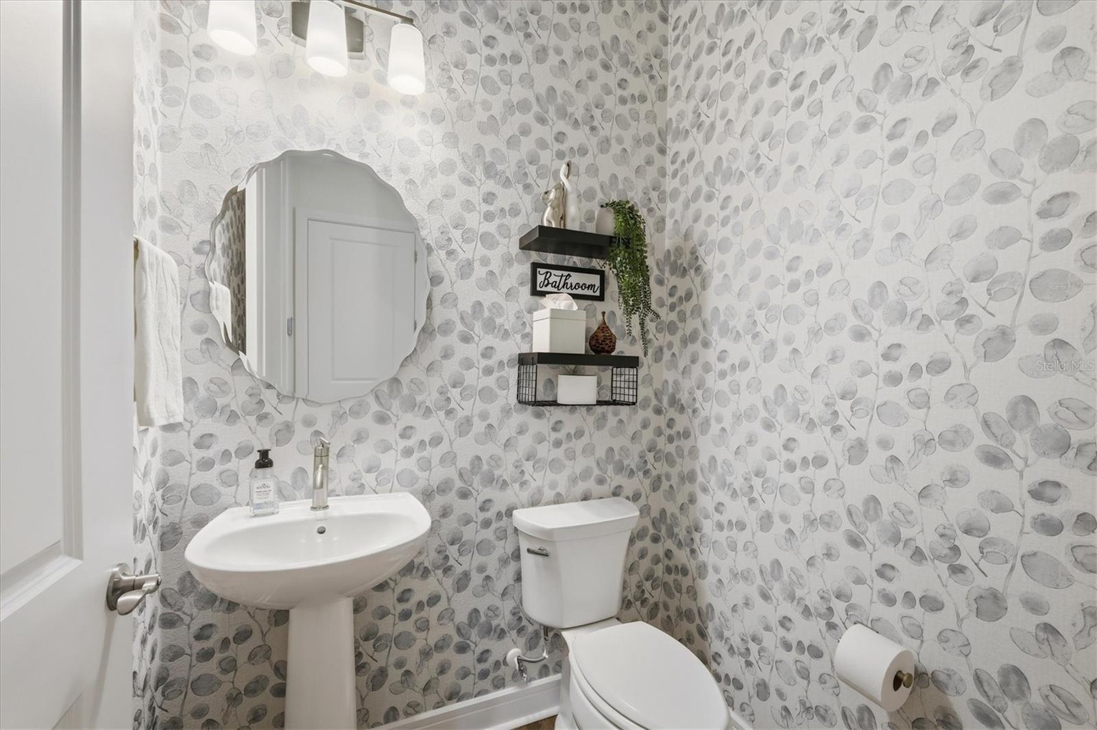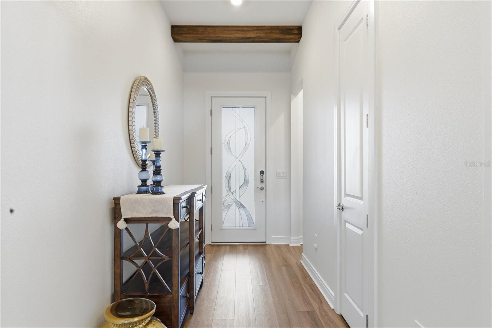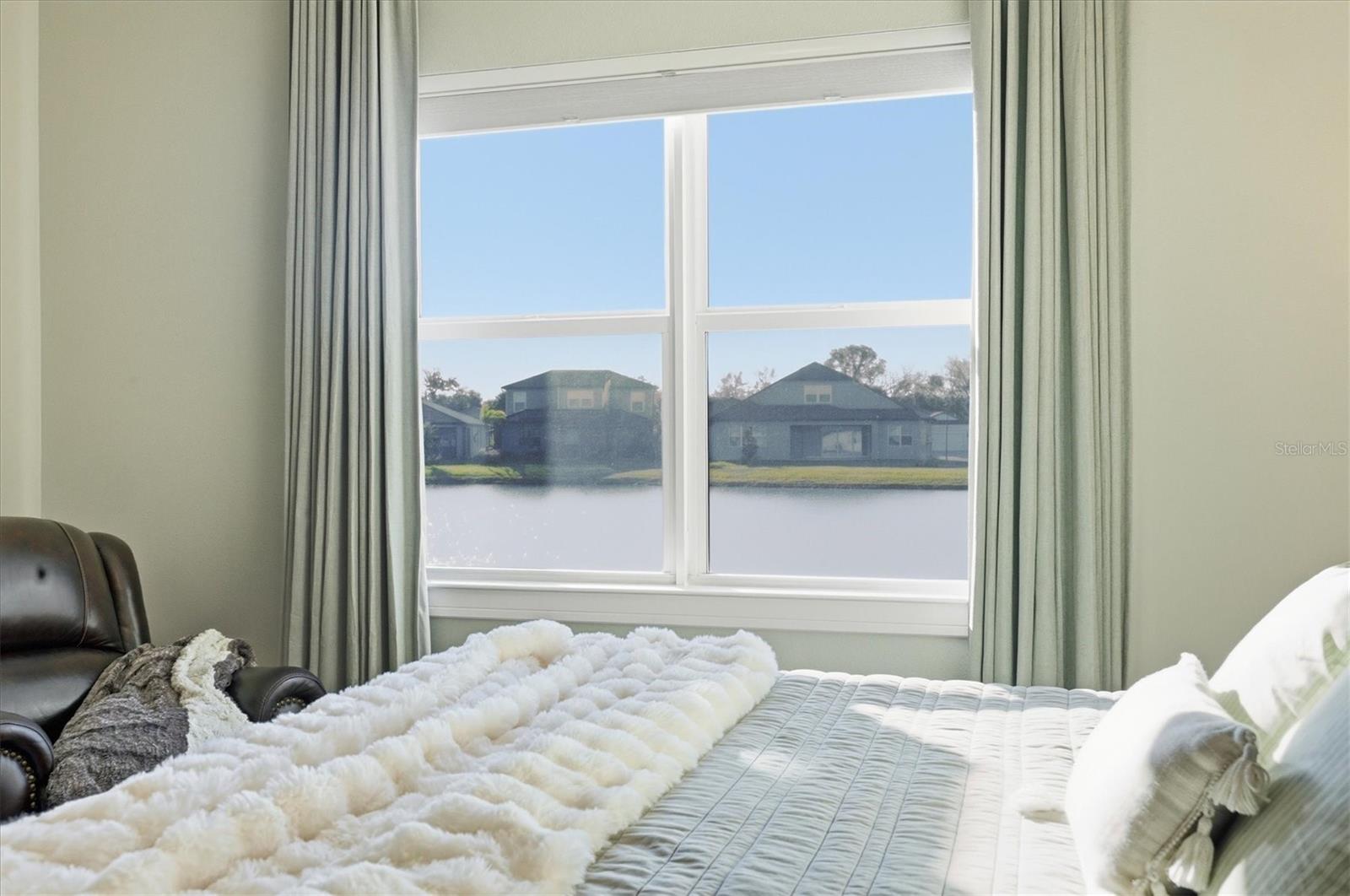 The reasons buyers love the PRESTIGE floorplan are many. A half bath for guests. A primary bedroom that features two walk-in closets. An additional oversized walk-in storage closet- just across from the kitchen. BUT it is the soaring 11ft ceilings that allow this home to feel much larger than 2080 sq ft! Inside this home, the wow continues as the sellers added wood-look beams in the foyer and gathering room, a perfectly placed drop zone just inside the garage. Speaking of the garage, there are solidly built high storage units. Outside, remote-controlled storm screens serve a dual purpose- safety but also keep the cooled or warmed air inside for additional entertaining space. A big, beautiful southerly pond view is visible from the Cafe, Gathering Room and Primary bedroom. Impact windows and doors provide safety and soundproofing; a Super shower with bench in the primary ensuite allows for aging in place and the guest bath has a walk-in shower also. The extended covered lanai and screened patio offers everything anyone could want in a Florida home. Located in the very active and competitive Del Webb Bay View where you can be as busy as you want to be! Pickleball, Tennis, Bocce, Table tennis, shuffleboard, etc. A heated resort style pool, resistance pool and lap pool, hot tub, community garden, clubs galore and with a restaurant on site, Bay View is golf cart friendly. Not to be forgotten- Two dog parks for our furry friends. Located 1.5 miles from I75 and 275.