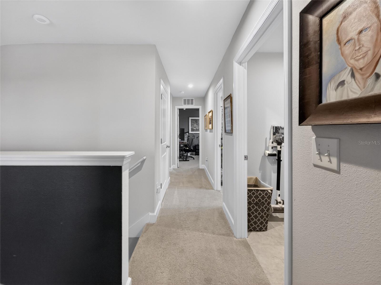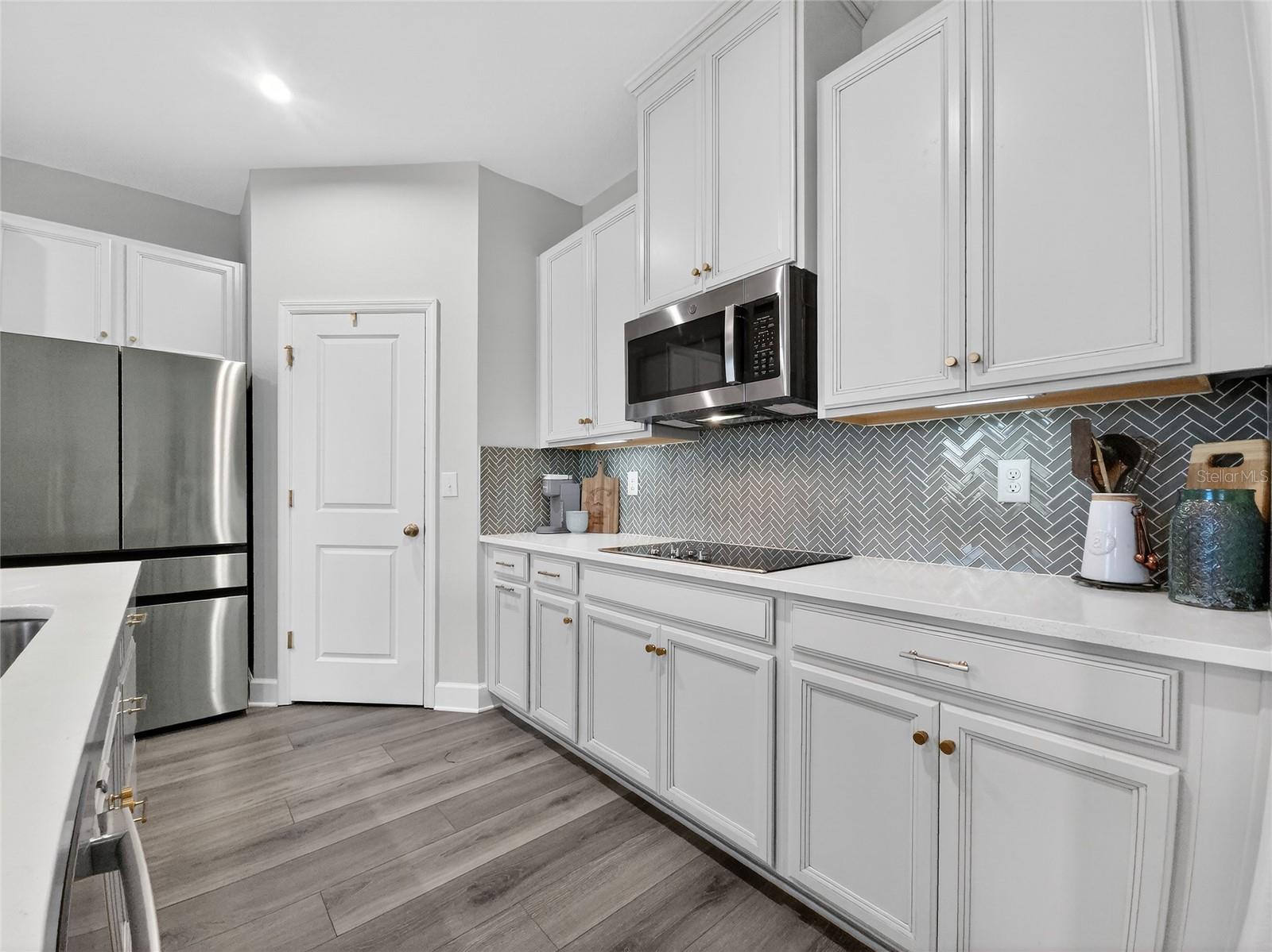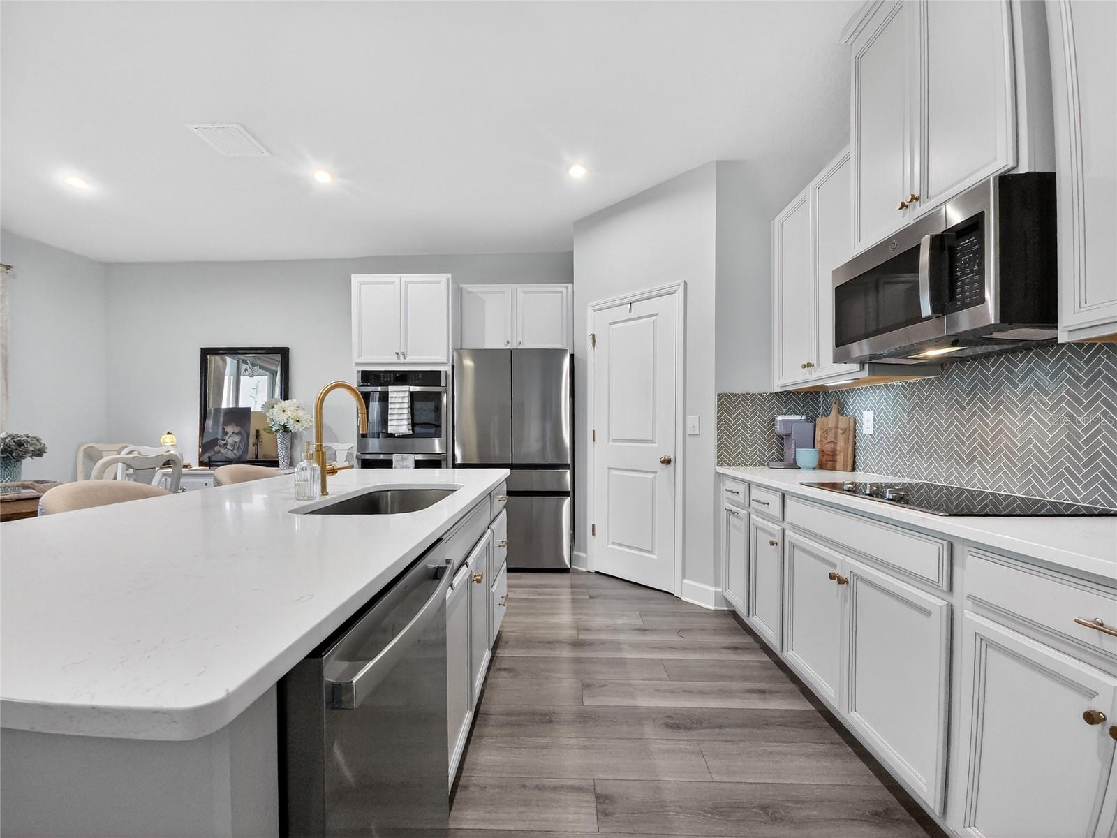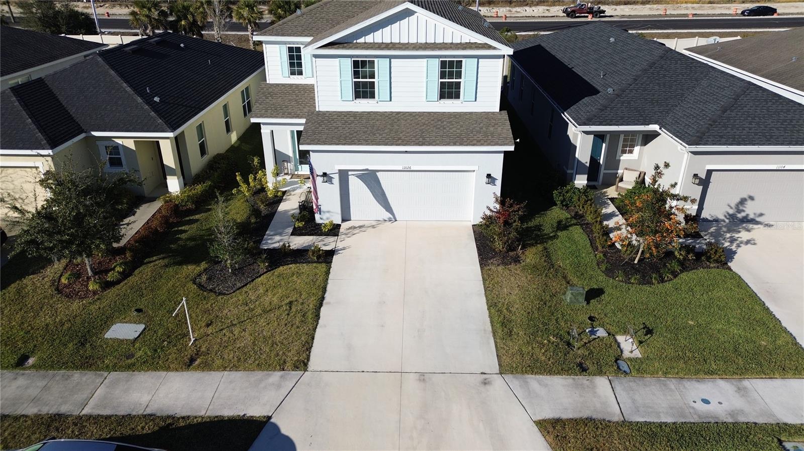 This beautifully maintained 2-year-old 3-bedroom, 2.5-bath home is ideally located in Parrish, FL, just a short distance from the community pool, dog park, and playground. With modern finishes and thoughtful design throughout, the home offers a comfortable and inviting living environment. The main level features grey luxury vinyl plank flooring and a custom wainscoting feature wall that flows from the foyer through the living room, creating a warm and cohesive space. The kitchen is both stylish and functional, offering quartz countertops, a large island accented with wainscoting and stained wood trim, antique gold hardware and faucet, double wall ovens, a deep sink, tile backsplash, and a walk-in pantry—ideal for everyday living and entertaining alike. Natural light fills the home through tinted windows and sliding glass doors that help reduce UV exposure and heat while still allowing sunlight to shine through and providing added daytime privacy. A conveniently located half bath completes the main floor. Upstairs, the upgraded wood staircase leads to all three bedrooms, a versatile loft, and an enhanced laundry room with upper cabinetry and a folding countertop; washer and dryer convey with the home. Upstairs living areas are carpeted, with tile flooring in the bathrooms and laundry room. The guest bathroom features tile flooring and a tile tub/shower surround. The primary suite includes his-and-hers closets and a well-appointed bathroom with tile flooring, a tiled shower with bench, dual shower heads, a linen closet, and a separate water closet. All windows throughout the home are double-hung for easy cleaning. Additional highlights include an epoxy chip garage floor, extra storage under the stairs with a door to be completed, and additional garage depth currently set up for a second refrigerator. The home also offers an open lanai, a sprinkler system with automatic sensor, and an upgraded decorative glass front door—completing this move-in-ready property. Owner is a licensed real estate agent. Buyer to verify all information.