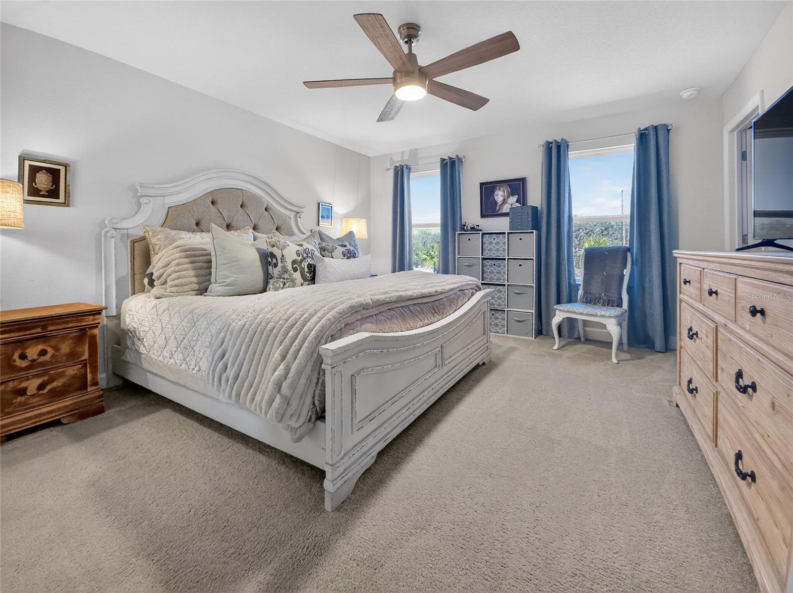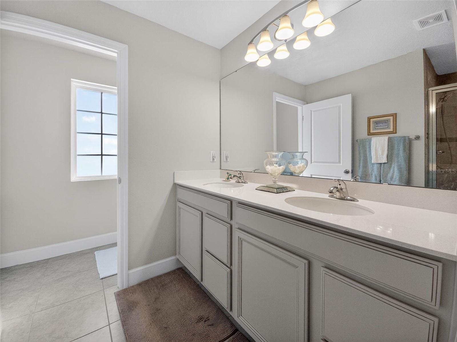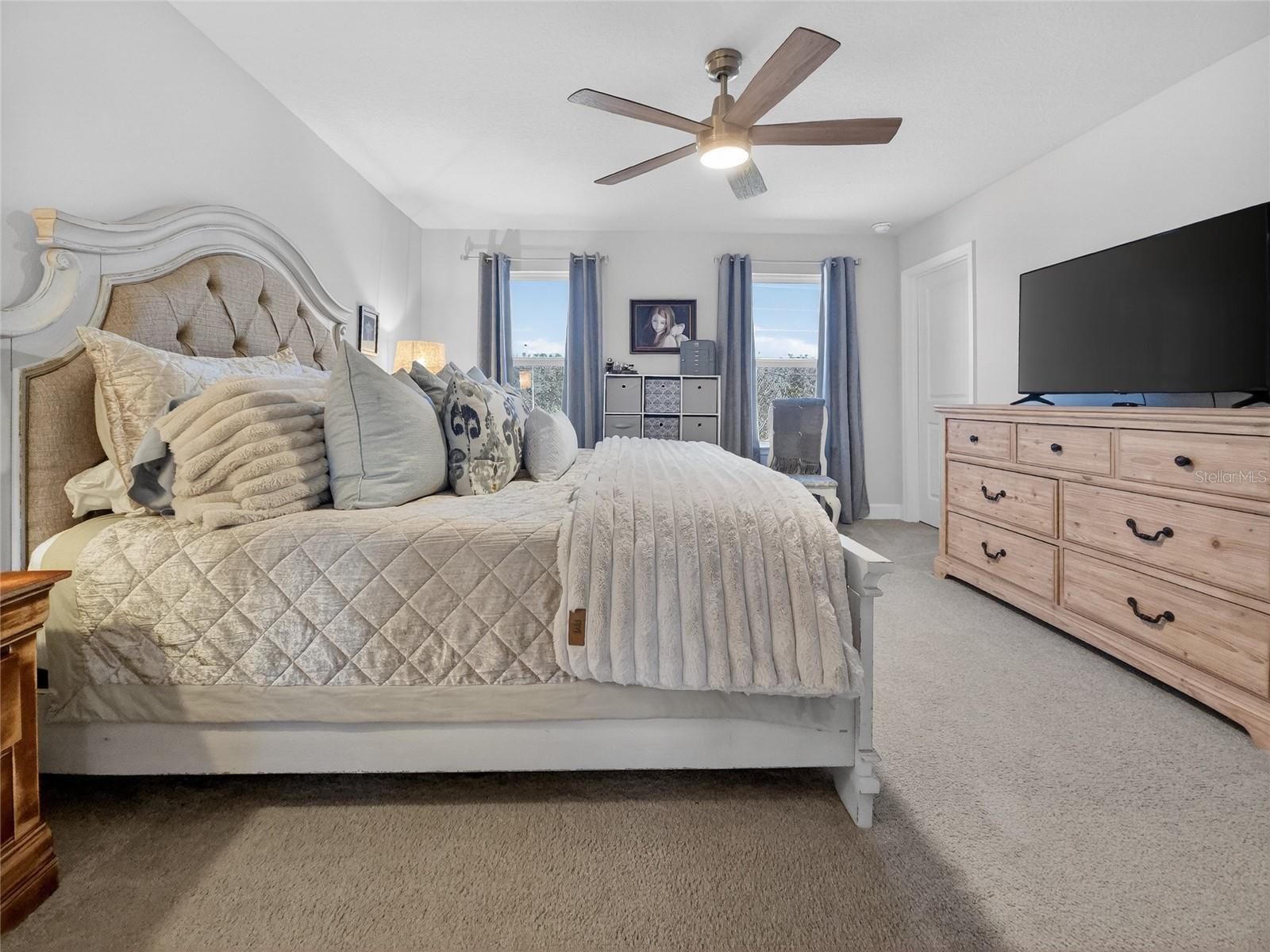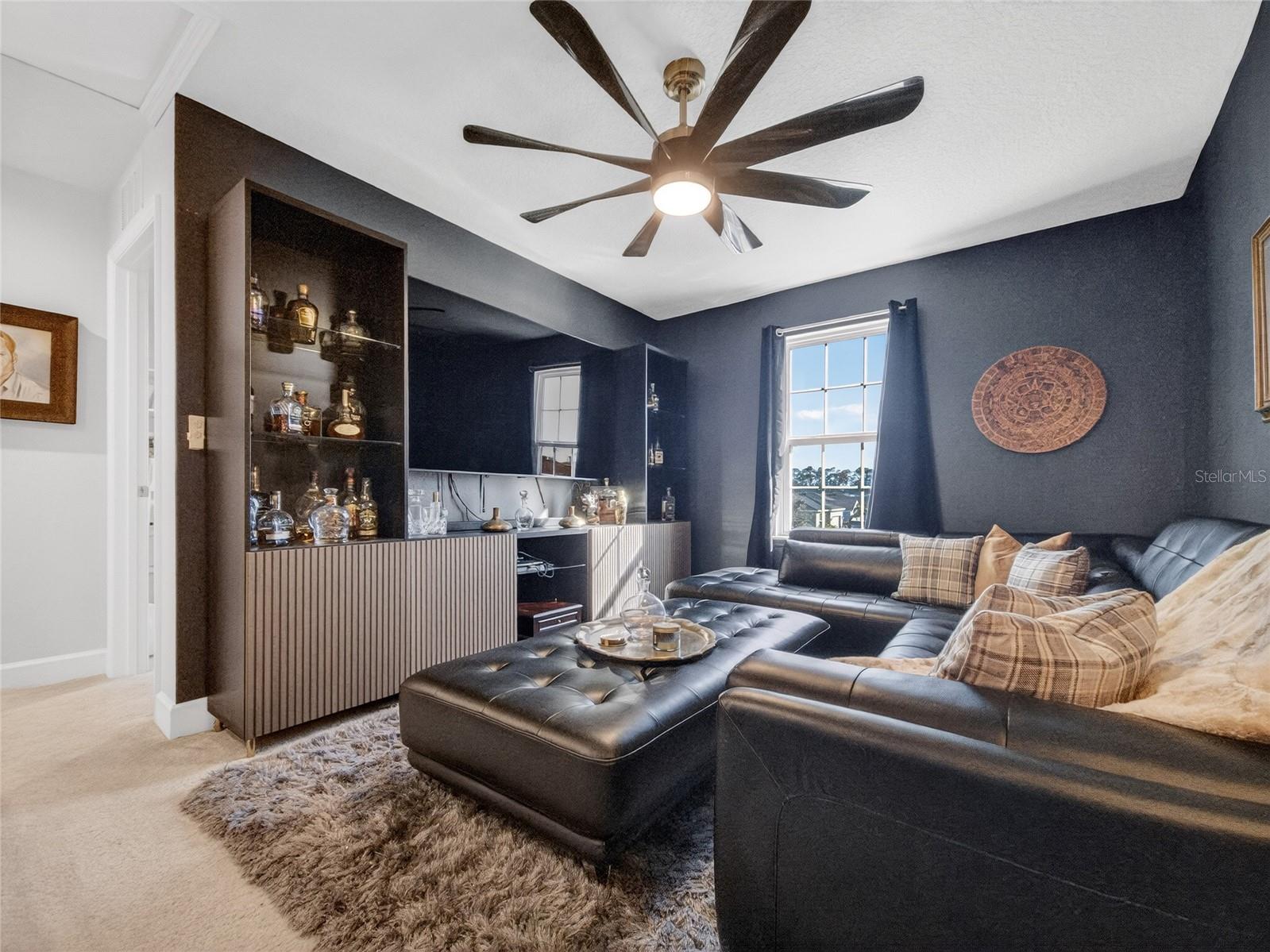 This beautifully maintained 2-year-old 3-bedroom, 2.5-bath home is ideally located in Parrish, FL, just a short distance from the community pool, dog park, and playground. With modern finishes and thoughtful design throughout, the home offers a comfortable and inviting living environment. The main level features grey luxury vinyl plank flooring and a custom wainscoting feature wall that flows from the foyer through the living room, creating a warm and cohesive space. The kitchen is both stylish and functional, offering quartz countertops, a large island accented with wainscoting and stained wood trim, antique gold hardware and faucet, double wall ovens, a deep sink, tile backsplash, and a walk-in pantry—ideal for everyday living and entertaining alike. Natural light fills the home through tinted windows and sliding glass doors that help reduce UV exposure and heat while still allowing sunlight to shine through and providing added daytime privacy. A conveniently located half bath completes the main floor. Upstairs, the upgraded wood staircase leads to all three bedrooms, a versatile loft, and an enhanced laundry room with upper cabinetry and a folding countertop; washer and dryer convey with the home. Upstairs living areas are carpeted, with tile flooring in the bathrooms and laundry room. The guest bathroom features tile flooring and a tile tub/shower surround. The primary suite includes his-and-hers closets and a well-appointed bathroom with tile flooring, a tiled shower with bench, dual shower heads, a linen closet, and a separate water closet. All windows throughout the home are double-hung for easy cleaning. Additional highlights include an epoxy chip garage floor, extra storage under the stairs with a door to be completed, and additional garage depth currently set up for a second refrigerator. The home also offers an open lanai, a sprinkler system with automatic sensor, and an upgraded decorative glass front door—completing this move-in-ready property. Owner is a licensed real estate agent. Buyer to verify all information.