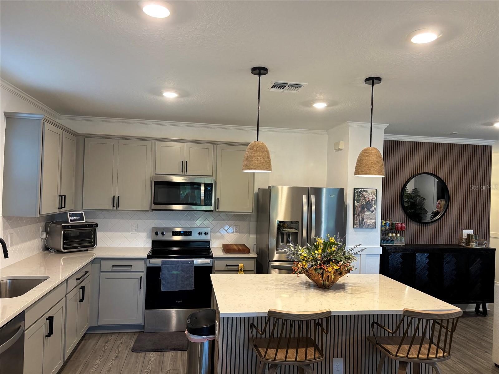 PROFESSIONAL PHOTOS COMING SOON... Welcome to this stunning, nearly new home in the highly desirable Isles at Bayview community in Parrish. Perfectly positioned on a premium lot with serene private preserve views, this impressive 4-bedroom, 3-bath residence with a 2-car garage offers modern elegance, thoughtful upgrades, and exceptional indoor-outdoor living. Only two years old, this home shows like a model and is truly move-in ready. From the moment you enter, you’ll appreciate the bright, open-concept layout designed for both comfortable everyday living and effortless entertaining. The freshly painted interior is enhanced by crown molding, picture frame molding, and chair rail detailing throughout the entire first floor, creating a refined and stylish atmosphere. A beautifully remodeled staircase with the wall removed opens the main level to the loft, delivering a contemporary, airy feel. Glass French doors highlight the pantry and bar area, while a custom feature wall adds character and visual interest to the loft space. The kitchen has been thoughtfully upgraded with new hardware, drawer pulls, and handles, complemented by updated faucets in the kitchen and all bathrooms. Newly installed designer lighting and ceiling fans elevate every room, and upgraded door handles and knobs throughout provide a cohesive, polished finish. A blend of luxury vinyl plank flooring and plush carpet adds both durability and comfort. Step outside to your private outdoor retreat featuring an extended patio, added screening on the lanai, and expanded paver area—perfect for entertaining, relaxing, or enjoying peaceful preserve views. The home’s curb appeal is enhanced with upgraded landscaping and white decorative rock around the perimeter for a clean, modern look. Residents of Isles at Bayview enjoy fantastic amenities including a clubhouse, resort-style pool, dog park, and playground. Ideally located off Moccasin Wallow Road with quick access to I-75, approximately 30 minutes to St. Pete, and just minutes from a brand-new hospital, shopping, dining, golf, and beautiful Gulf beaches. This home offers the perfect combination of tranquility, convenience, and modern Florida living. Don’t miss your opportunity to own this exceptional property.