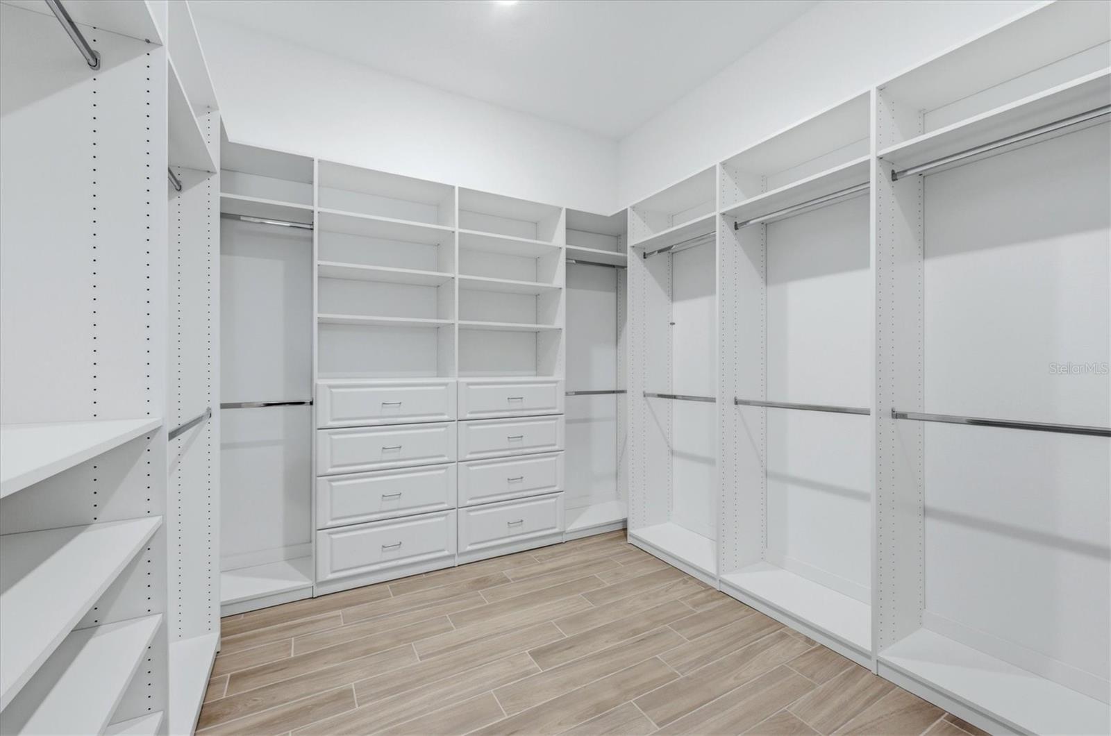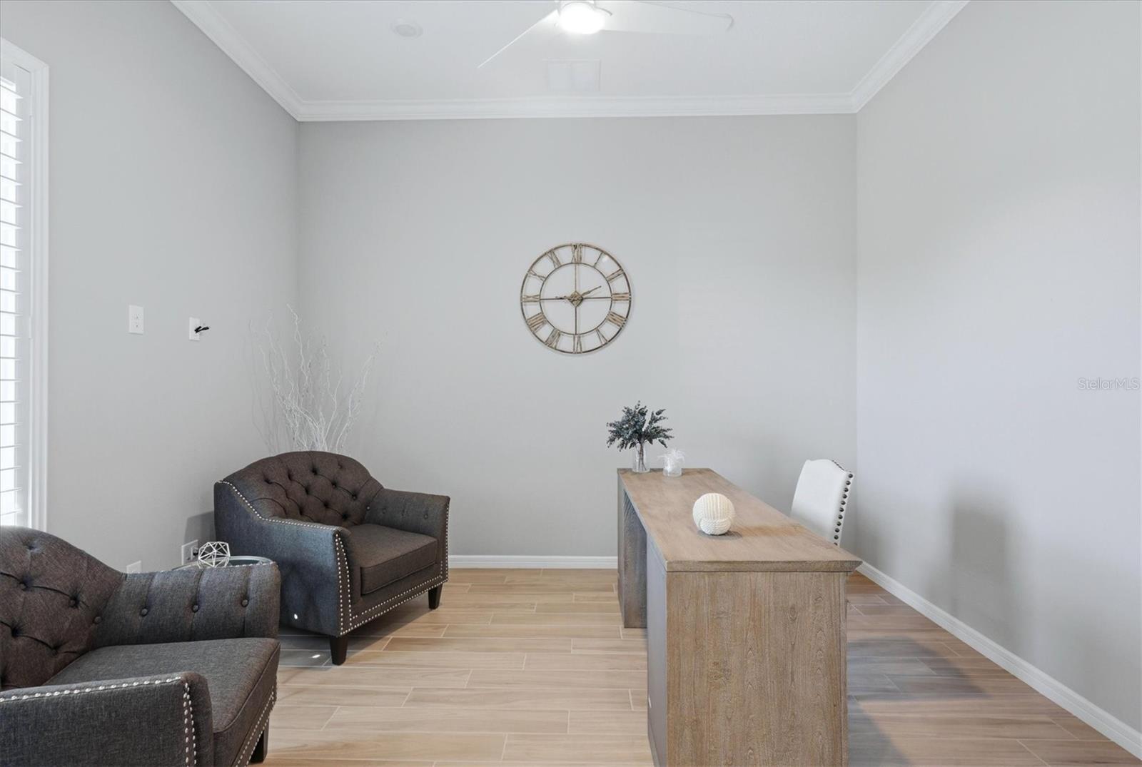 Experience elevated waterfront living in this beautifully designed Stellar floor plan, ideally situated on a premium oversized cul-de-sac homesite in the highly desired, guard-gated Del Webb BayView community. Thoughtfully built for both comfort and security, the home is equipped with impact-resistant windows and doors throughout. This spacious residence offers 3 bedrooms, 3 full baths, and a versatile den perfect for a home office or flex space. Interior features include tray ceilings, crown molding, luxury plank flooring, and upgraded motorized ceiling fans, all contributing to a refined yet inviting atmosphere. At the heart of the home, the gourmet kitchen impresses with striking quartz countertops, a custom pantry, high-end KitchenAid appliances, soft-close cabinetry, pull-out shelving, and a large center island that opens to the main living area, ideal for both everyday living and entertaining. Adjacent dining space is enhanced by plantation shutters, designer lighting, and custom window treatments. The owner’s suite offers a peaceful retreat with abundant natural light and a spa-inspired bathroom featuring floor-to-ceiling tile, a spacious walk-in shower with bench seating, dual shower heads, and a rain shower feature. A professionally designed walk-in closet provides ample storage and organization. Guests will appreciate the privacy of the secondary bedroom with its own beautifully appointed en-suite bath, complete with elegant tilework and a seamless glass shower enclosure. A well-equipped laundry room includes built-in cabinetry and a utility sink for added convenience. Seamless indoor-outdoor living is achieved with zero-corner sliding glass doors that open to an expansive screened lanai, pre-plumbed for an outdoor kitchen and outfitted with a remote-controlled solar/wind screen. The tranquil water views and generous lot size provides plenty of room to design your dream pool. Residents of this vibrant 55+ community enjoy access to resort-style amenities, including a clubhouse, fitness center, zero-entry pool, lap pool, spa, on-site dining, and a full calendar of social activities and clubs. Conveniently located near St. Petersburg, Tampa, and Sarasota, you’re just a short drive from top-tier shopping, dining, entertainment, and some of Florida’s most beautiful beaches. Skip the wait for new construction, this exceptional home is ready to be enjoyed now!!
