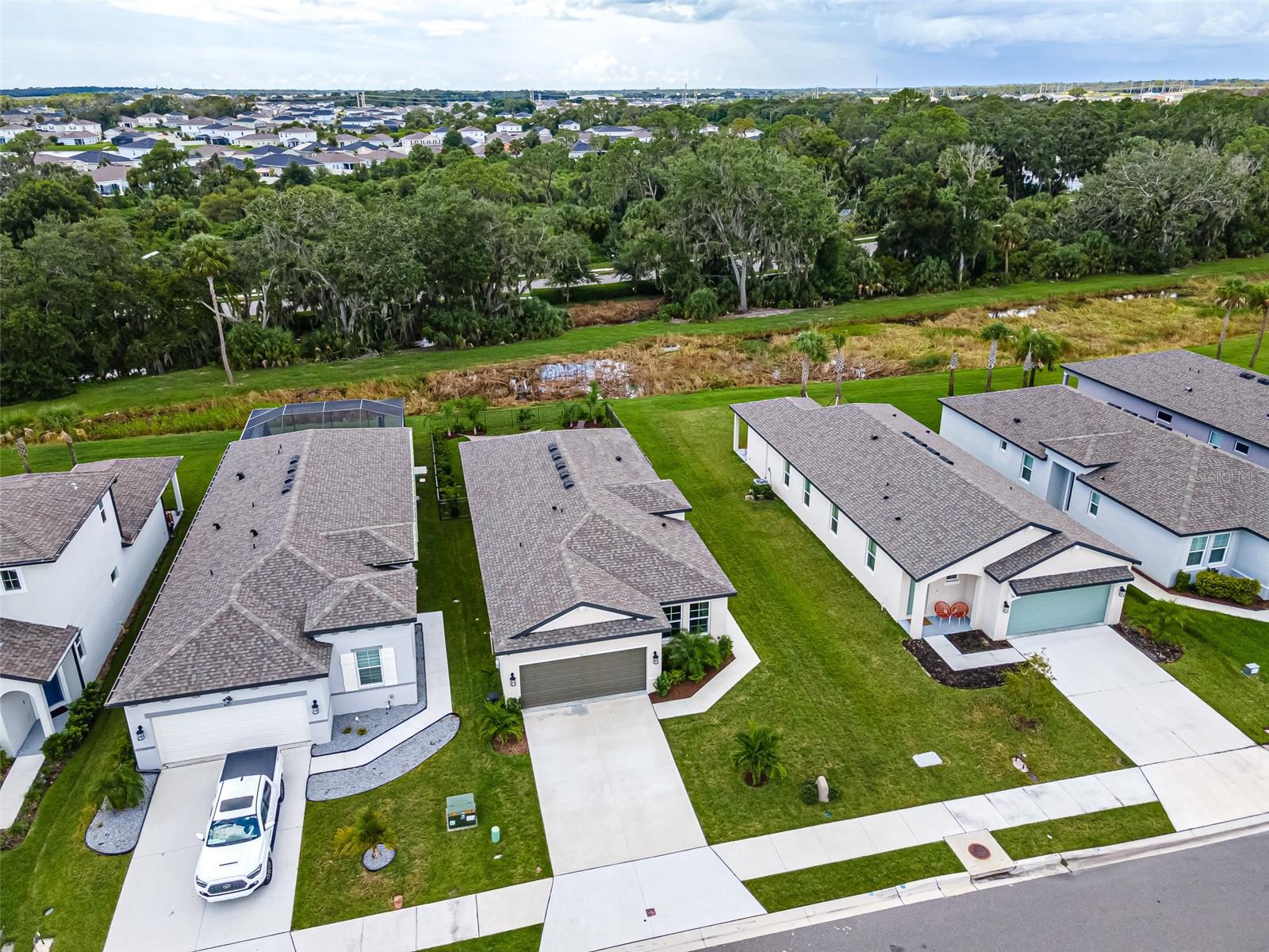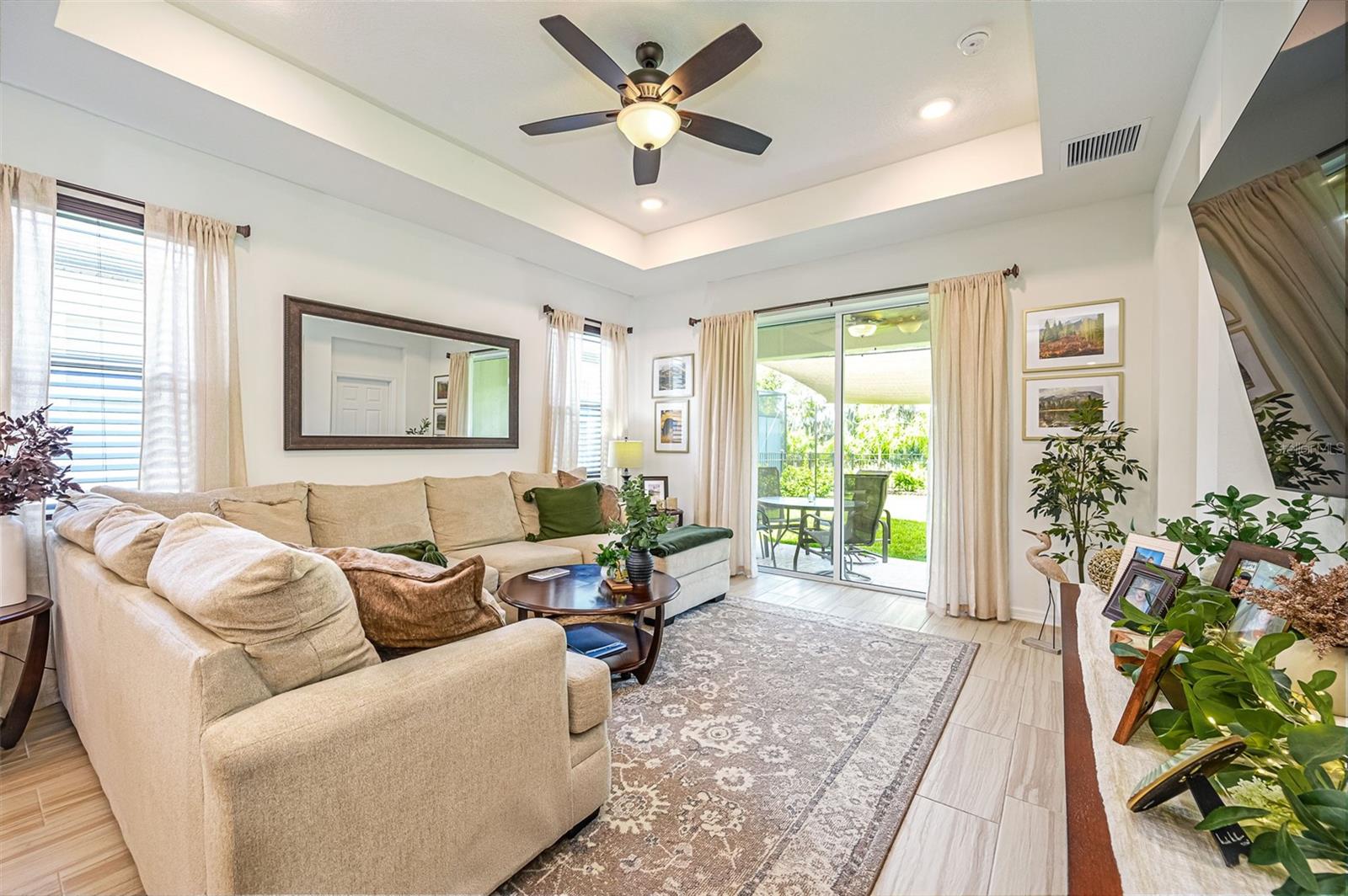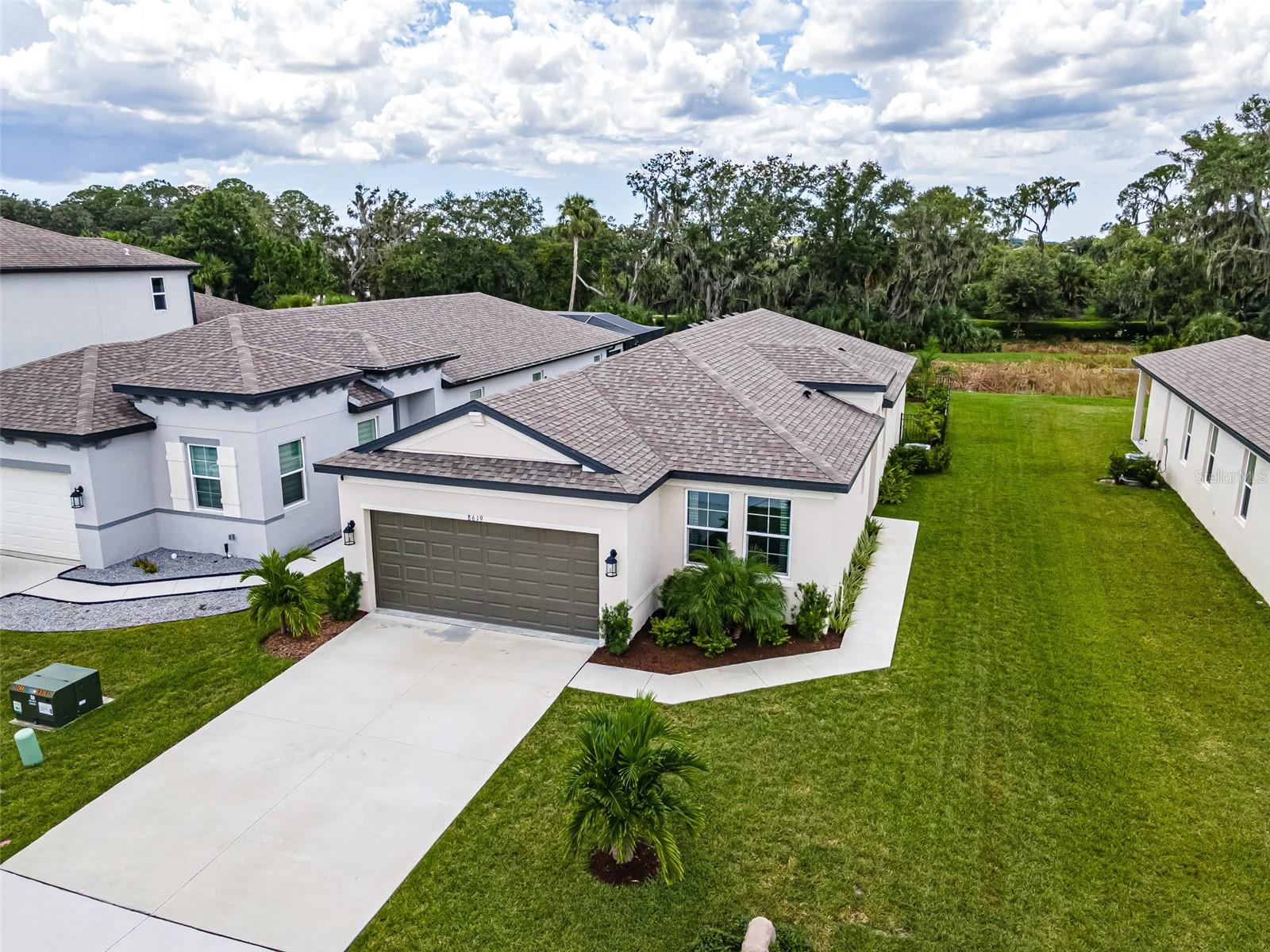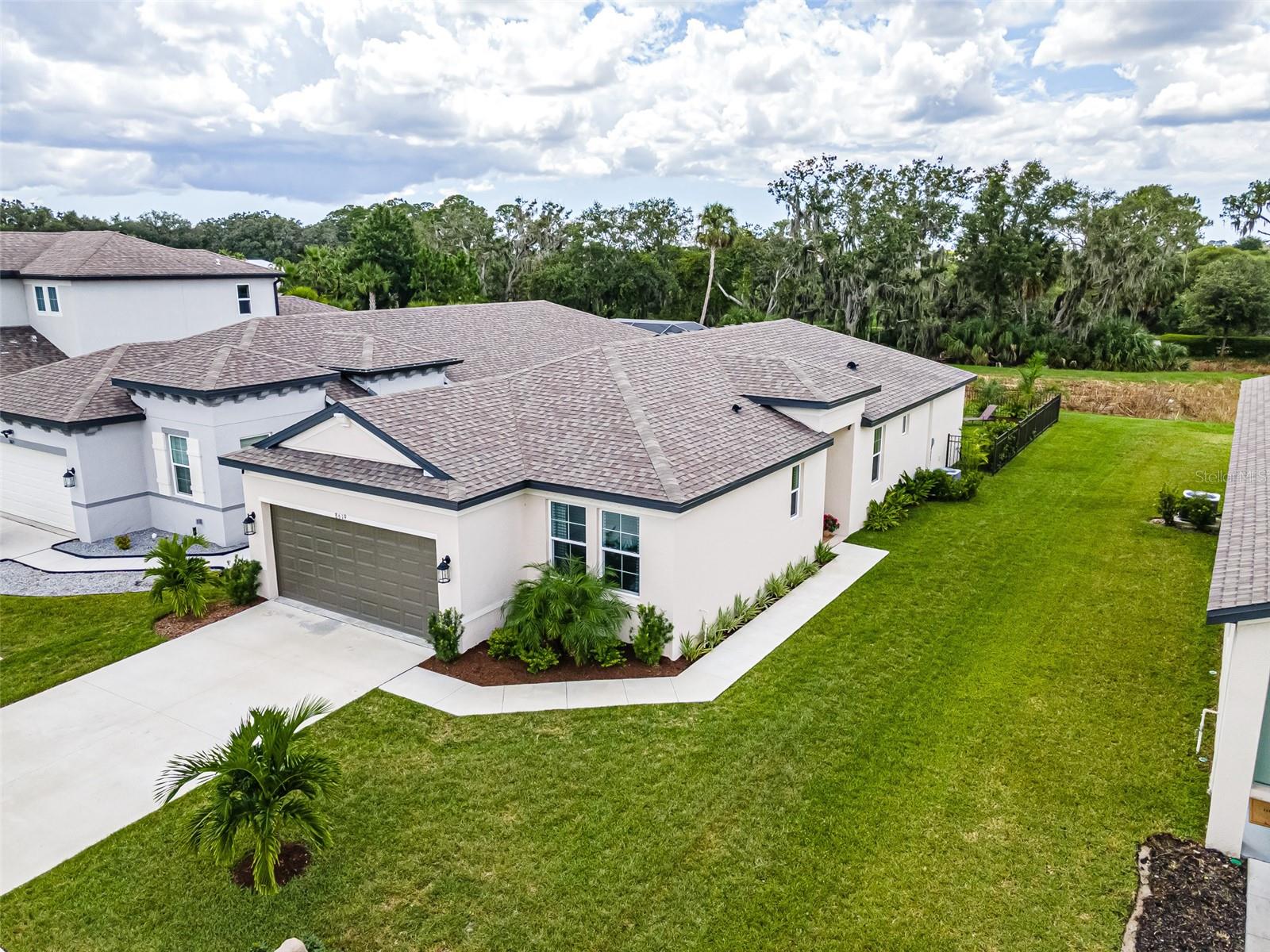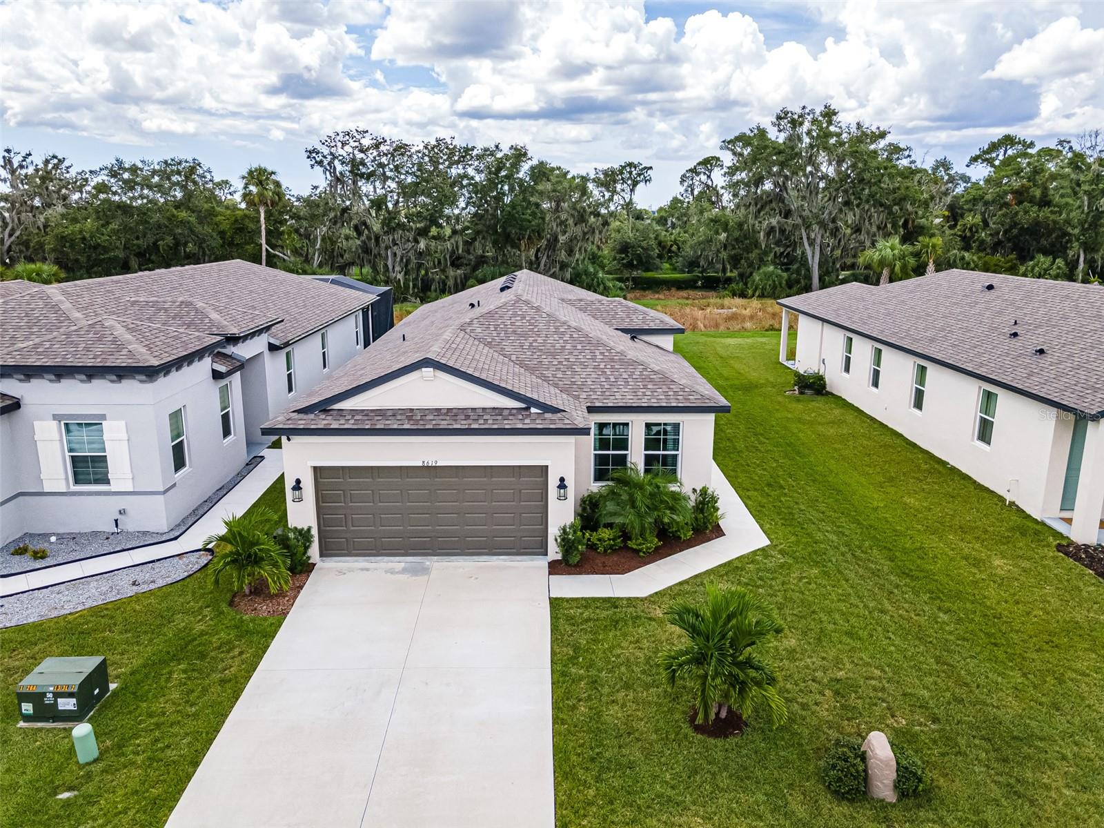 Welcome to this stunning move in ready energy efficient M/I home in the highly sought after gated enclave within Summerwoods. This impressive 3 BR/2BA home offers just over 1512 sq ft of meticulously designed living space with peaceful conservation views offering a serene outdoor escape. Why wait for new construction delays or be added to builders' waitlists, this gated section of Summerwoods consists of just over 142 homes and all construction is completed. As you enter the main foyer you’re greeted with upgraded gorgeous tile plank flooring throughout and a beautiful kitchen that is the centerpiece of this home. The modern kitchen is a chef’s delight and is perfectly designed for entertaining in mind with a large quartz island, beautiful backsplash to compliment the elegant quartz countertops, stainless steel appliances, 42” cabinets all while overlooking the dining space and great room. The great room has been fitted with beautiful coffered tray ceilings, recessed lighting with an upgraded dimmer switch and sliding glass doors that opens up to a peaceful and private outdoor living space. The large primary suite just off the great room has an en suite bathroom with his and her sinks, walk-in shower, separate toilet room, spacious walk-in closet and beautiful tray ceilings. The property features upgraded 2” blinds and 3 1/4” baseboards throughout, beautiful drapery, timeless light fixtures, ceiling fans and a well appointed laundry room with cabinets for extra storage. Enjoy seamless indoor-outdoor living with a fenced in backyard, newly installed shade sail awning, beautiful new landscaping in the front and back of the home and an upgraded French drain system. The garage has been equipped with a new epoxy floor, utility sink for convenience, hurricane shutters for extra peace of mind and an added overhead storage above the garage, perfect for storing holiday decor. Situated conveniently to I-75 and 301, this property offers quick access to white sandy beaches and nearby cities such as Bradenton, Sarasota, Tampa, and St Petersburg. The surrounding area of Parrish continues to grow with new dining options, shopping centers, excellent schools, and a future HCA 200-bed hospital with a new Publix shopping center. The community of Summerwoods features a resort-style pool, splash pad, dog park, pavilion and shaded nature and walking trails perfect for daily exercise. Don’t miss this opportunity to make this incredible Summerwoods home yours today.