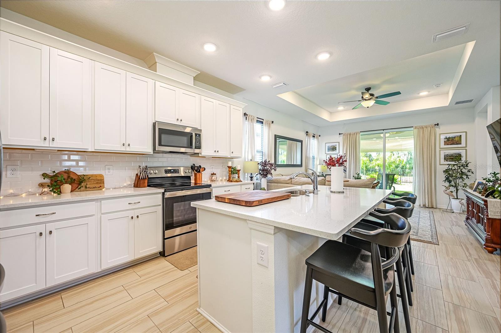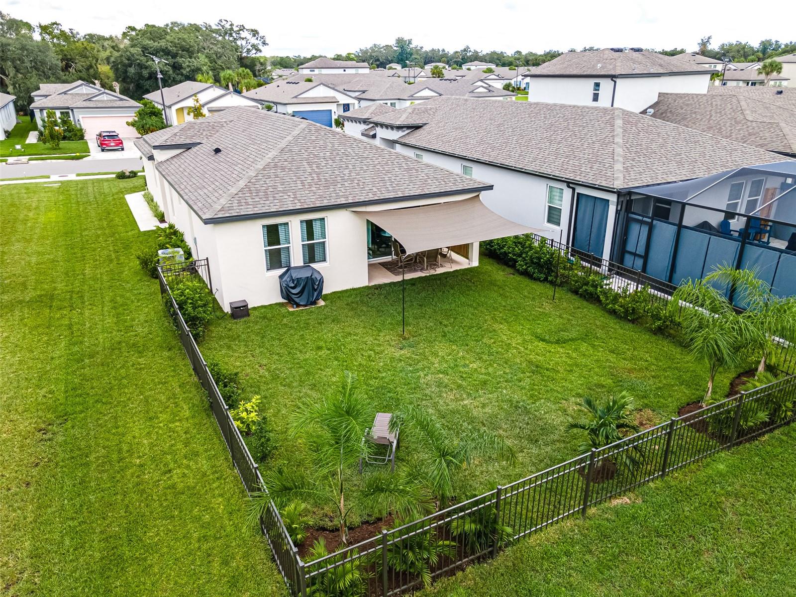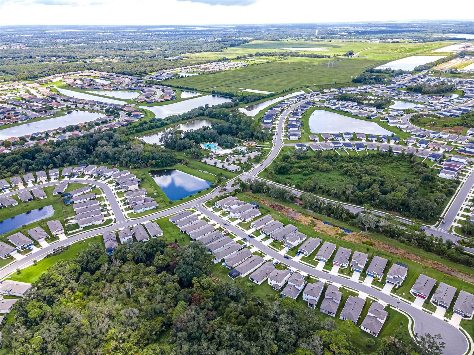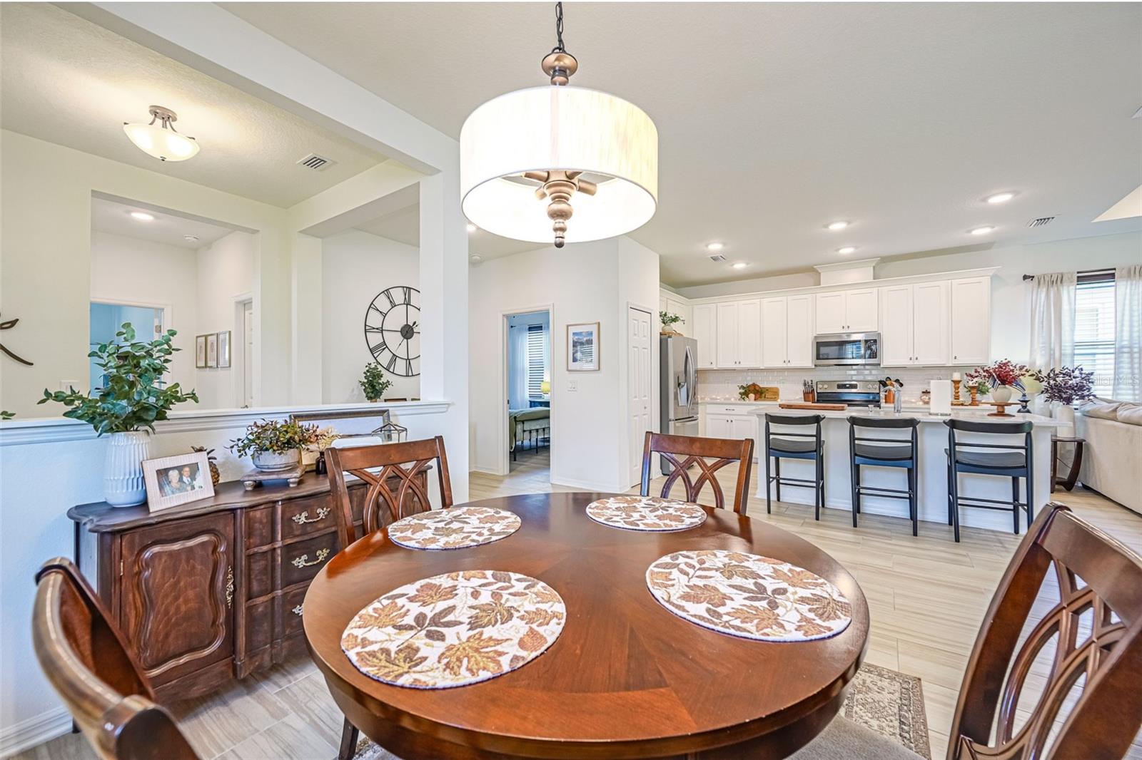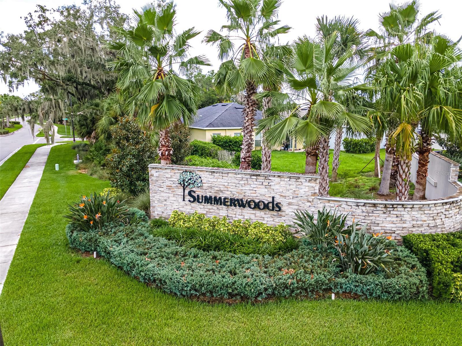 Welcome to this stunning move in ready energy efficient M/I home in the highly sought after gated enclave within Summerwoods. This impressive 3 BR/2BA home offers just over 1512 sq ft of meticulously designed living space with peaceful conservation views offering a serene outdoor escape. Why wait for new construction delays or be added to builders' waitlists, this gated section of Summerwoods consists of just over 142 homes and all construction is completed. As you enter the main foyer you’re greeted with upgraded gorgeous tile plank flooring throughout and a beautiful kitchen that is the centerpiece of this home. The modern kitchen is a chef’s delight and is perfectly designed for entertaining in mind with a large quartz island, beautiful backsplash to compliment the elegant quartz countertops, stainless steel appliances, 42” cabinets all while overlooking the dining space and great room. The great room has been fitted with beautiful coffered tray ceilings, recessed lighting with an upgraded dimmer switch and sliding glass doors that opens up to a peaceful and private outdoor living space. The large primary suite just off the great room has an en suite bathroom with his and her sinks, walk-in shower, separate toilet room, spacious walk-in closet and beautiful tray ceilings. The property features upgraded 2” blinds and 3 1/4” baseboards throughout, beautiful drapery, timeless light fixtures, ceiling fans and a well appointed laundry room with cabinets for extra storage. Enjoy seamless indoor-outdoor living with a fenced in backyard, newly installed shade sail awning, beautiful new landscaping in the front and back of the home and an upgraded French drain system. The garage has been equipped with a new epoxy floor, utility sink for convenience, hurricane shutters for extra peace of mind and an added overhead storage above the garage, perfect for storing holiday decor. Situated conveniently to I-75 and 301, this property offers quick access to white sandy beaches and nearby cities such as Bradenton, Sarasota, Tampa, and St Petersburg. The surrounding area of Parrish continues to grow with new dining options, shopping centers, excellent schools, and a future HCA 200-bed hospital with a new Publix shopping center. The community of Summerwoods features a resort-style pool, splash pad, dog park, pavilion and shaded nature and walking trails perfect for daily exercise. Don’t miss this opportunity to make this incredible Summerwoods home yours today.