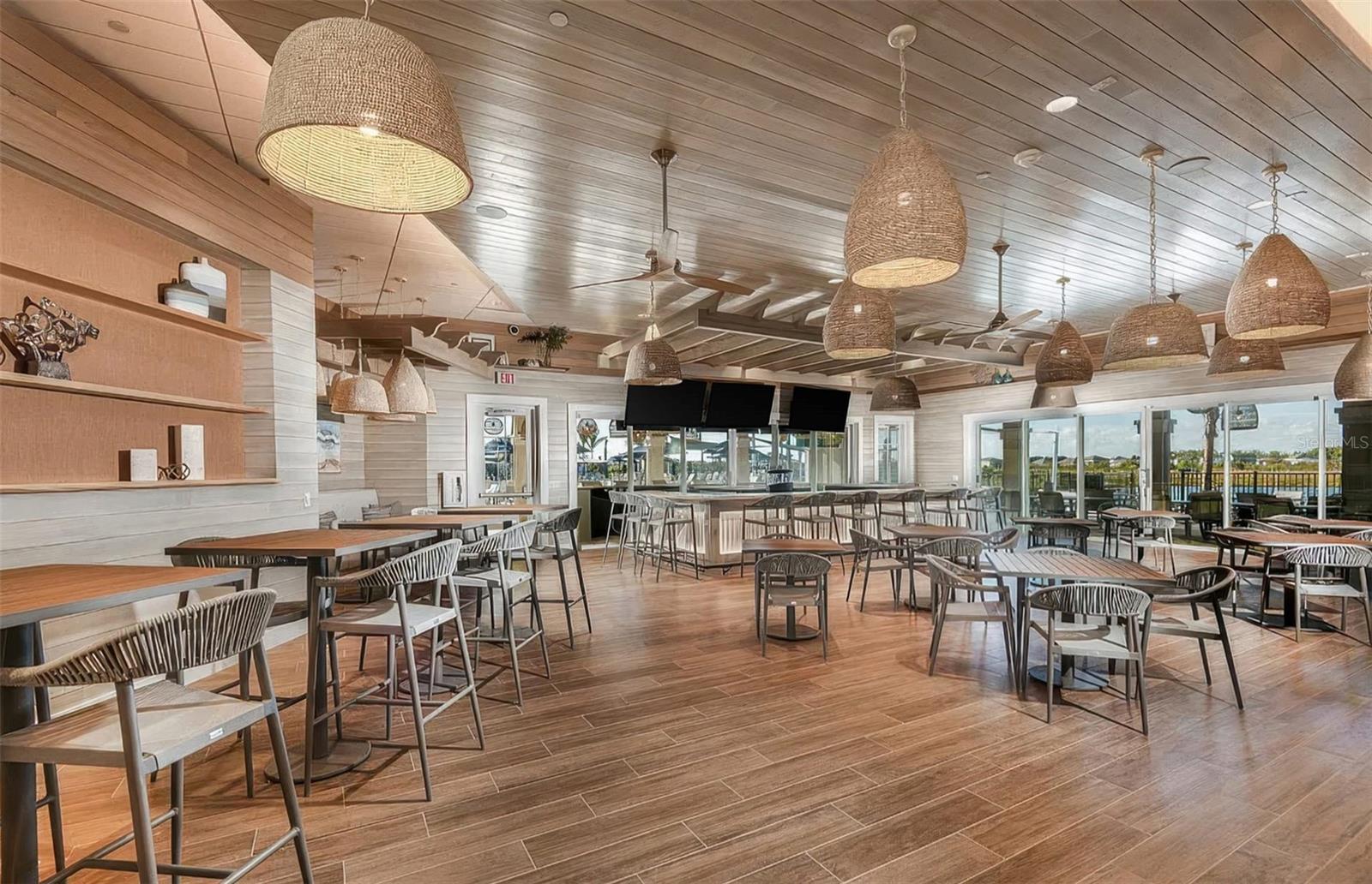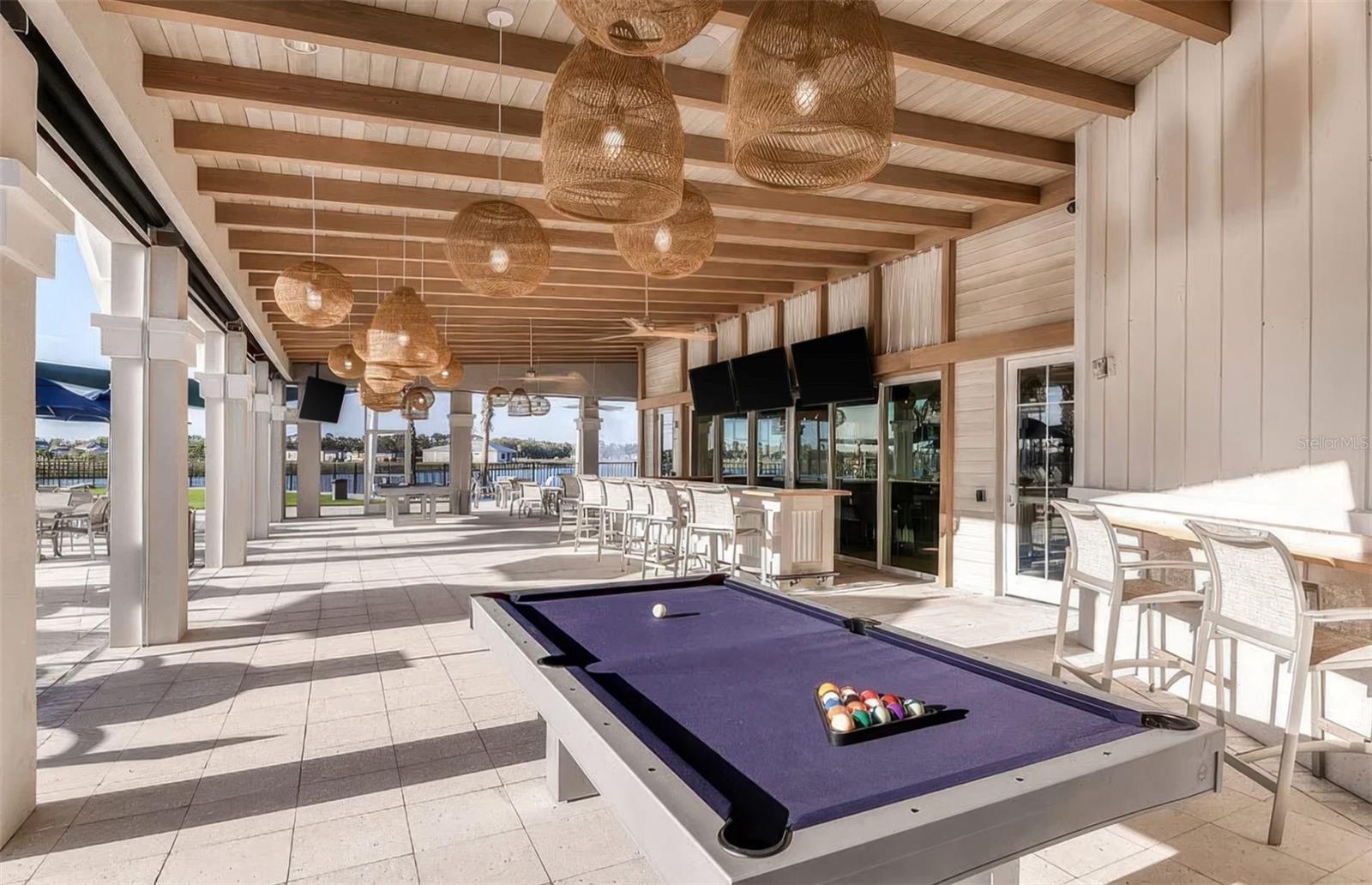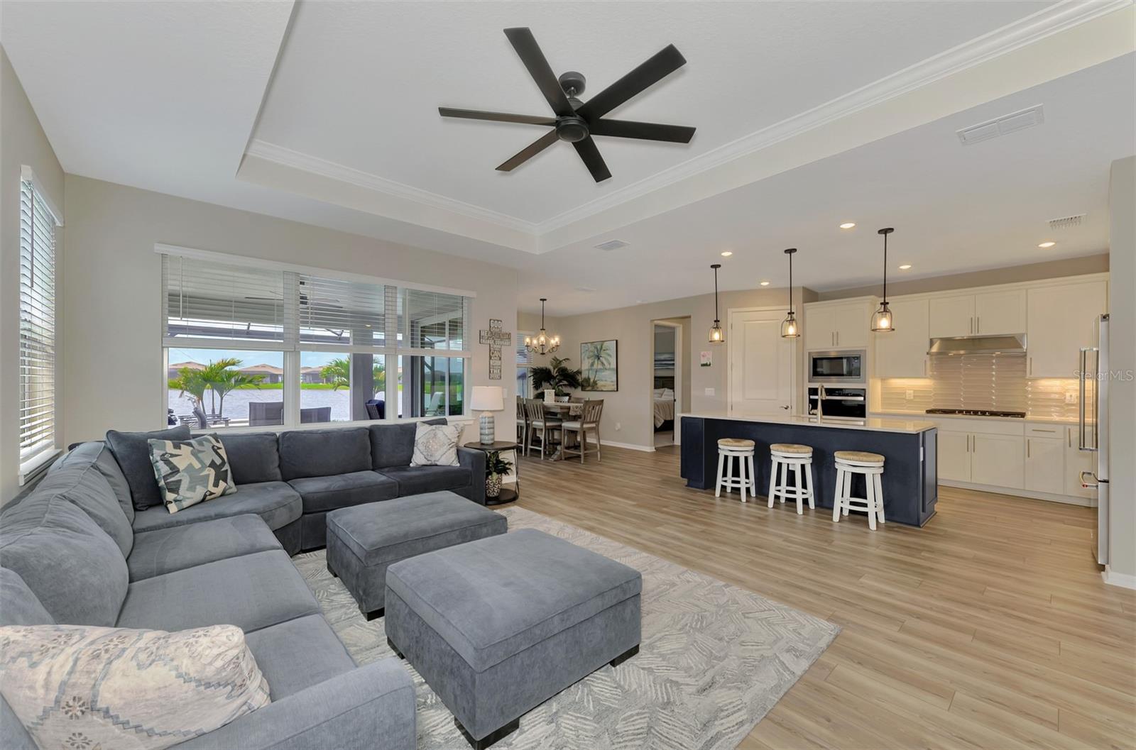 Enjoy resort style living in the highly sought after 55+ Del Webb at Bay View community. This 2024 built popular Mystique floor is situated on a premium water lot with sweeping lake views and offers stunning curb appeal. Exterior upgrades include tropical landscaping, flower bed curbing with ornamental rock garden around the entire perimeter, and industrial quality low voltage landscaping lighting. The driveway was also widened on each side. The oversized lanai off the back offers ample space to relax and unwind, and the current owner installed an after-market custom pool. The heated saltwater pool includes a pebble tec interior, beautiful decorative pavers, and a clear view screen to enjoy an unobstructed view of the water. The home was constructed with HURRICANE IMPACT GLASS and DOORS giving you peace of mind, and the floor plan was modified to include 3 bedrooms plus a den/office. Inside you will find a lavishly upgraded interior as you step through the glass front door. A welcoming foyer is adorned with luxury vinyl plank floors that run throughout the main living spaces, and you will appreciate other upgrades such as 8-foot doors, tray ceilings, and designer light fixtures and fans that can be found throughout. The kitchen was modified at the time of construction to the built-in gourmet package and features upgraded cabinetry with dovetail constructed drawers, soft close doors and drawers throughout, built-in stainless steel appliances with upgraded refrigerator, decorative backsplash with quartz countertops, a large single bowl granite sink, and under cabinet lighting. There is also a generous sized pantry for extra storage. The large living room is flooded with light and enjoys lake views from every angle, and the dining area is the perfect place to throw a lavish dinner party or enjoy a quiet low-key meal at home. The primary suite is sure to impress with a custom built-in closet, and an en suite spa inspired bathroom with large walk-in shower and dual sink vanity with extra storage. Enjoy the lake view right from the comfort of your bed on those lazy mornings. Back at the front of the house just off the foyer, you will find a light filled guest bedroom and a second full bathroom that was upgraded with tile to the ceiling and beautiful quartz countertops. On the opposite side of the foyer, you will find the third bedroom making each bedroom in the home absolutely private. In addition to the 3 bedrooms there is a den/office with double door entry that has a built-in desk accented with under cabinet lighting that was custom designed and installed. There is a large laundry room with extra built-ins with folding station and a luxury washer and dryer package. The garage was finished with an epoxy floor and tons of built-in shelving for staying organized, and there is even a 50 AMP generator plug hook up for a back feed generator should you need it. Enjoy world class amenities that include the 22,562 sf Driftwood Clubhouse, a heated resort style pool, state of the art fitness center, tennis and pickleball courts, bocce ball, event lawn and amphitheater, dog park, fire pit, community garden, demo kitchen and craft room, and tons of walking paths. The community includes a full-time lifestyle director and a guard gated entry. With the onsite restaurant The Sailfish Bar and Grille, you will feel like you are always on vacation. Enjoy maintenance free living with lawn maintenance included in your HOA fee as well as cable and internet.