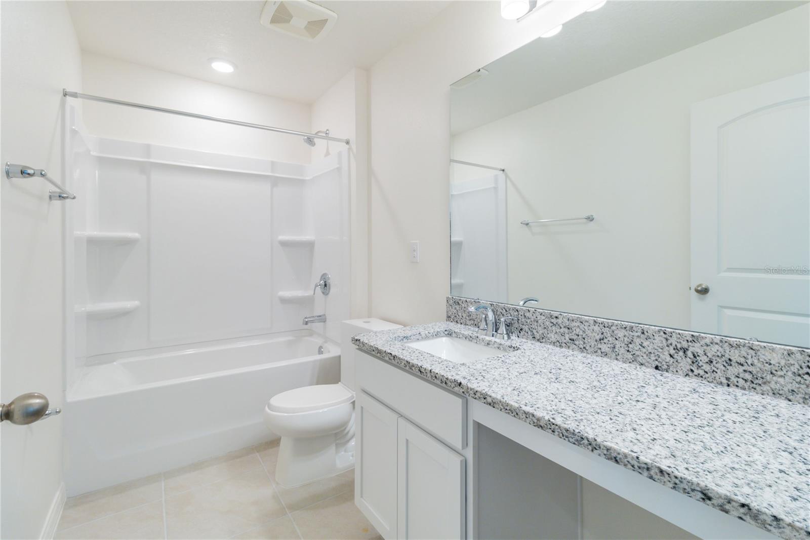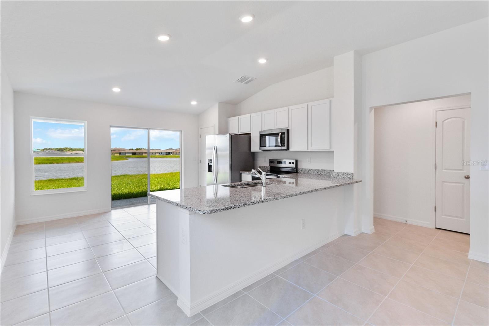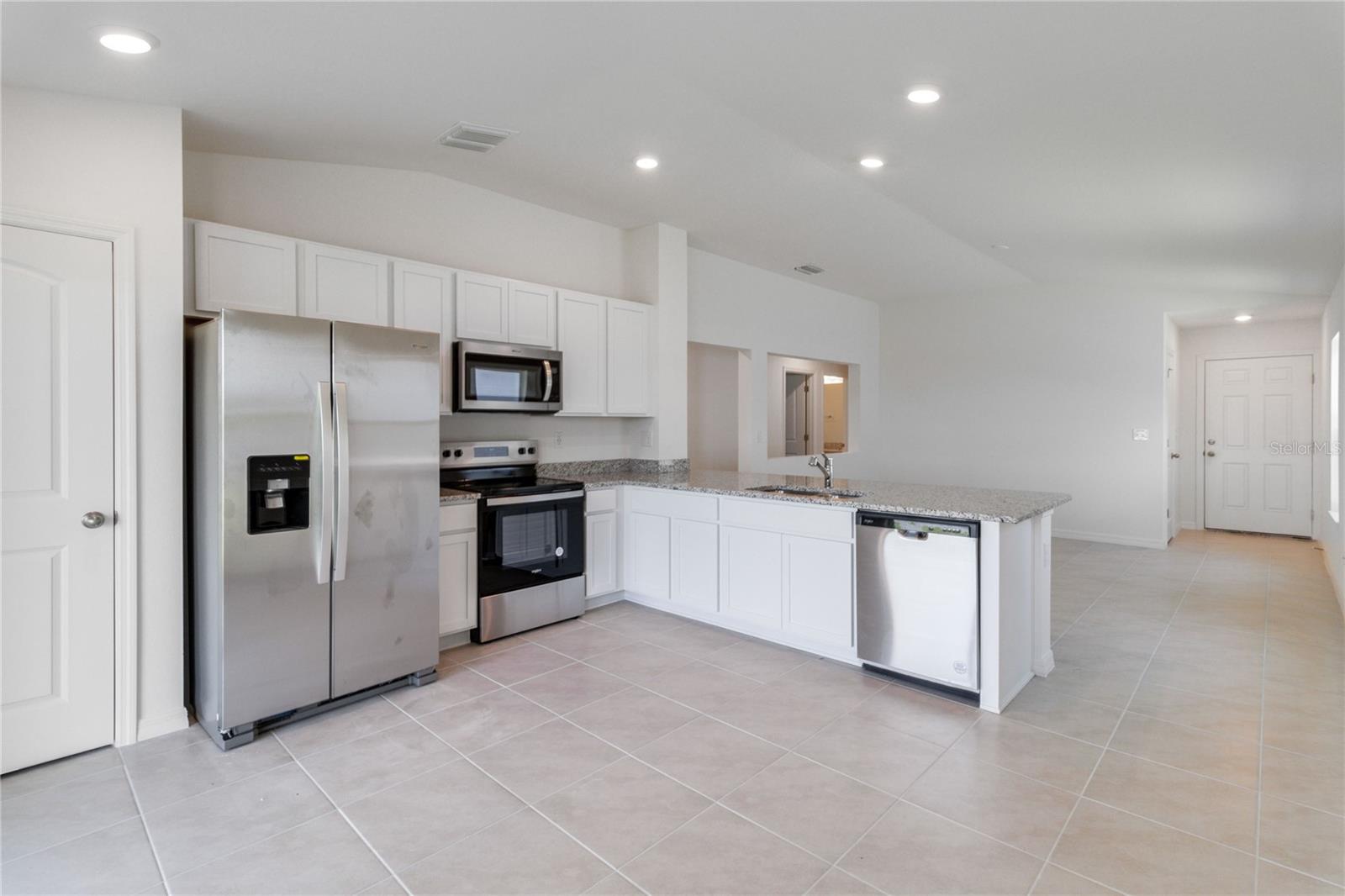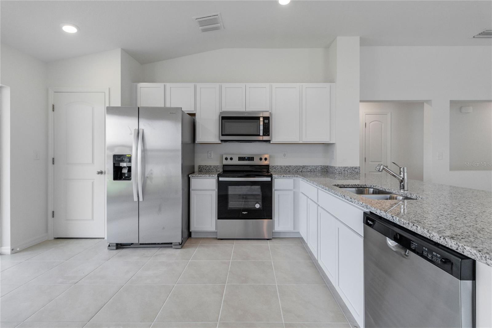 Under Construction. : You are sure to fall in love with this delightful one-story home with a covered front porch. The home features an open floor plan with tile flooring throughout the living and wet areas. Off the entry are the designated laundry room, two secondary bedrooms, and a full bathroom. The modern upgraded kitchen features 36-in. upper cabinets, a walk-in pantry, granite countertops in Bengal white, and a Whirlpool® appliance package; all leading out to a covered patio, perfect for grilling. Moving towards the rear of the home is the primary bedroom consists of a large walk-in closet and adjacent bath with a dual sink vanity featuring granite countertops, and walk-in shower with tile surround.