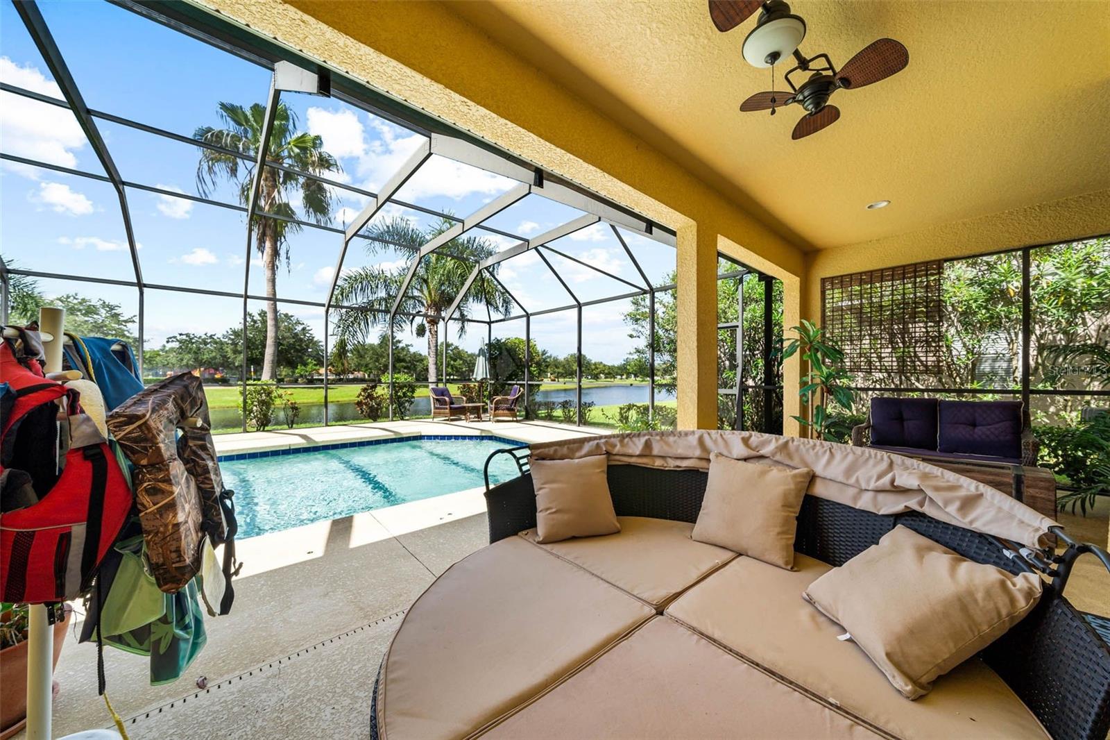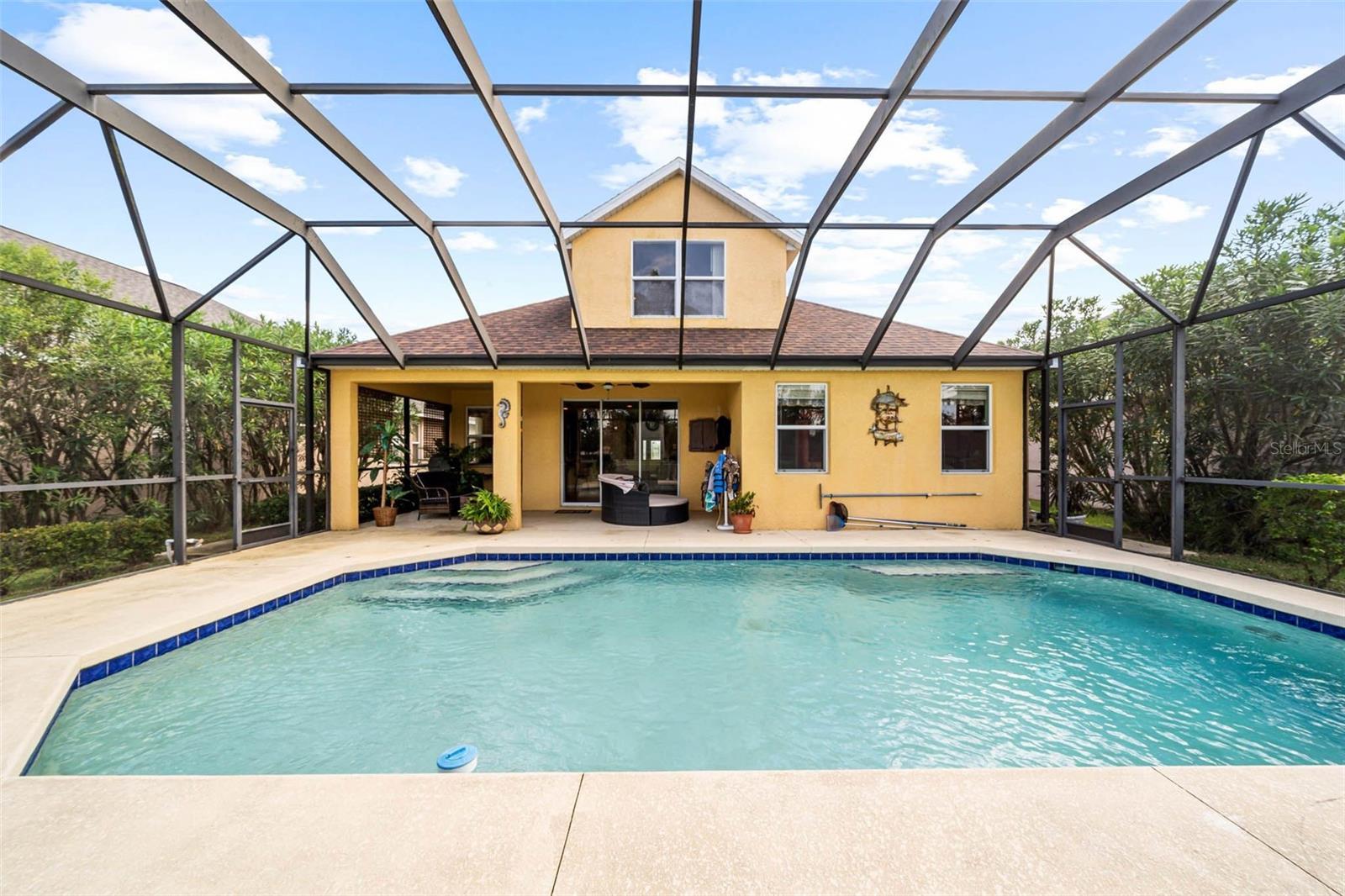 Motivated Seller! No hurricane damage from Helene or Milton. Discover your Dream Home in the remarkable River Plantation. Step into this magnificent two-story home that surpasses all your desires! Featuring 4 expansive bedrooms and 2.5 opulent bathrooms, this property with a sizable in-ground pool spans over 3,100 Sq. Ft., meticulously designed to meet all your needs. Experience serenity at its finest with evenings spent watching sunsets by the pool, overlooking the serene pond. The home includes a family room, living room, separate dining room, a bar with a wine refrigerator, a spacious kitchen, loft, bonus/theatre room, and the main bedroom on the ground floor. Tailored for both daily comfort and grand entertaining, the primary living spaces are perfect for family events, weekend soirees, or tranquil relaxation. The eat-in kitchen flows into a screened pool area, merging indoor comfort with outdoor leisure. The well-kept backyard features a private pool for the enjoyment and entertainment of family and friends. The upper level houses a flexible loft area, ideal for a secondary family room, study space, or any purpose that fits your lifestyle. Additional amenities include an expansive garage, under-cabinet kitchen lighting, a trash compactor, and solar-powered water heater and attic fan. The picturesque community offers a playground, communal pool, tennis courts, walking trails, and a basketball court. Seize the opportunity to claim this dream home — arrange your viewing now!