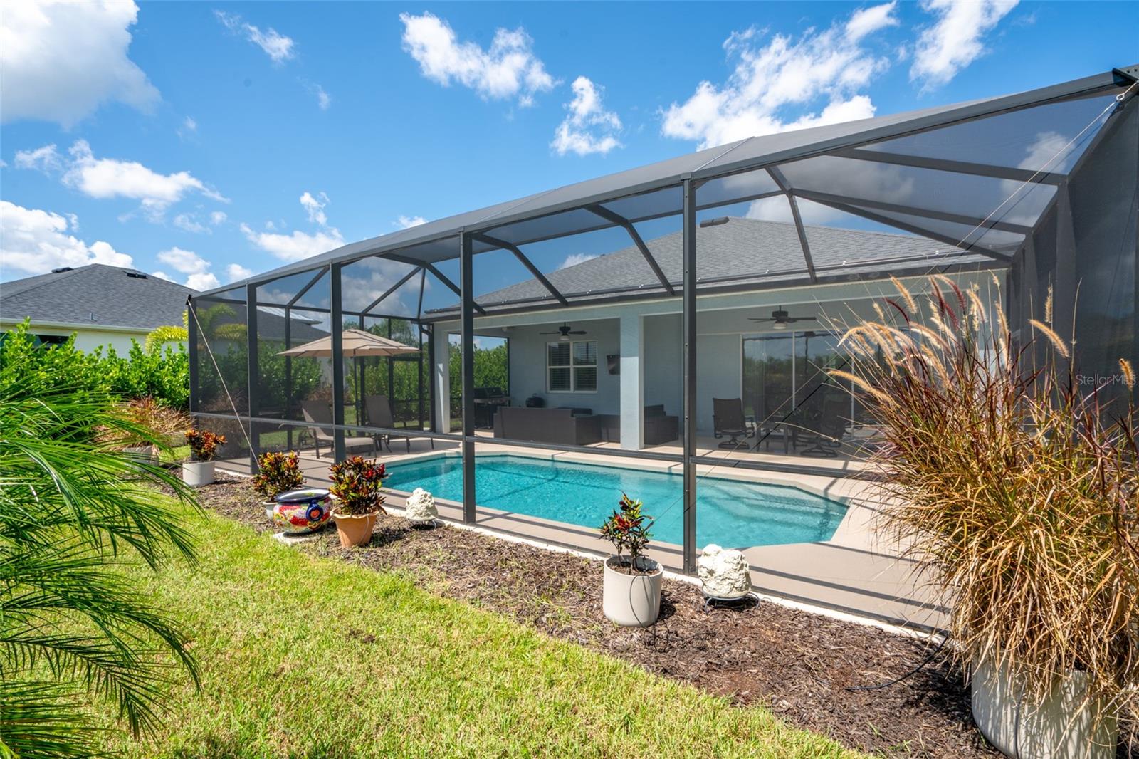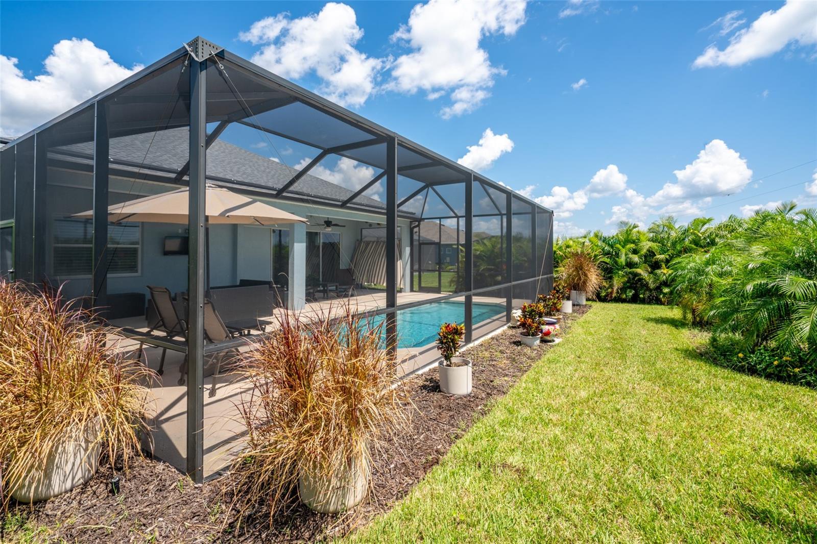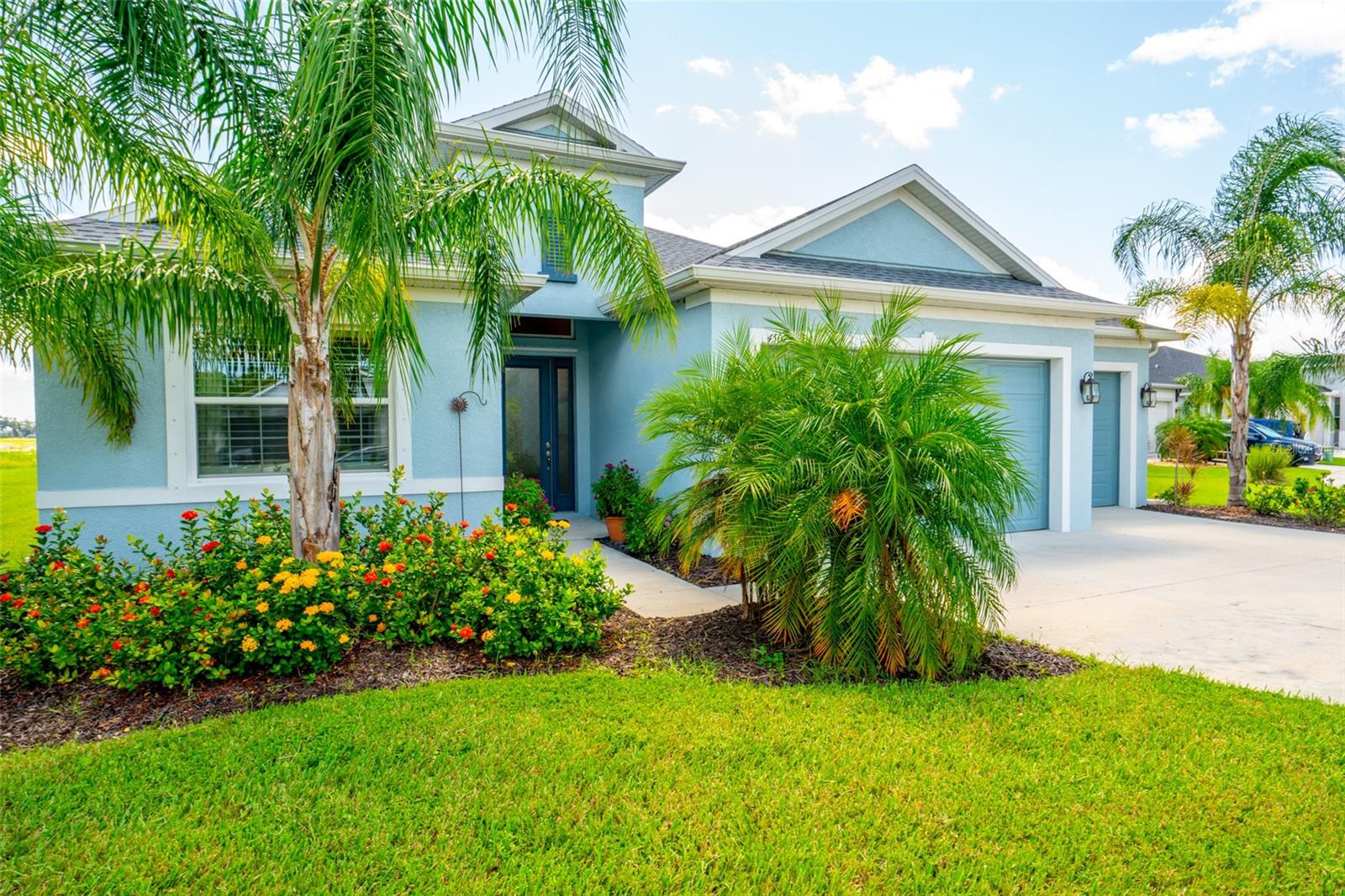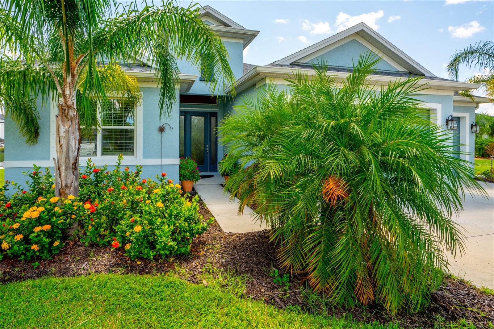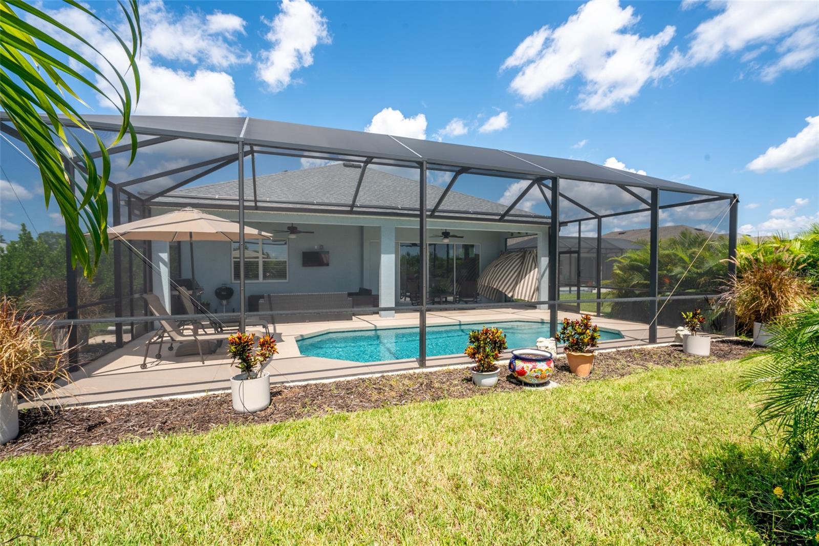 THIS STUNNING POOL HOME HAS IT ALL! Loaded with many upgrades & exquisite attention to detail throughout this home are sure to impress even the pickiest buyers. You will fall in love with the home as you enter and admire the long foyer complete with LUXURY VINYL flooring leading into great room and open kitchen. The high ceilings, open space and triple sliding glass doors allow maximum space value and natural light. The GOURMET KITCHEN offers many upgrades such as Quartz counter tops, Stainless Steel appliances, gas cooktop, custom hood vent, built-in microwave & oven, glass tile backsplash, and full dry bar cabinetry. Breakfast bar with decorative pendant lights add a touch of elegance. Spacious living room has triple sliding glass door with Hunter Douglas motorized Luminette. Walk out to the extended covered lanai and admire the gleaming SALT WATER POOL (heated with solar panels) that provides the perfect setting. No expense was spared on the mature tropical landscaped yard methodically designed to provide maximum amount privacy & relaxation. The Primary bedroom/bath is phenomenal with great lighting, built-in custom closets, luxury double shower with upgraded fixtures, tile extended to ceiling for a finished look & dual sinks. Plantation shutters grace all the windows throughout the home. All light fixtures and ceiling fans are top notch & modern. This home sits on larger lot (.33 acres) with long driveway on cul-de-sac and is beautifully landscaped for exceptional curb appeal. Parrish is a growing area offering excellent schools, shopping & not far from some of the nicest beaches in FL. Community offers resort style pool, playground, dog park & basketball courts. THIS GEM IS A MUST SEE AND TRULY MOVE-IN READY!! **NO FLOOD INSURANCE REQUIRED**