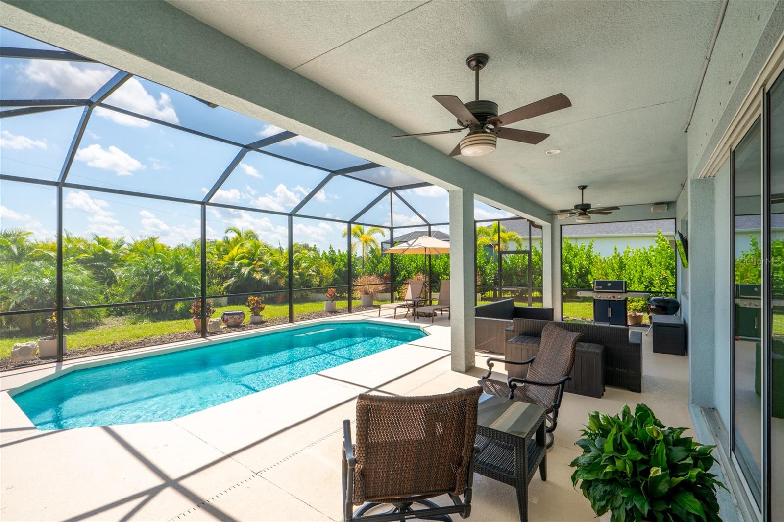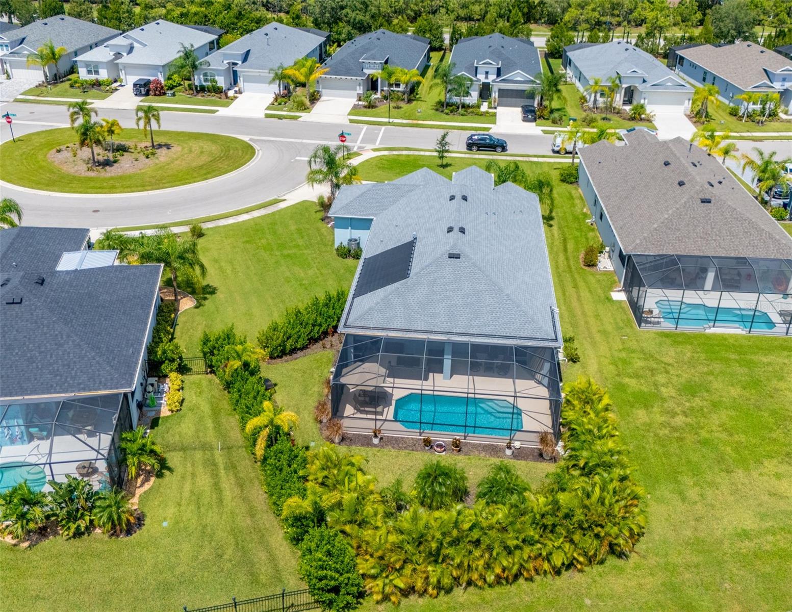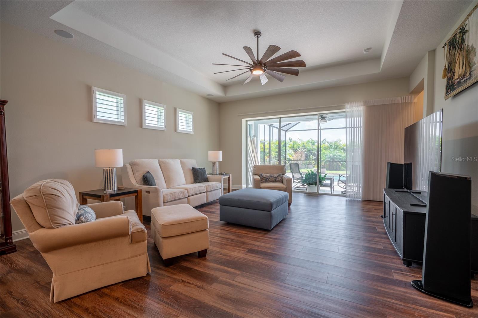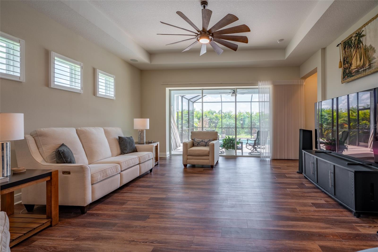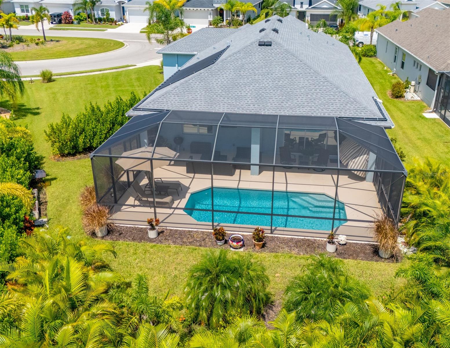 THIS STUNNING POOL HOME HAS IT ALL! Loaded with many upgrades & exquisite attention to detail throughout this home are sure to impress even the pickiest buyers. You will fall in love with the home as you enter and admire the long foyer complete with LUXURY VINYL flooring leading into great room and open kitchen. The high ceilings, open space and triple sliding glass doors allow maximum space value and natural light. The GOURMET KITCHEN offers many upgrades such as Quartz counter tops, Stainless Steel appliances, gas cooktop, custom hood vent, built-in microwave & oven, glass tile backsplash, and full dry bar cabinetry. Breakfast bar with decorative pendant lights add a touch of elegance. Spacious living room has triple sliding glass door with Hunter Douglas motorized Luminette. Walk out to the extended covered lanai and admire the gleaming SALT WATER POOL (heated with solar panels) that provides the perfect setting. No expense was spared on the mature tropical landscaped yard methodically designed to provide maximum amount privacy & relaxation. The Primary bedroom/bath is phenomenal with great lighting, built-in custom closets, luxury double shower with upgraded fixtures, tile extended to ceiling for a finished look & dual sinks. Plantation shutters grace all the windows throughout the home. All light fixtures and ceiling fans are top notch & modern. This home sits on larger lot (.33 acres) with long driveway on cul-de-sac and is beautifully landscaped for exceptional curb appeal. Parrish is a growing area offering excellent schools, shopping & not far from some of the nicest beaches in FL. Community offers resort style pool, playground, dog park & basketball courts. THIS GEM IS A MUST SEE AND TRULY MOVE-IN READY!! **NO FLOOD INSURANCE REQUIRED**
