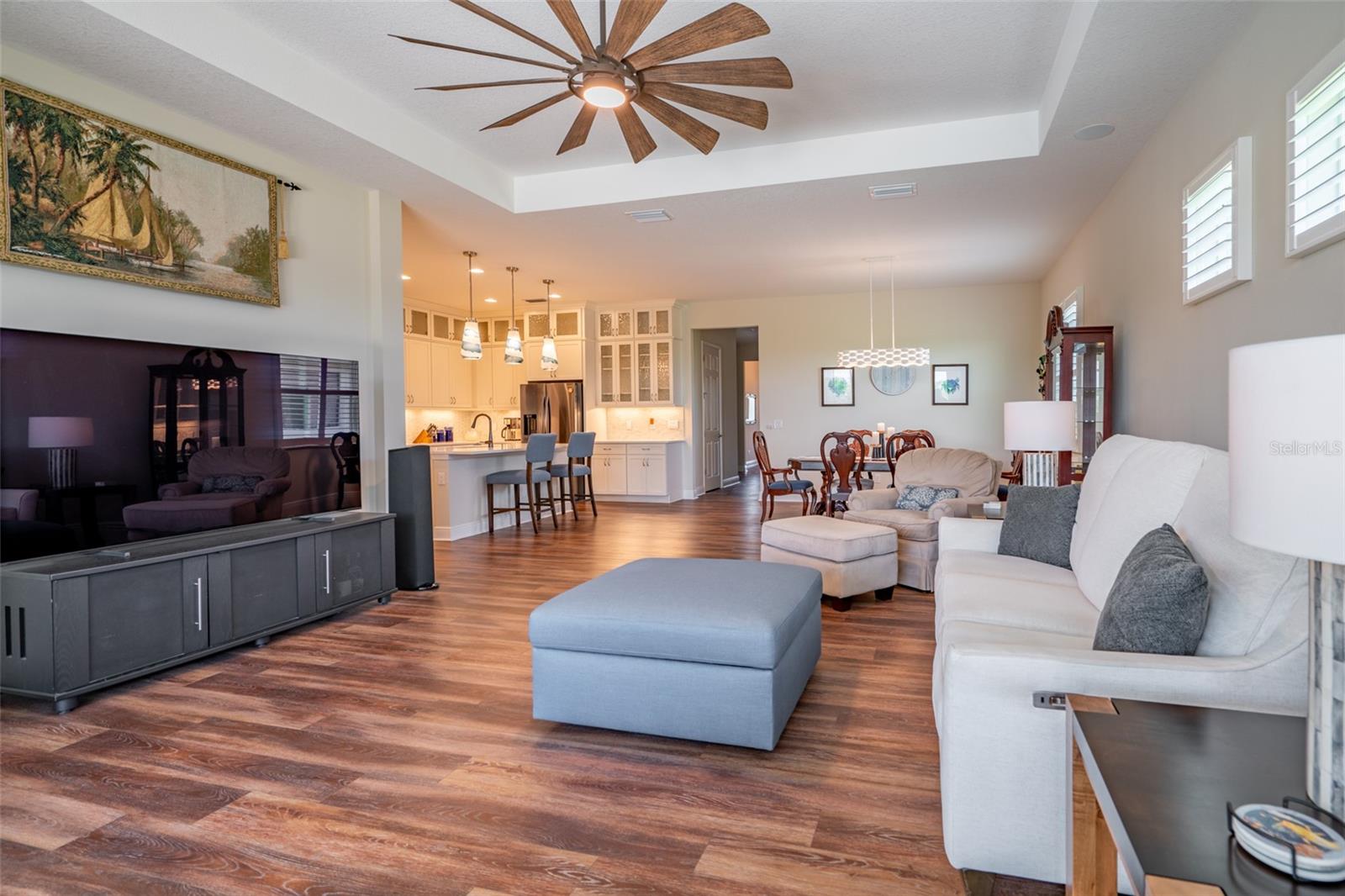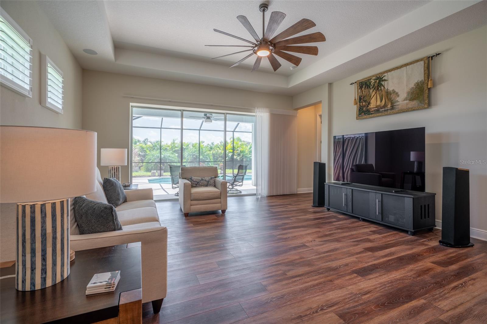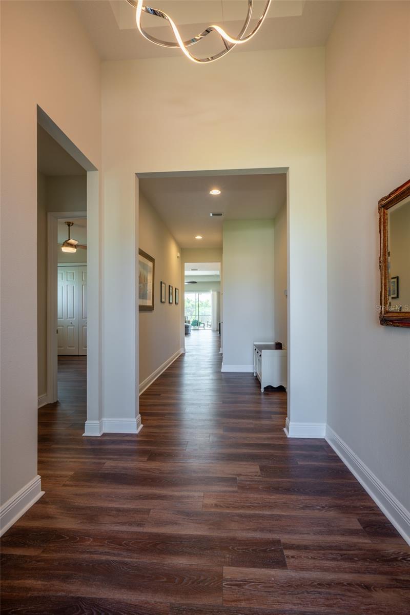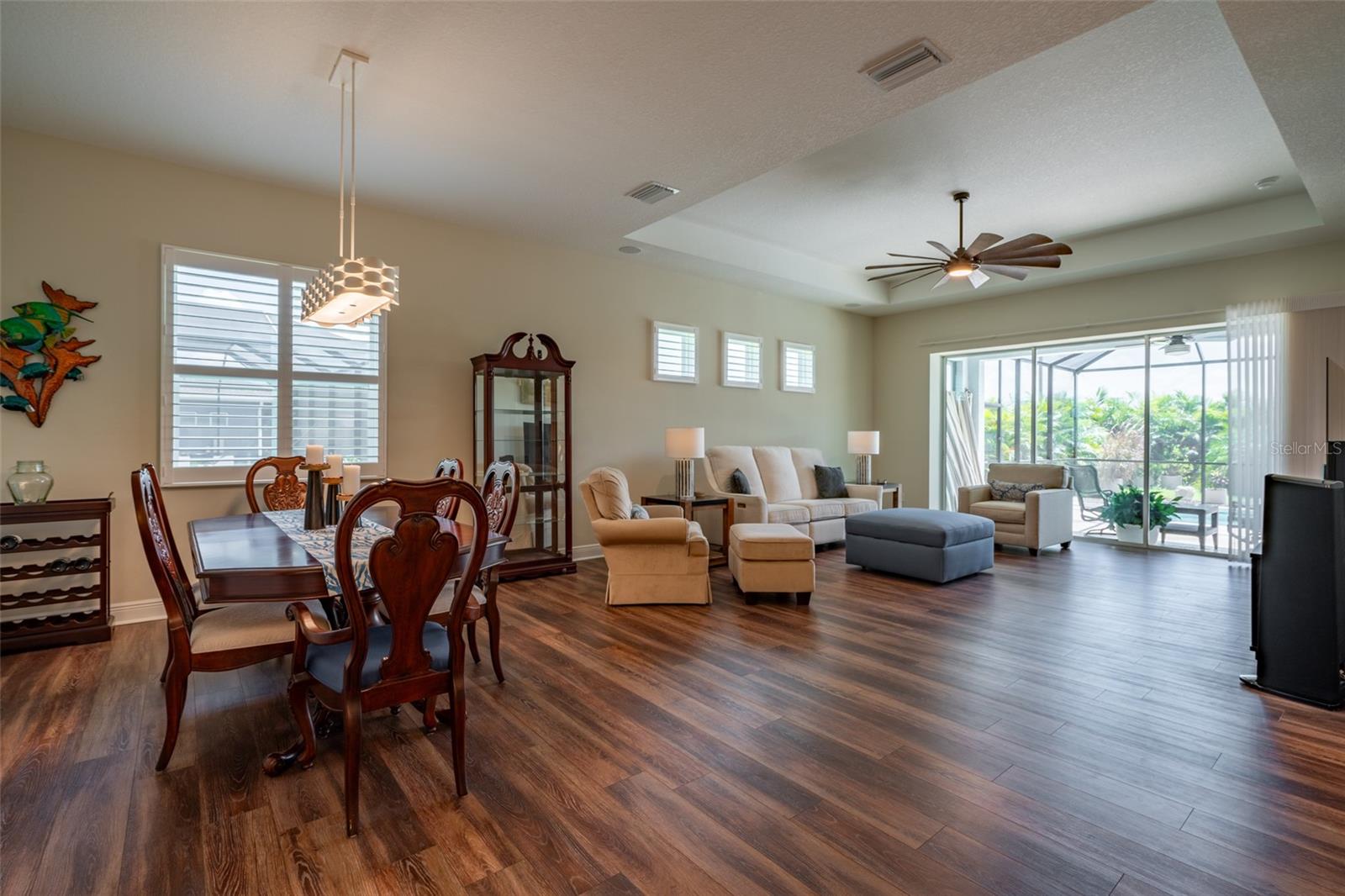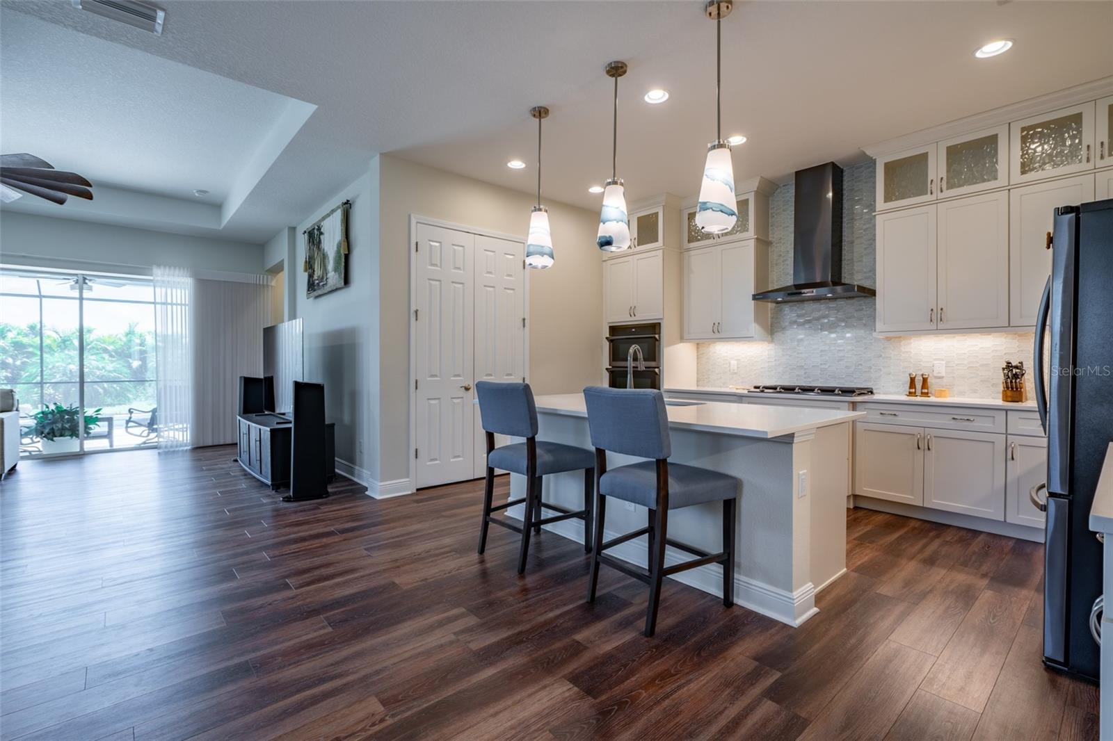 THIS STUNNING POOL HOME HAS IT ALL! Loaded with many upgrades & exquisite attention to detail throughout this home are sure to impress even the pickiest buyers. You will fall in love with the home as you enter and admire the long foyer complete with LUXURY VINYL flooring leading into great room and open kitchen. The high ceilings, open space and triple sliding glass doors allow maximum space value and natural light. The GOURMET KITCHEN offers many upgrades such as Quartz counter tops, Stainless Steel appliances, gas cooktop, custom hood vent, built-in microwave & oven, glass tile backsplash, and full dry bar cabinetry. Breakfast bar with decorative pendant lights add a touch of elegance. Spacious living room has triple sliding glass door with Hunter Douglas motorized Luminette. Walk out to the extended covered lanai and admire the gleaming SALT WATER POOL (heated with solar panels) that provides the perfect setting. No expense was spared on the mature tropical landscaped yard methodically designed to provide maximum amount privacy & relaxation. The Primary bedroom/bath is phenomenal with great lighting, built-in custom closets, luxury double shower with upgraded fixtures, tile extended to ceiling for a finished look & dual sinks. Plantation shutters grace all the windows throughout the home. All light fixtures and ceiling fans are top notch & modern. This home sits on larger lot (.33 acres) with long driveway on cul-de-sac and is beautifully landscaped for exceptional curb appeal. Parrish is a growing area offering excellent schools, shopping & not far from some of the nicest beaches in FL. Community offers resort style pool, playground, dog park & basketball courts. THIS GEM IS A MUST SEE AND TRULY MOVE-IN READY!! **NO FLOOD INSURANCE REQUIRED**