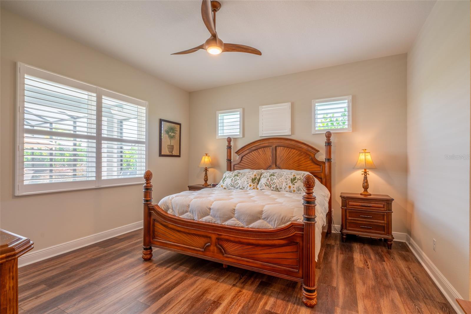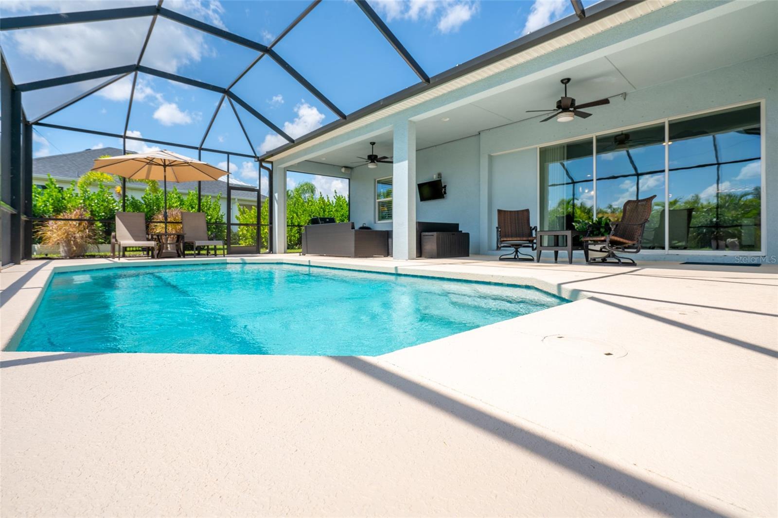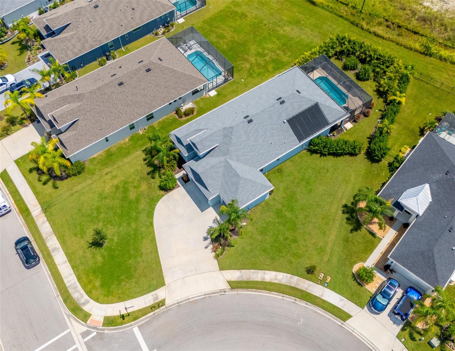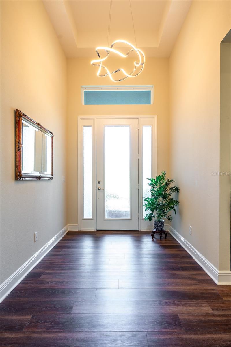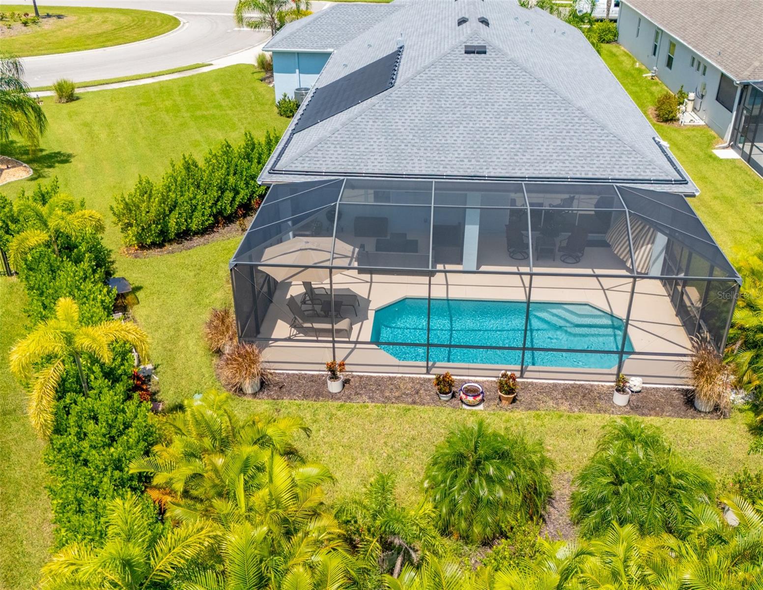 THIS STUNNING POOL HOME HAS IT ALL! Loaded with many upgrades & exquisite attention to detail throughout this home are sure to impress even the pickiest buyers. You will fall in love with the home as you enter and admire the long foyer complete with LUXURY VINYL flooring leading into great room and open kitchen. The high ceilings, open space and triple sliding glass doors allow maximum space value and natural light. The GOURMET KITCHEN offers many upgrades such as Quartz counter tops, Stainless Steel appliances, gas cooktop, custom hood vent, built-in microwave & oven, glass tile backsplash, and full dry bar cabinetry. Breakfast bar with decorative pendant lights add a touch of elegance. Spacious living room has triple sliding glass door with Hunter Douglas motorized Luminette. Walk out to the extended covered lanai and admire the gleaming SALT WATER POOL (heated with solar panels) that provides the perfect setting. No expense was spared on the mature tropical landscaped yard methodically designed to provide maximum amount privacy & relaxation. The Primary bedroom/bath is phenomenal with great lighting, built-in custom closets, luxury double shower with upgraded fixtures, tile extended to ceiling for a finished look & dual sinks. Plantation shutters grace all the windows throughout the home. All light fixtures and ceiling fans are top notch & modern. This home sits on larger lot (.33 acres) with long driveway on cul-de-sac and is beautifully landscaped for exceptional curb appeal. Parrish is a growing area offering excellent schools, shopping & not far from some of the nicest beaches in FL. Community offers resort style pool, playground, dog park & basketball courts. THIS GEM IS A MUST SEE AND TRULY MOVE-IN READY!! **NO FLOOD INSURANCE REQUIRED**