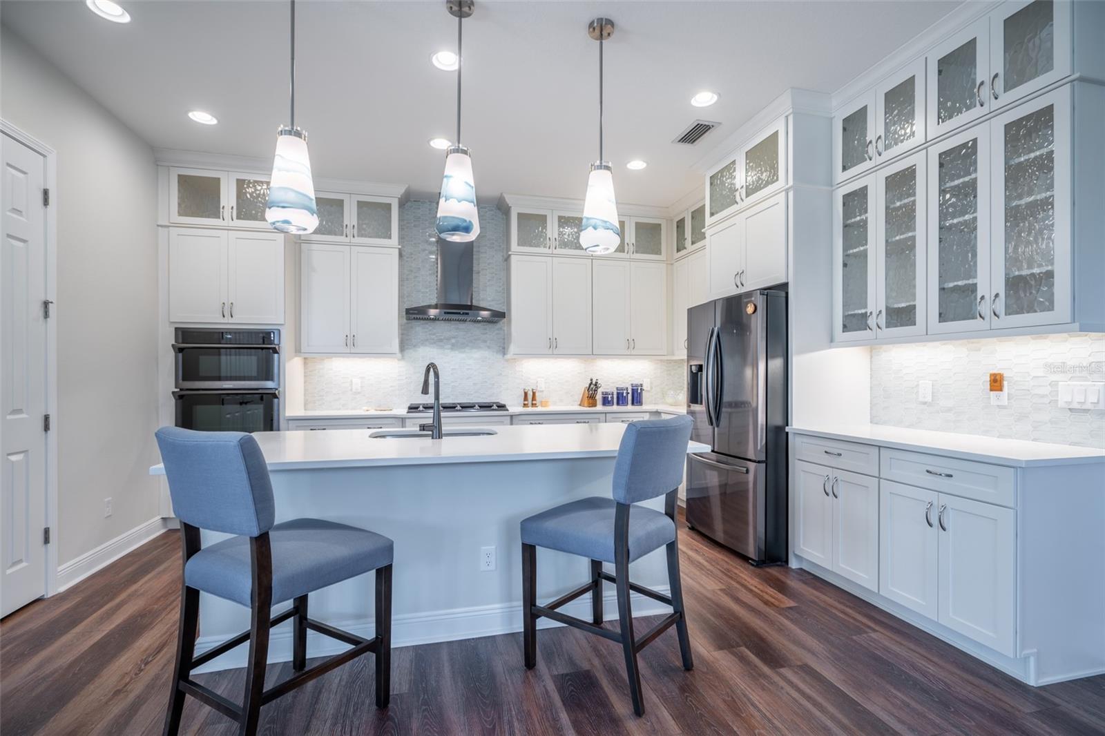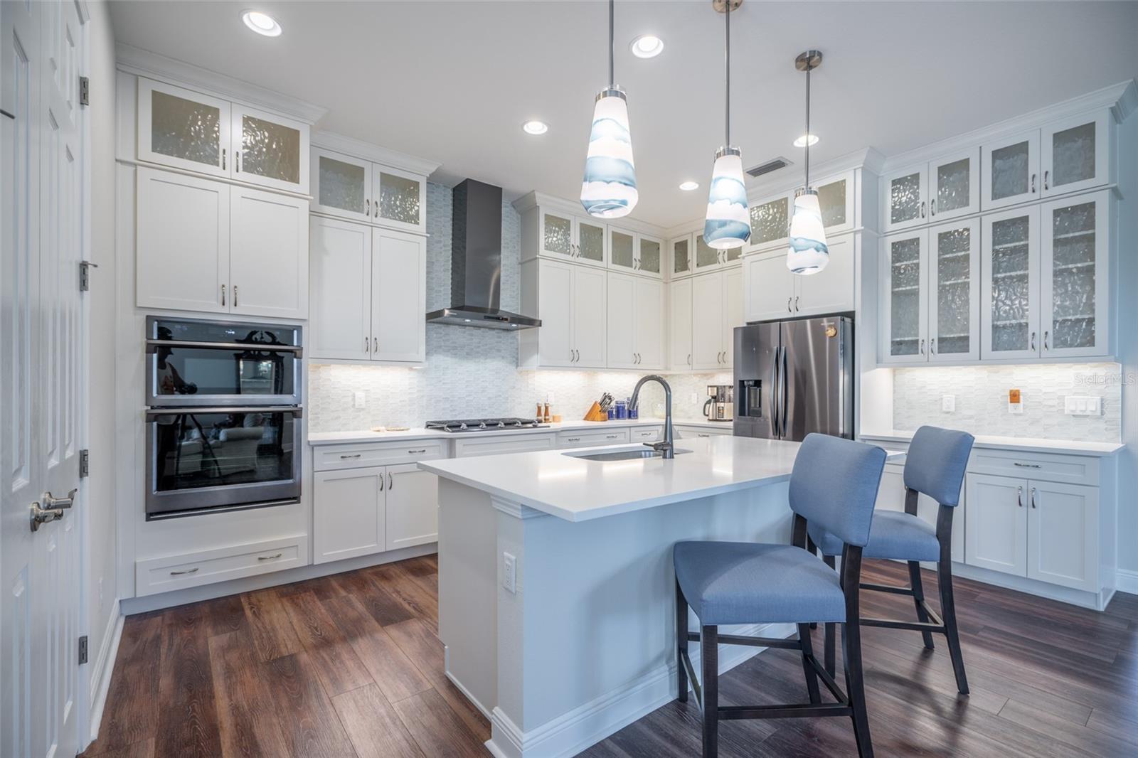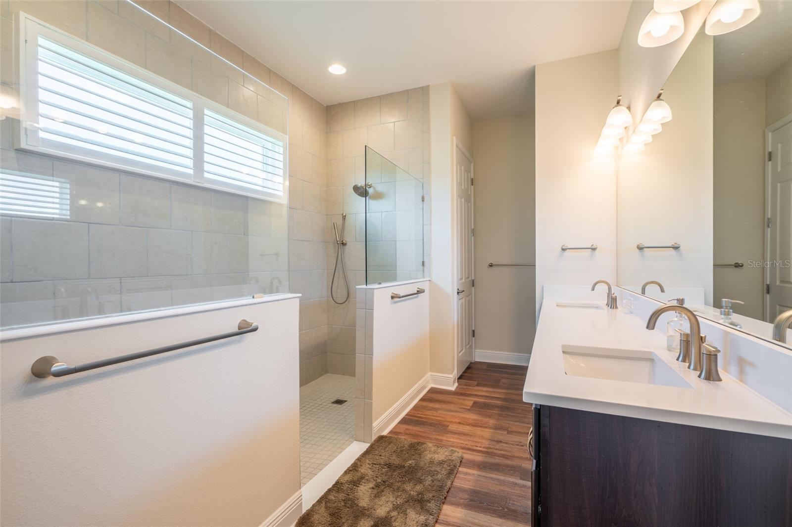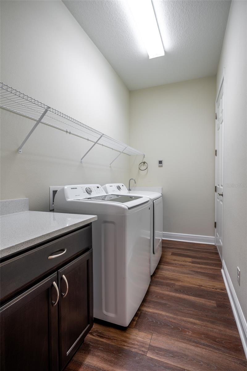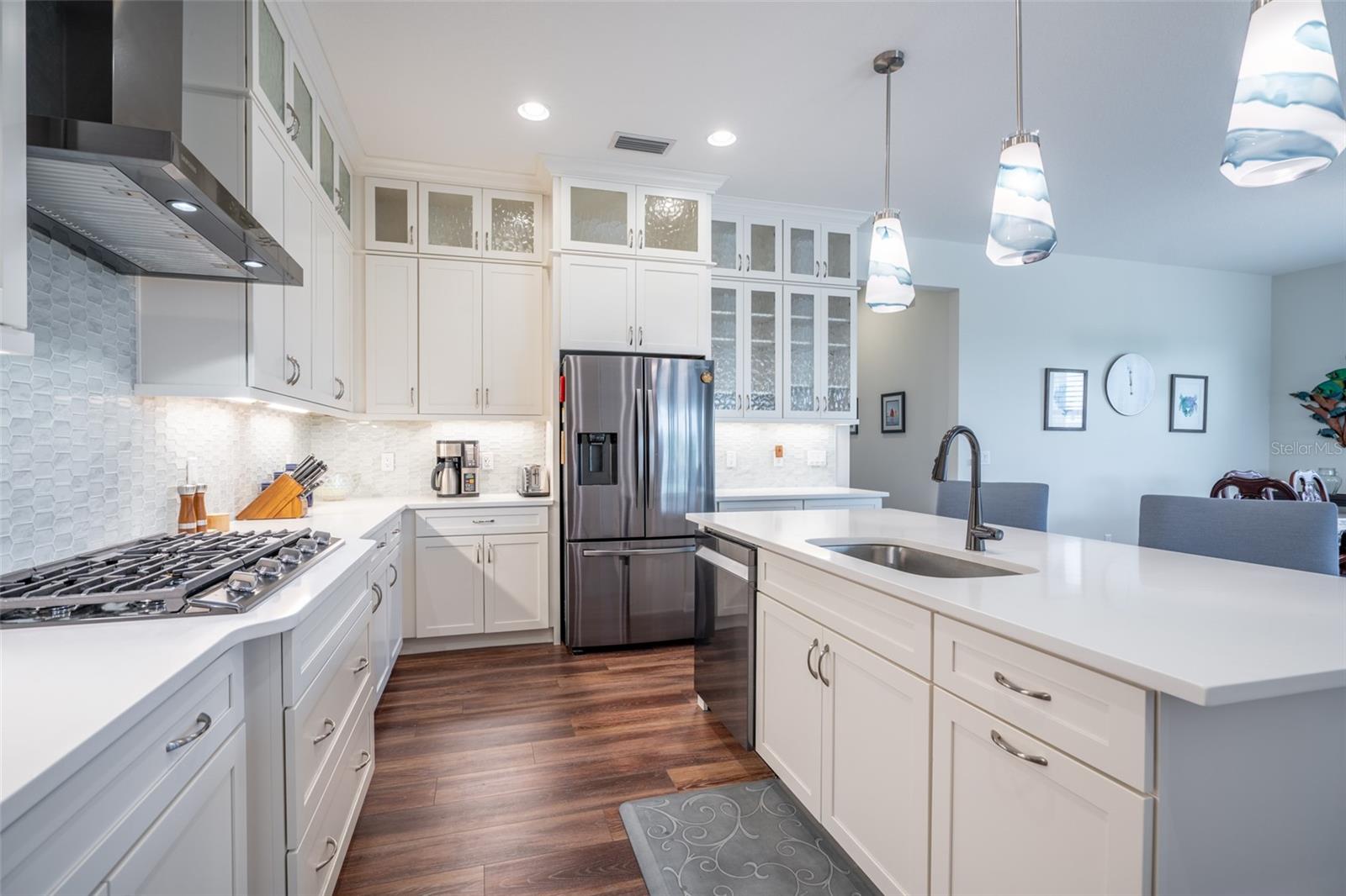 THIS STUNNING POOL HOME HAS IT ALL! Loaded with many upgrades & exquisite attention to detail throughout this home are sure to impress even the pickiest buyers. You will fall in love with the home as you enter and admire the long foyer complete with LUXURY VINYL flooring leading into great room and open kitchen. The high ceilings, open space and triple sliding glass doors allow maximum space value and natural light. The GOURMET KITCHEN offers many upgrades such as Quartz counter tops, Stainless Steel appliances, gas cooktop, custom hood vent, built-in microwave & oven, glass tile backsplash, and full dry bar cabinetry. Breakfast bar with decorative pendant lights add a touch of elegance. Spacious living room has triple sliding glass door with Hunter Douglas motorized Luminette. Walk out to the extended covered lanai and admire the gleaming SALT WATER POOL (heated with solar panels) that provides the perfect setting. No expense was spared on the mature tropical landscaped yard methodically designed to provide maximum amount privacy & relaxation. The Primary bedroom/bath is phenomenal with great lighting, built-in custom closets, luxury double shower with upgraded fixtures, tile extended to ceiling for a finished look & dual sinks. Plantation shutters grace all the windows throughout the home. All light fixtures and ceiling fans are top notch & modern. This home sits on larger lot (.33 acres) with long driveway on cul-de-sac and is beautifully landscaped for exceptional curb appeal. Parrish is a growing area offering excellent schools, shopping & not far from some of the nicest beaches in FL. Community offers resort style pool, playground, dog park & basketball courts. THIS GEM IS A MUST SEE AND TRULY MOVE-IN READY!! **NO FLOOD INSURANCE REQUIRED**