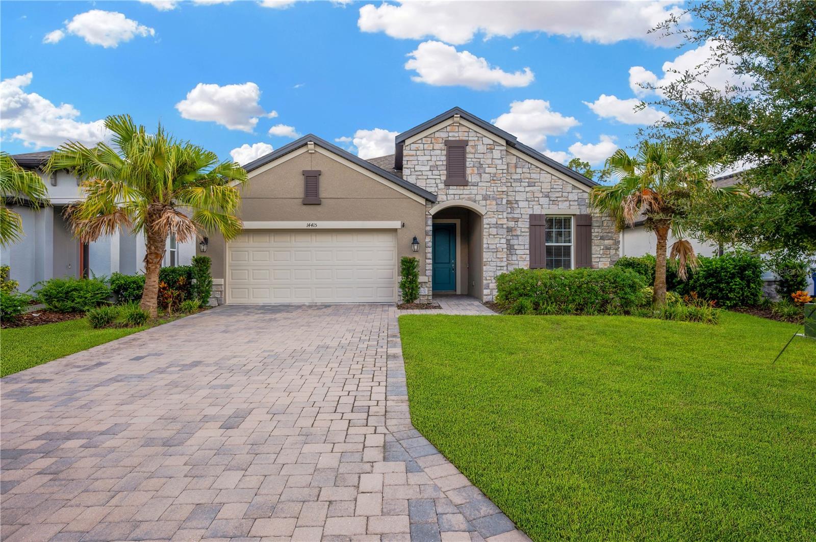 Welcome home! This M/I built Calusa floorplan will offer functionality, livability and comfort for years to come. Tucked away in the gated section of Twin Rivers, the Cove at Twin Rivers is the perfect place to call home. Why wait to build when this home is nearly new (2022), move-in ready and upgraded in all the right ways?! As you arrive, appreciate the curb appeal and notice the elevated stone exterior reminiscent of Tuscany. Brick pavers line the driveway, lead walkway and front entry. The wide foyer at the entrance feels grand and features high tray ceilings and gorgeous upgraded tile flooring. The ceramic woodgrain look tile floor is a breeze to maintain and durable for your family, kiddos and pets. Two spacious bedrooms off the front of the home have ceiling fans, plush carpet, and lots of natural light through the vinyl double pane windows. Stylish choices were made in the guest bath located between the front bedrooms. A bold patterned tile creates a vintage yet contemporary design on the floors. The classic white cabinets, quartz counters and subway tiled shower complete the look of this bathroom. No expense was spared in the gourmet kitchen - truly the heart of the home. Two-toned recessed panel cabinets, large center island, textured tiled backsplash, quartz counters, double oven, stainless appliances, apron front farmhouse style sink and stunning pendant lights really make this kitchen sparkle. Entertaining is easy in this floorplan. The large family room off the kitchen is wide open and seamlessly connects all living spaces, including the covered rear porch. The owner’s suite offers design upgrades including tray ceilings, tile floors and an enormous walk-in closet. The spa-like ensuite bath feels like a dream, especially in the oversized shower. Pebble stone flooring, glass tile mosaic and a built-in shower bench/seat are on full display through the frameless glass shower door. The Twin Rivers neighborhood offers fun amenities without CDD, including basketball & volleyball courts, playground, dog park, and the historic Riverhouse where you have access to a fishing pier and boat/kayak launch on the Manatee River. Come take a look at this beautiful home today! Welcome home!