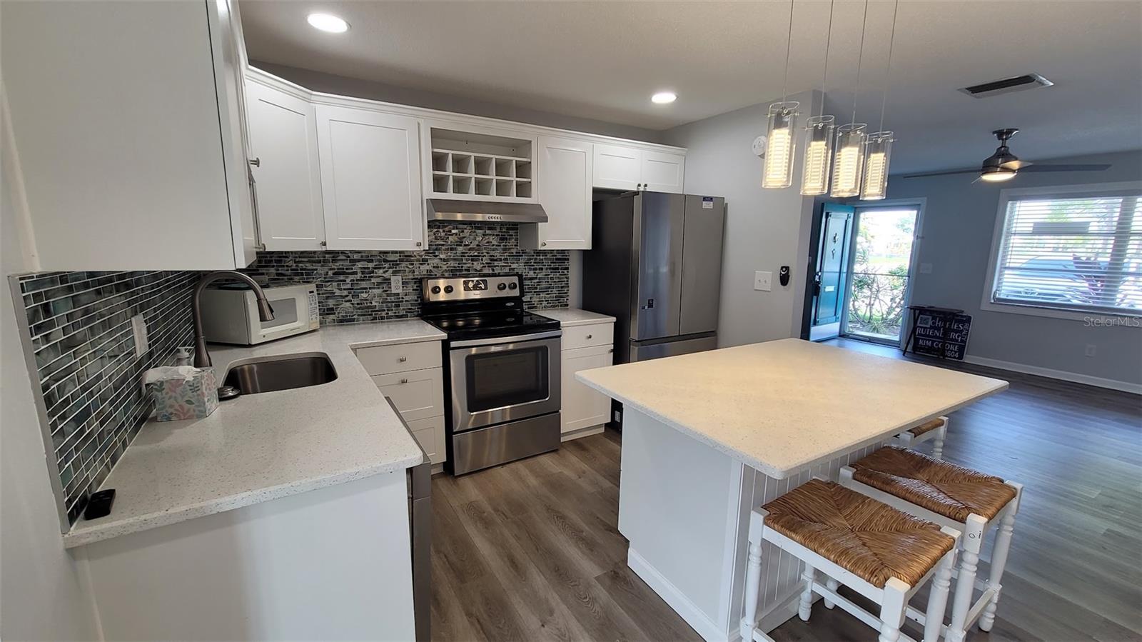 Welcome to this unique home in the 55+ neighborhood of Mainlands!! What makes this so unique you ask? While this home could easily work for a couple that is willing to share the 1 bathroom, it might truly be ideal for a senior that has family or friends in the neighborhood already. Imagine this, an in-law apartment that is actually a single family home, UNIQUE! The home is located near the entrance of the community which make it easy to stop by and check in! The home has been renovated inside to make it larger than life while adding air-conditioned storage spaces. The right side of the house is an OWNERS SUITE that has an 11X15 Bedroom and a 10X11 Dressing Room / Shower/ Walk in Closet Area, UNIQUE! The home only has one bathroom so upon visiting you will discover that a “jack and jill” toilet area is in the home. The owners have access to it from the large dressing area and guests have access to it from the hallway, UNIQUE! The kitchen area has been all redone and has newer appliances, stylish cabinets, glass tile backsplash, quartz countertops and an island that has an additional 4 drawers and cabinet for storage. The island is conveniently placed to make cooking and baking a breeze. The Florida room is currently set up as a den with a futon (Think Guest Room), the room could be a 2nd bedroom, den, office or craft room as well. A wall was added to create an air-conditioned storage closet with shelving. Back in that same area is a utility room with the electric panel (2023) Water Heater (2022) and Washer and Dryer (2023). This pet friendly, 55+ neighborhood offers a large variety of activities for you to participate in. The monthly newsletters and clubhouse reader boards alert you to all of the fun such as breakfasts, bingo, dances, shuffleboard and more. The clubhouse and pool for this home is just a few blocks away. There is a public executive golf course that is sure to please. This a “Golf Cart” Friendly neighborhood. This home is walking distance to the local shopping center and ice cream shop. Mainland’s is conveniently located to US 19, The Tampa and St. Pete airports, restaurants & Shopping, Freedom Lake Park, and the beautiful West Coast beaches. Move into this great community and let the maintenance team care for the outside of your home while you enjoy this beautiful Florida living. Make an appointment to see this great home today!