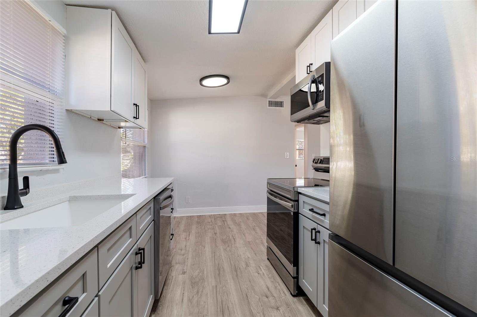 Fully renovated and move-in ready! This charming 2-bedroom, 1-bath home in Pinellas Park offers modern updates throughout and a functional layout designed for comfortable living. Recent renovations include updated finishes that give the home a fresh, 'brand new' home vibe. There is a brand new kitchen that has new shaker style cabinets and modern black matte hardware, slow close drawers, solid stone quartzite countertops and a new stainless appliance package to include a French door bottom freezer fridge, new range with the upgraded convection fryer oven feature, a matching microwave range hood and dishwasher. There is new laminate flooring laid throughout the entire home for a more clean, seamless look. Nice large windows throughout lend for plenty of natural light! Enjoy additional storage or your brand new workshop space with the well built, solid, concrete block shed in the backyard! Conveniently located near US Hwy 19 N to include access to many amenities-- shopping plazas, dining and entertainment venues, schools, libraries, hospitals and so much more! The best part for young families is that this home is just a few steps away from the neighborhood Skyview Terrace Park and Playground! PLUS this home is not in a flood zone either and will not require flood insurance. Come take a look and make this gem nestled in a quiet, peaceful neighborhood of Pinellas Park yours before it's gone too!
