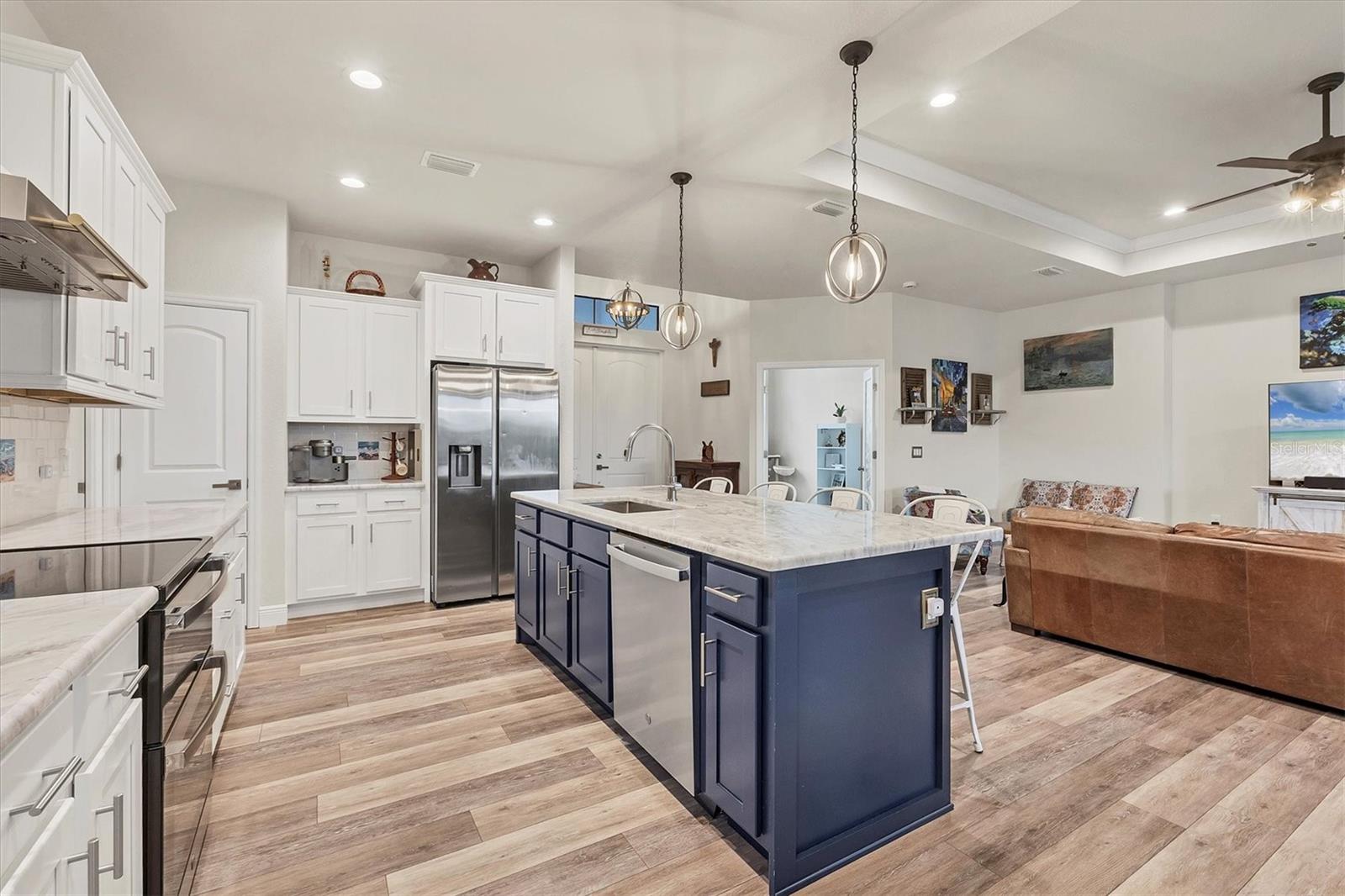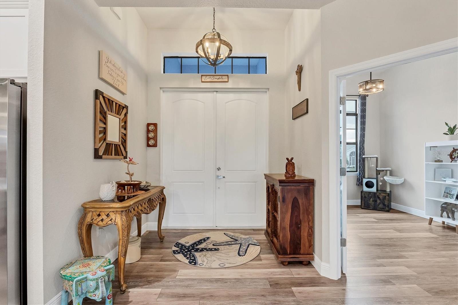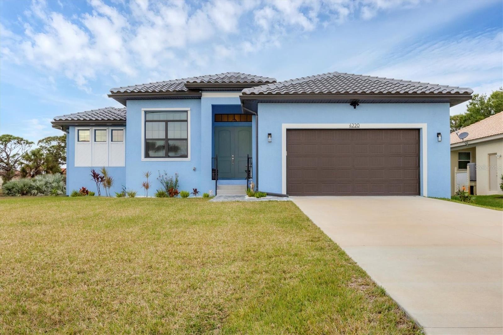 Sellers just approved a New Price Improvement on this beautiful Home! Welcome to this exceptional, newly constructed 4 Bedroom home in the highly sought-after Cape Haze Windward community! With a focus on luxury, comfort, and functionality, this property is packed with impressive upgrades and custom details. As you enter, you'll be greeted by luxury vinyl flooring throughout, ensuring both style and durability. The home boasts coffered ceilings in the primary bedroom and living room, adding an elegant touch to the spacious living areas. Upgraded lighting fixtures throughout illuminate every room, creating a warm and inviting atmosphere. The heart of the home is the chef-inspired kitchen, featuring stainless steel appliances, including a double convection oven and deluxe range hood. The hand-painted accent tiles in the backsplash bring a unique charm to the space, while soft-close cabinets and doors add an extra layer of convenience and refinement. A stainless farmhouse sink and upgraded granite countertops complete this beautiful kitchen, offering both style and functionality. The master bath features a curbless shower, providing a sleek, modern aesthetic, along with added accessibility. Additional luxury touches include an upgraded 50-gallon quick-fill water heater for continuous comfort, polycarbonate hurricane shutters for peace of mind, and built-in Ring security cameras for enhanced security. The lanai is perfect for relaxing or entertaining, with an infinity screen offering an unobstructed view of the lush surroundings. This home truly has it all: comfort, elegance, and modern amenities. Don’t miss the opportunity to call this gorgeous property yours. Schedule a showing today and experience the lifestyle that awaits at 4220 Cape Haze Drive!