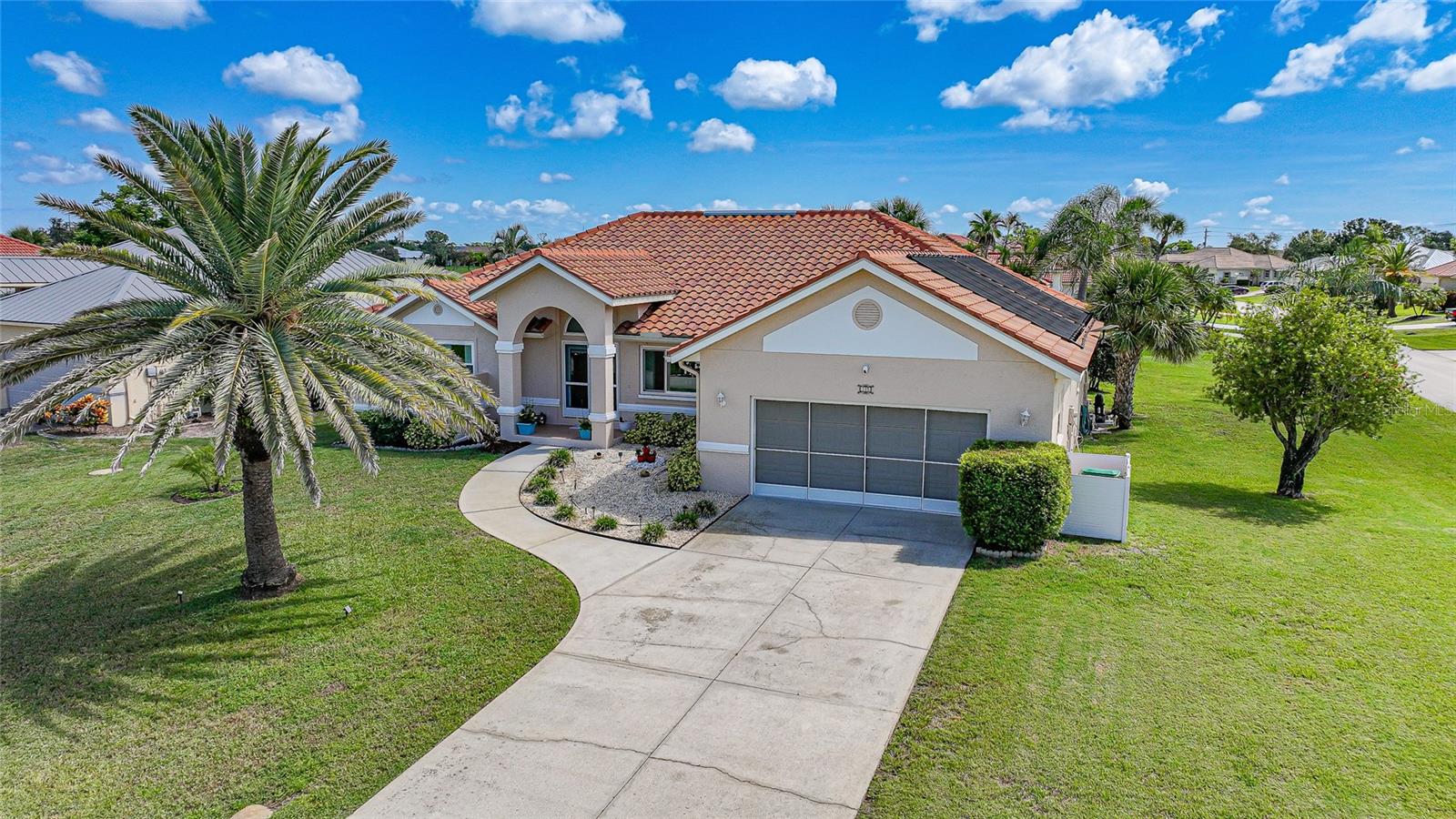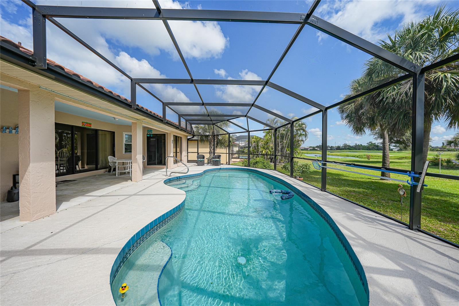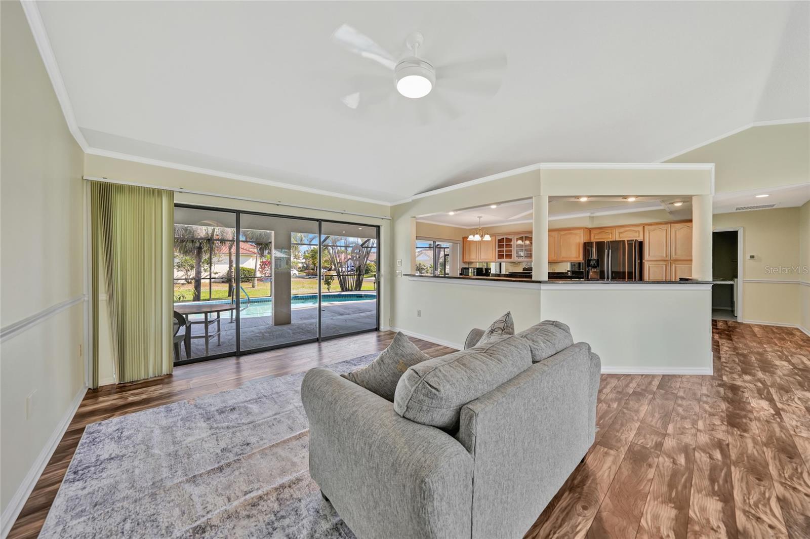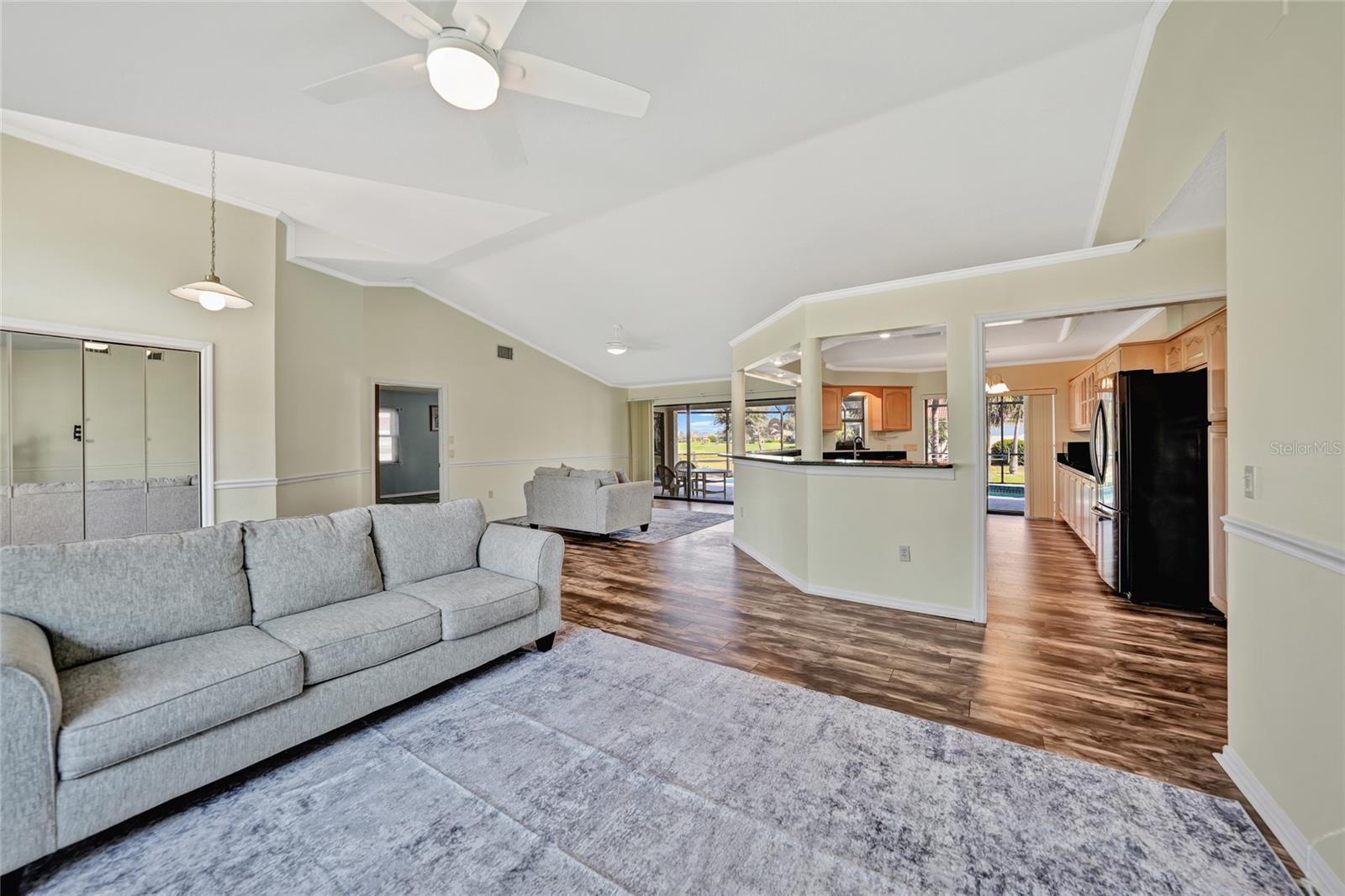 BONUS PERK: Seller pays your first year of lawn care and pool maintenance — move in and relax! Stunning HEATED & COOLED POOL home on an oversized corner lot in the highly sought after Cape Haze Windward community. This beautifully updated 2-bedroom, 2 bath residence with a bonus room—ideal as an OFFICE or THIRD BEDROOM—offers the perfect balance of elegance, comfort, and Florida lifestyle. Enjoy tranquil peek-a-boo views of the pond and golf course in a home designed for both relaxation and entertaining. The double door entry welcomes you into a bright open concept great room with soaring 11.5 ft vaulted ceilings, crown and chair rail molding, and neutral coastal tones. Four pocketing sliding glass doors open seamlessly to the expansive screened lanai, where a heated and cooled pool, covered seating areas, and a 64 foot enclosure create a private resort style retreat. The designer kitchen is a centerpiece, featuring granite countertops, rich wood cabinetry, FINGERPRINT RESISTANT stainless appliances (2019), a breakfast bar, and a cozy dining nook overlooking the pool. A convenient pass through window enhances outdoor dining and entertaining. The primary suite is a peaceful retreat with a large walk-in closet, additional built in storage, and a sitting area or work out equipment area with direct pool access. The ensuite bath offers dual vanities, a makeup station, soaking tub, and walk-in shower with FLOOR TO CEILING tile. The guest suite includes a walk-in closet, private sitting area, and access to the pool, with the guest bath also serving as a convenient pool bath. Additional highlights include HURRICANE IMPACT WONDOWS (2018), laminate flooring in main living areas, an interior laundry room with utility sink, and an oversized two-car garage with sliding screen panels. Located minutes from The Links Golf Course, Don Pedro Island State Park, grocery stores, and restaurants. Residents enjoy quick access to beaches, boating, and world-class fishing at Boca Grande. Boca Grande Causeway is approximately 3 miles away, and Englewood Beach is less than 10 miles. This home offers a rare combination of quality, comfort, and location—ideal for year-round living, a seasonal retreat, or a luxury investment property.