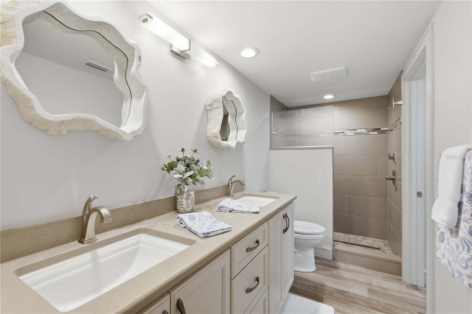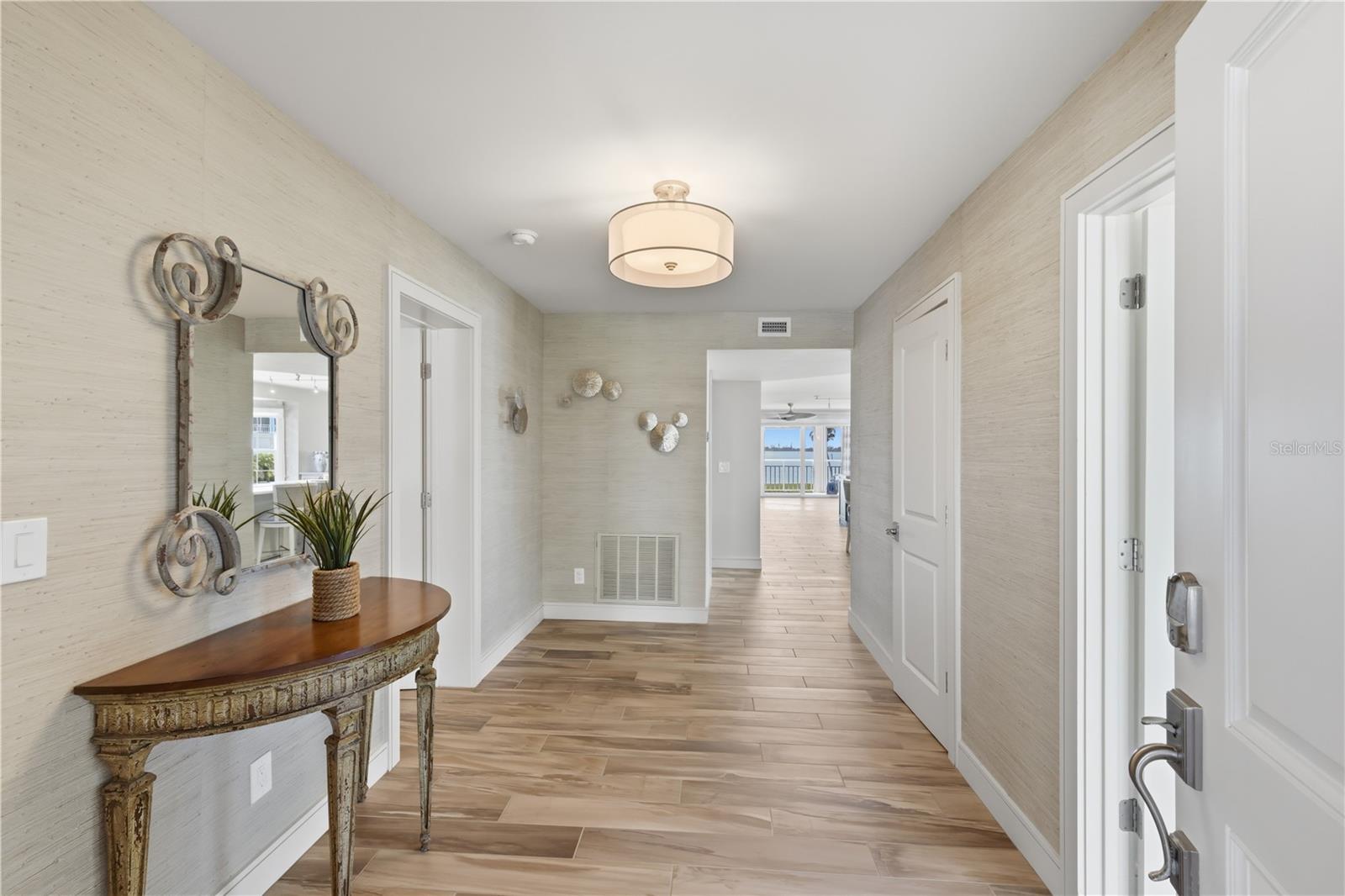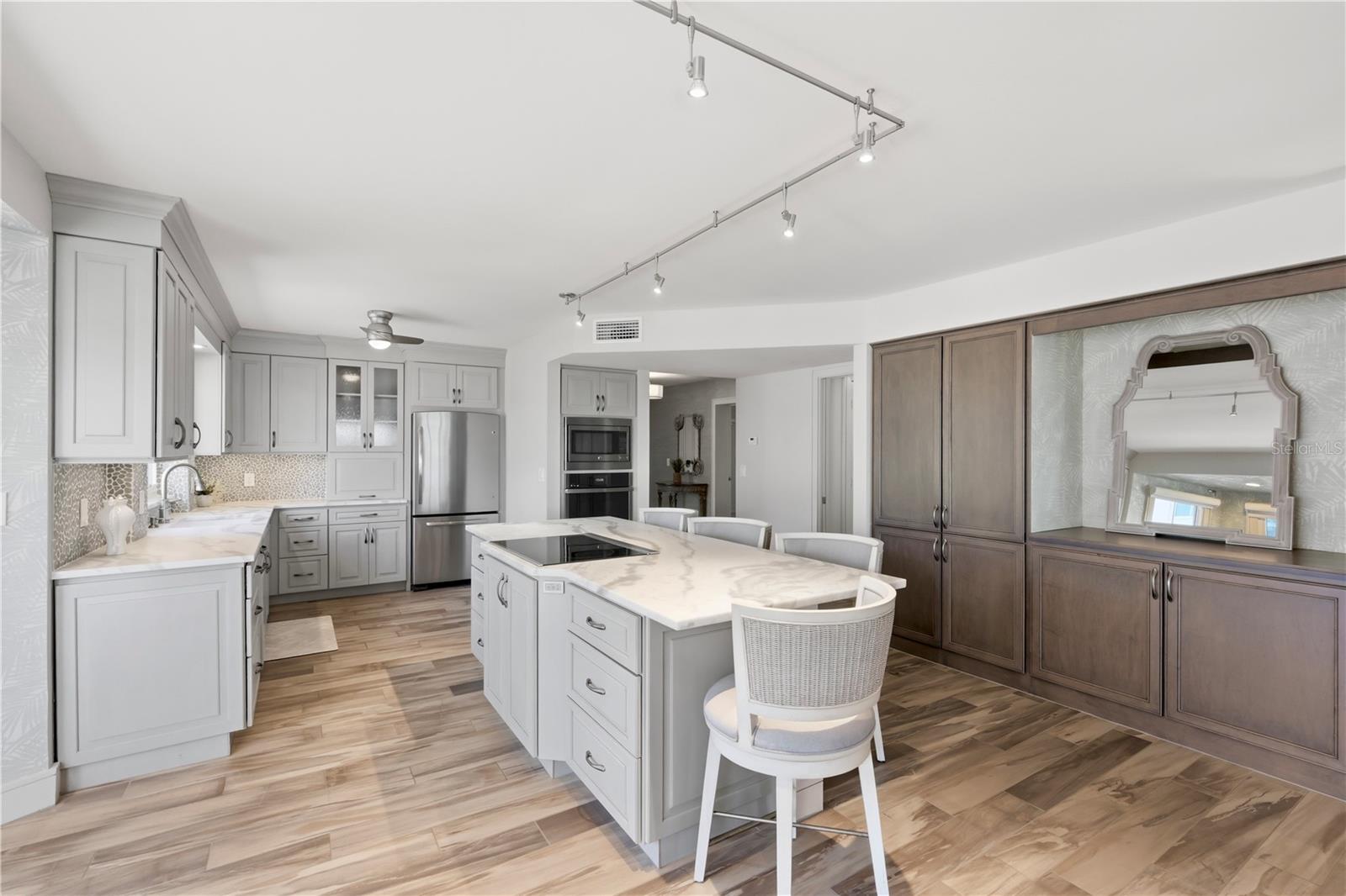One or more photo(s) has been virtually staged. Experience refined coastal living at Placida Harbour Club in this beautifully reimagined, one-level residence offering 2,103 square feet of living space. Completely updated and redesigned to include 3 bedrooms and 2.5 bathrooms, this stunning condominium captures sweeping panoramic views of Placida Harbor and the Intracoastal Waterway from nearly every angle. Inside, wood-look porcelain tile flows seamlessly throughout, complemented by smooth drywall finishes, LED lighting, and impact glass windows and doors with additional hurricane shutters for peace of mind. The chef’s kitchen is both elegant and functional, showcasing GE stainless steel appliances, quartz countertops, solid wood cabinetry, and generous prep space, all perfectly positioned to enjoy tranquil water views while cooking or entertaining. The redesigned primary suite layout enhances both comfort and functionality, creating immense closet space rarely found in condominium living. The spacious primary bathroom offers dual vanities, refined finishes, and a large walk-in shower. A custom built-in bar with integrated refrigerator and freezer drawers adds a sophisticated touch for hosting, while the fully remodeled bathrooms reflect a clean, contemporary aesthetic. Step onto the screened lanai and savor the waterfront breeze, enhanced by electric roll-down hurricane screens for protected, year-round enjoyment. Practicality meets luxury with elevator access, a new standing seam metal roof (2023), and a two-car tandem garage paired with an oversized private storage room—an exceptional offering in condominium living. Beyond the residence, Placida Harbour Club delivers a dynamic waterfront lifestyle. Residents enjoy multiple clubhouses, heated swimming pools, a well-equipped fitness facility, tennis and pickleball courts, a deep-water marina with kayak launch, scenic shoreline walking paths, and private ferry service to the unspoiled beaches of Little Gasparilla Island. Unit 2602 presents a rare opportunity to own a meticulously upgraded waterfront retreat where thoughtful design, luxury finishes, and panoramic views converge.