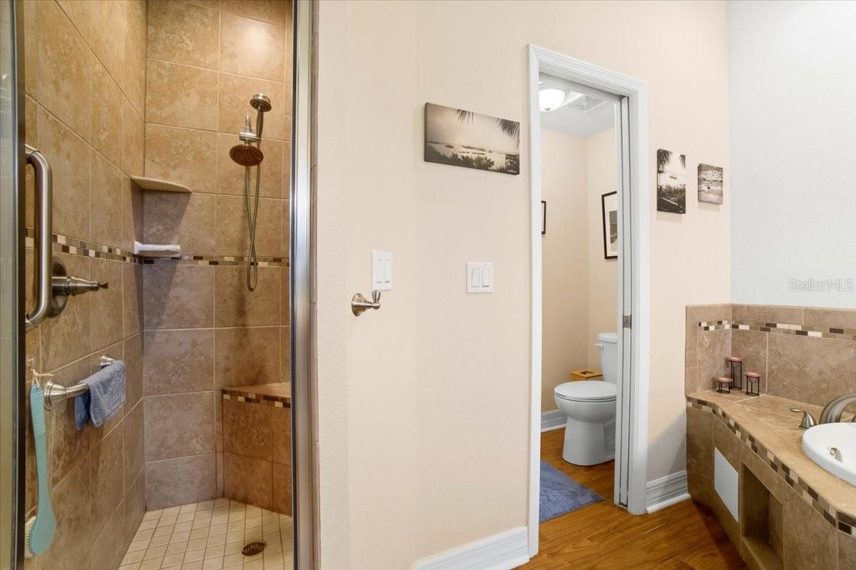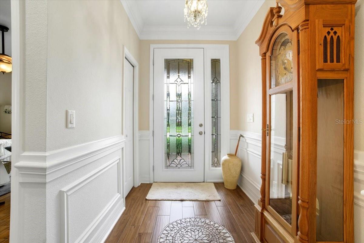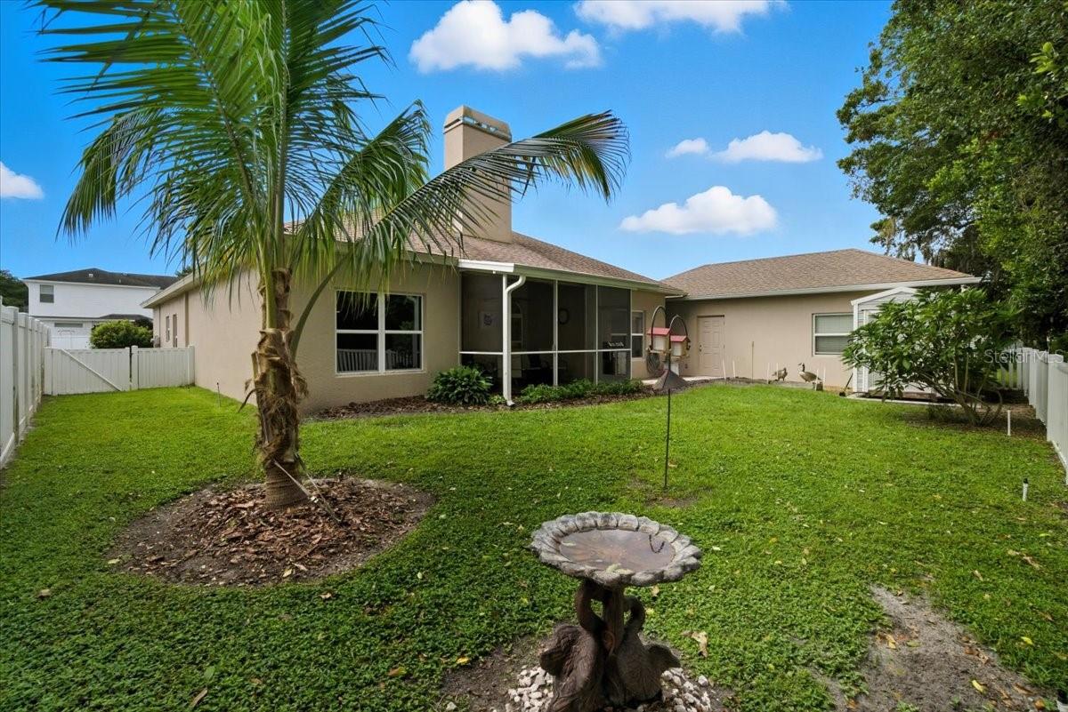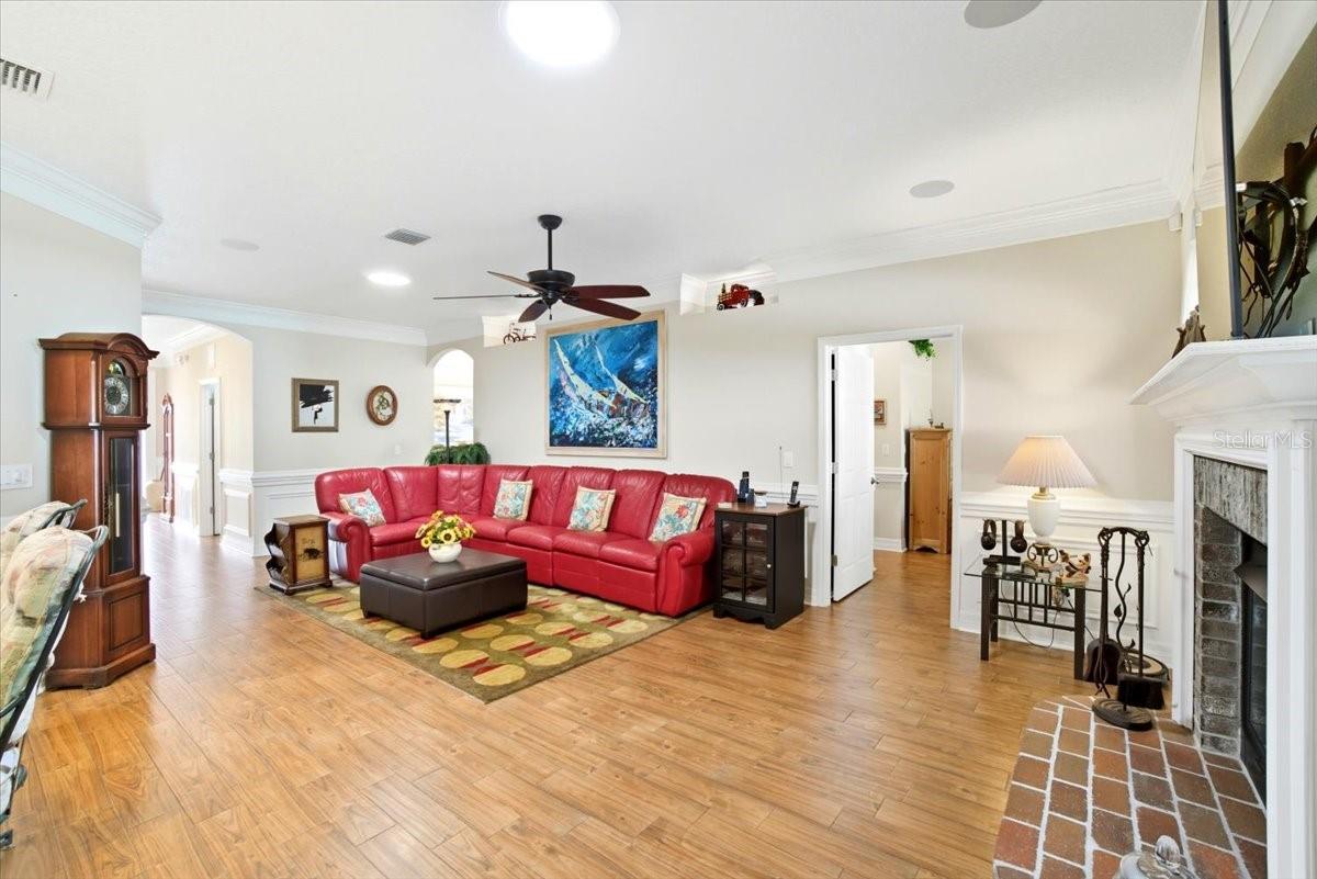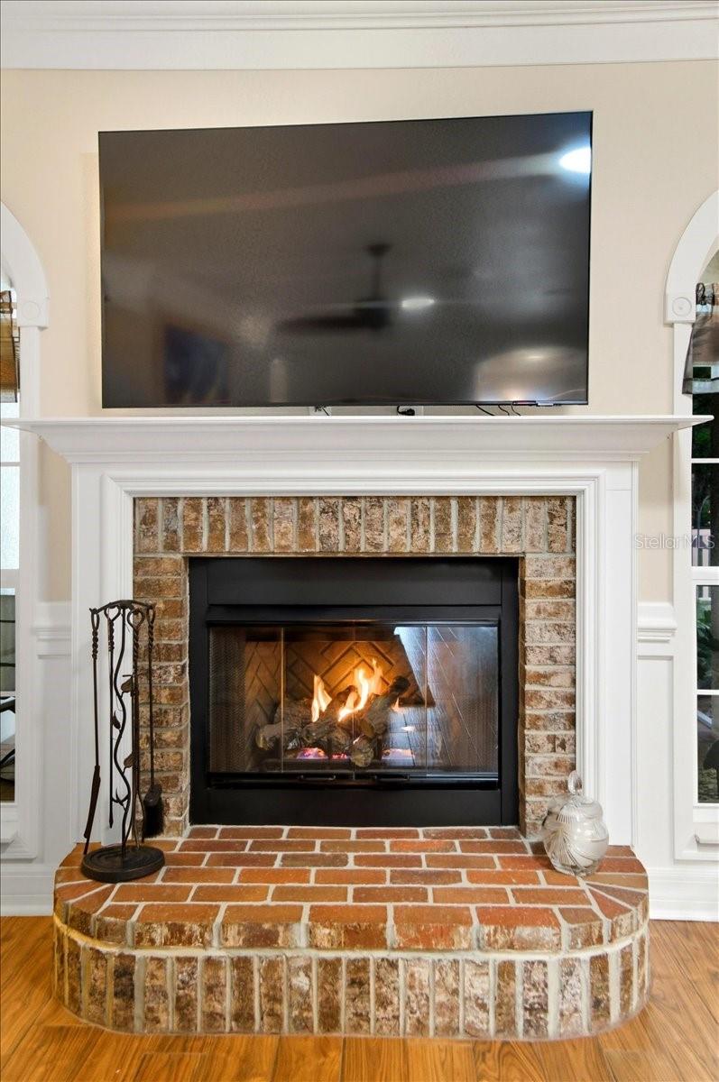 Welcome to Park Place, a small, quiet gated community where neighbors wave, HOA fees stay low, and there are no CDD fees in sight. This custom-built 2016 home was designed with care and attention to every detail—combining the charm of craftsmanship with all the comforts of modern living. From the moment you walk up to the 8-foot glass front door, you’ll feel the difference. Inside, the home opens to a warm and welcoming living space filled with natural light from solar tubes and anchored by a rare brick gas fireplace—a cozy touch that gives this home so much character. The same brick carries through to the kitchen island, tying the heart of the home together beautifully. The kitchen is both functional and stunning, featuring custom 43” cabinets, top-of-the-line stainless steel appliances, under- and over-cabinet lighting, a large walk-in pantry, and a sunny breakfast nook framed by an oversized window. The formal dining room adds flexibility—perfect as a den, home office, playroom, or even a fourth bedroom (it was part of the builder’s original plan). The primary suite feels like a private retreat, complete with dual closets and a spa-like bathroom with a soaking tub, dual vanities with a built-in makeup station, and a large walk-in shower with a built-in seat. Every detail in this home was thoughtfully chosen: porcelain tile throughout, custom lighted inlay accents, marble window sills, and Hunter Douglas top-down/bottom-up shades for both beauty and function. This natural gas home offers everyday conveniences like a tankless water heater for endless hot water, a whole-home water softener, and surround sound in the living room, primary suite, and lanai. Both the attached 2-car garage and the detached garage offer 220-amp service, attic storage, and a generator hookup—ideal for anyone who loves tinkering, working on projects, or simply having room for all the toys.
