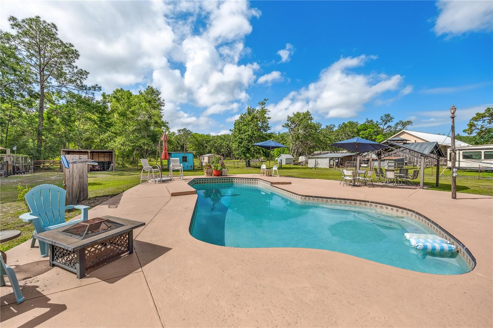 **Farm Life Fabulous!** Experience the best of country living on nearly 4 acres with this updated 3-bedroom, 2-bath block home offering 1,872 sq ft of living space, a refreshing in-ground pool, and USDA financing eligibility! Bring your animals, toys, and hobbies—there’s room for it all! Horses and livestock welcome on this fully fenced property. Enjoy peaceful mornings on the spacious lanai, or host unforgettable gatherings in the two separate living areas, formal dining room, and massive outdoor patio space. The pool area is an entertainer’s dream! **Recent upgrades include:** - New French doors - Expanded parking pad - New microwave and dishwasher - New water softener and Iron filter - Re screened patio - Expanded Retention Pond - New vinyl siding - New oversized drain field (2023) - Updated well pump, tank, and water line (within the last 10 years) - Energy-efficient, double-hung vinyl windows (within the last 10 years) Additional features: *inside laundry*, *storage room*, *10x14 metal shed*, *10x20 wood shed*, and a *run-in stall* for your animals. A *paved circular driveway* adds both curb appeal and ample parking space. This classic ranch-style retreat with modern updates won’t last long—**schedule your private tour today!**