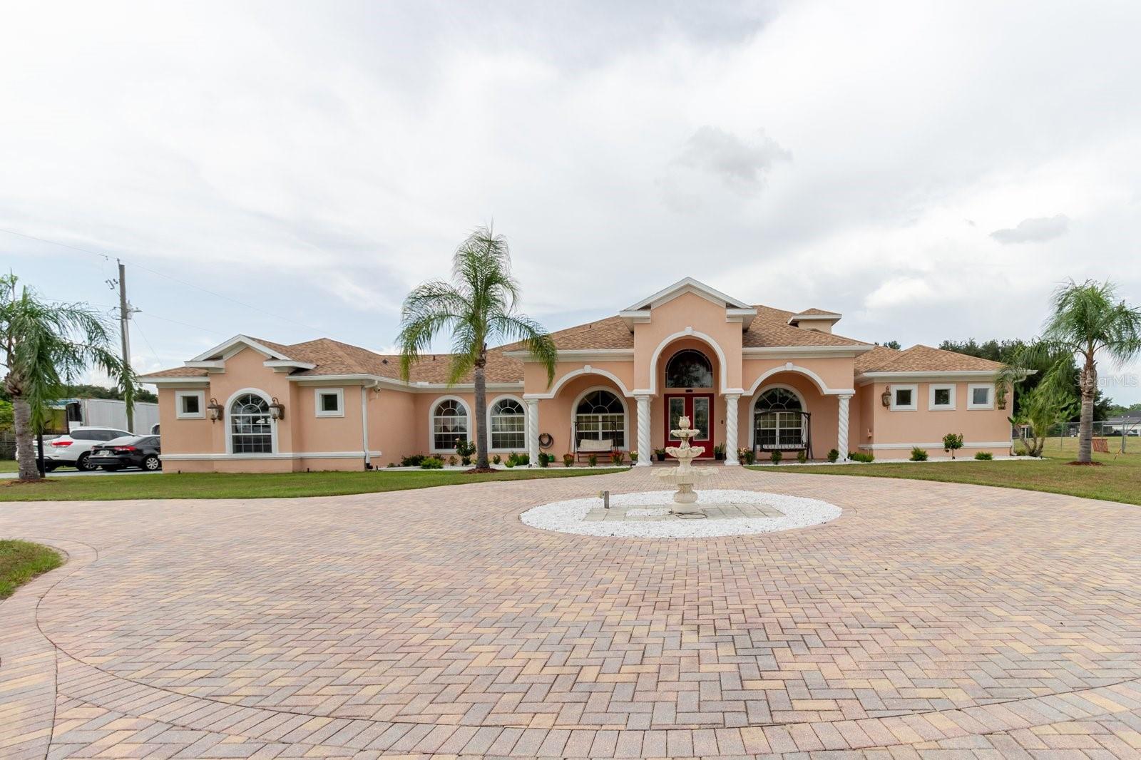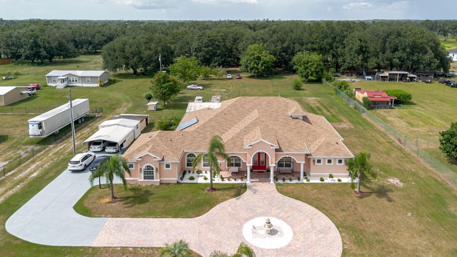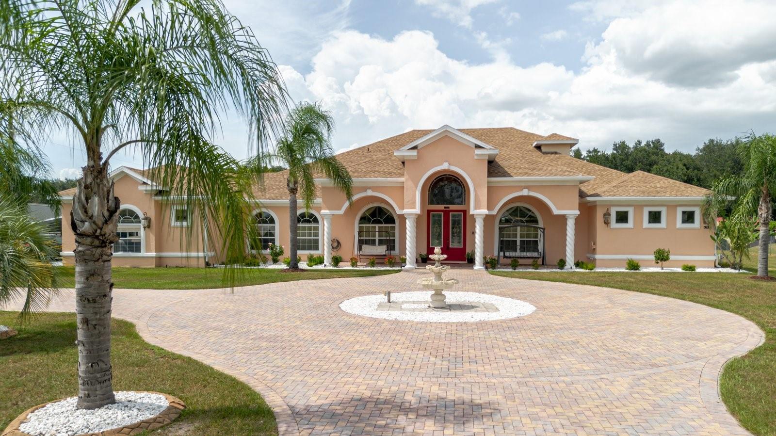 Welcome to this custom-built luxury estate on 1.43 acres with NO HOA or deed restrictions! Offering 5 bedrooms, 5 bathrooms, and over 4,428 sq. ft. of living space, this home combines elegance, comfort, and freedom. Step inside and you’ll be greeted by soaring ceilings, crown molding, custom tilework, and elegant chandeliers. The gourmet kitchen features granite countertops, custom cabinetry, and a built-in wine rack—perfect for entertaining. The spacious downstairs master suite includes custom walk-in closets, a private sitting area, and a spa-style bathroom with dual vanities, a jetted tub, and dual walk-in shower. Upstairs, enjoy a large entertainment room with a private balcony, plus an additional bedroom and full bath—ideal for guests or family. Outdoor living is just as impressive, with a screened-in covered patio, hot tub, fruit trees, and beautifully landscaped grounds. The property also features a detached garage/workshop, storage shed, 2-car carport, and a brand-new roof. Bring your toys—boats, RVs, ATVs—this property has room for it all, with no HOA restrictions! Conveniently located with easy access to both Tampa and Orlando, this home offers the perfect blend of luxury, space, and tranquility.
