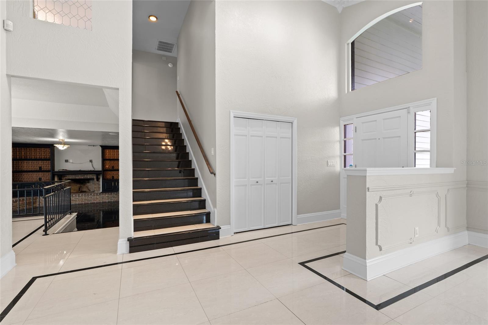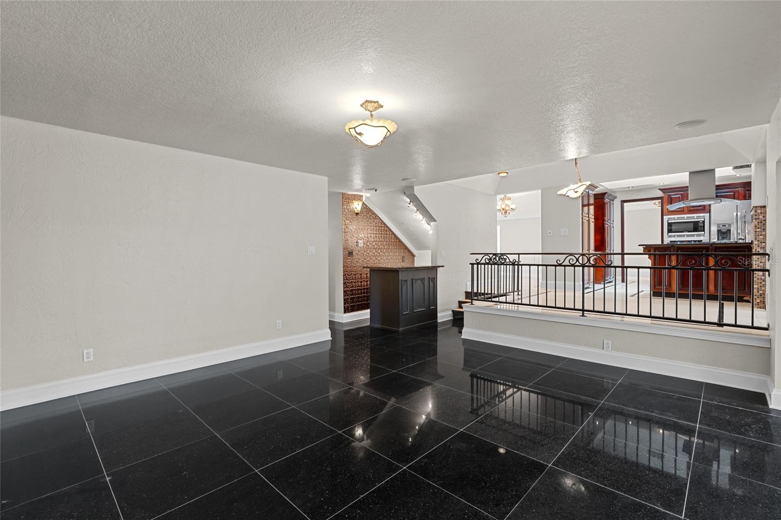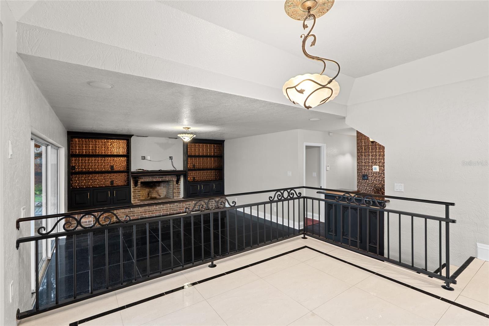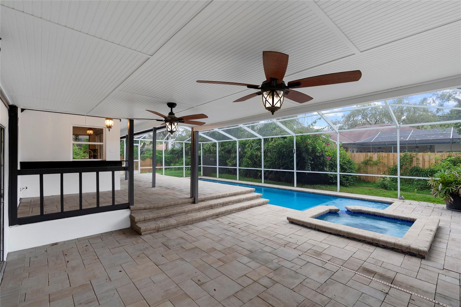 This BEAUTIFUL remodeled 3 bedroom, 3 full bath home on over a QUARTER ACRE is upgraded with gorgeous custom home accents. After stepping up the grand brick entry with high vaulted entry and entering in the foyer, the front door opens into a large, welcome and opening living area with vaulted ceilings, decorative crown molding, and custom tile flooring throughout. Through the dining area and into the kitchen, you will find an upgraded wood kitchen with stone counters, TWO built in pantry areas, a desk / work area, eat in area, and PASS THROUGH windows that flow through the window to the outdoor bar space. PERFECT for entertaining, this home even has a custom wet bar! On the other side of the kitchen you will find a second dining area that steps down into a second living area, featuring the custom wet bar, wood burning fireplace, and built in custom shelving. Off this area is one bedroom and full bathroom. Upstairs you find a HUGE primary suite with a separate office and RETRACTABLE half wall (with built in storage), outside upper deck area, a MASSIVE walk in closet with GORGEOUS built in closet organization, two vanities, a soaking tub, and a standing shower. Down the hallway you find the upstairs laundry room, and the third bedroom, with its own private bathroom, walk in closet, and office. Heading outside, the gorgeous paver patio has multiple levels with tons of room for patio furniture, a bar that connects to the kitchen via passthrough windows, a HUGE pool, and heated spa hot tub. This AMAZING custom home will not last long.