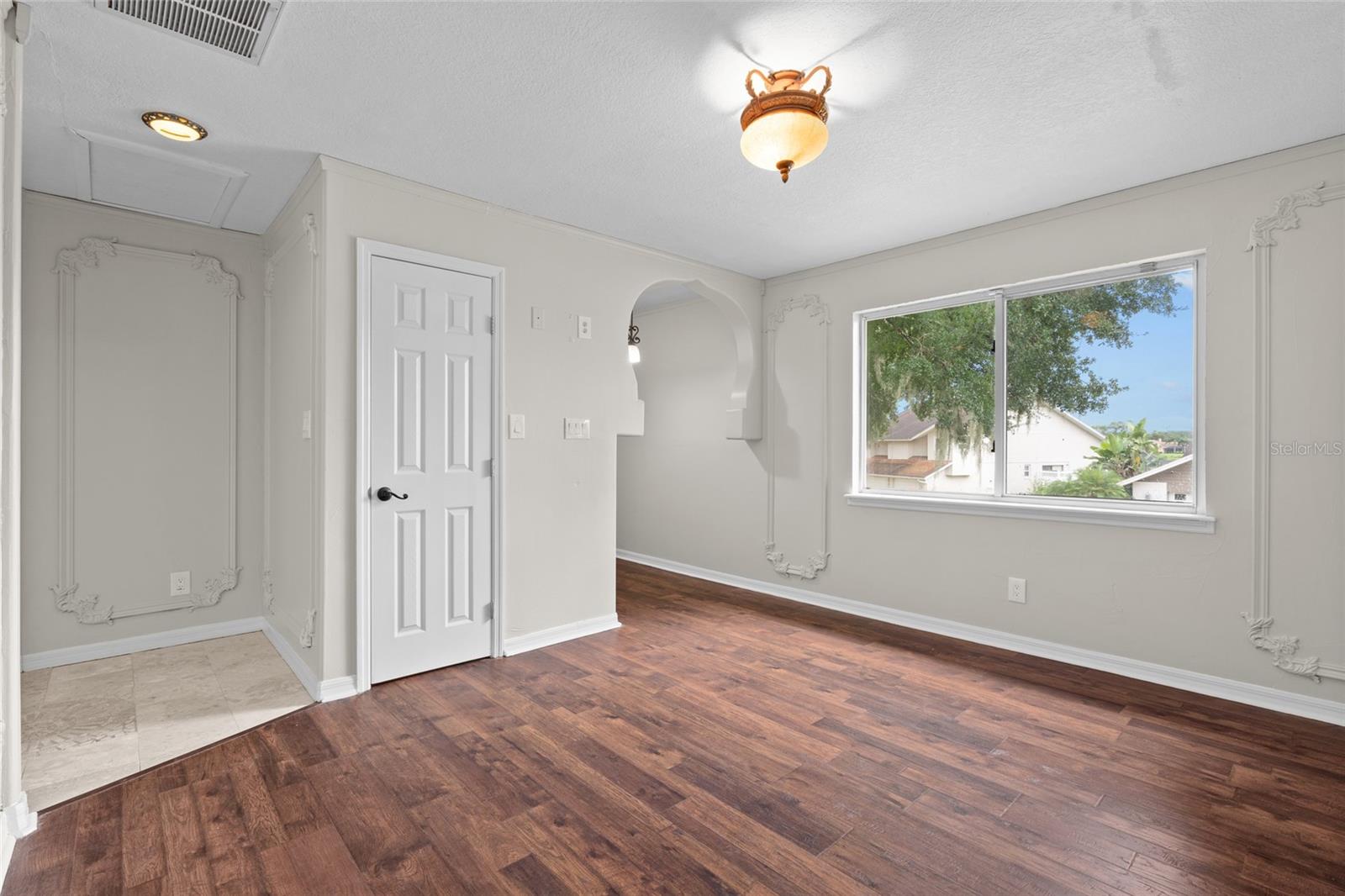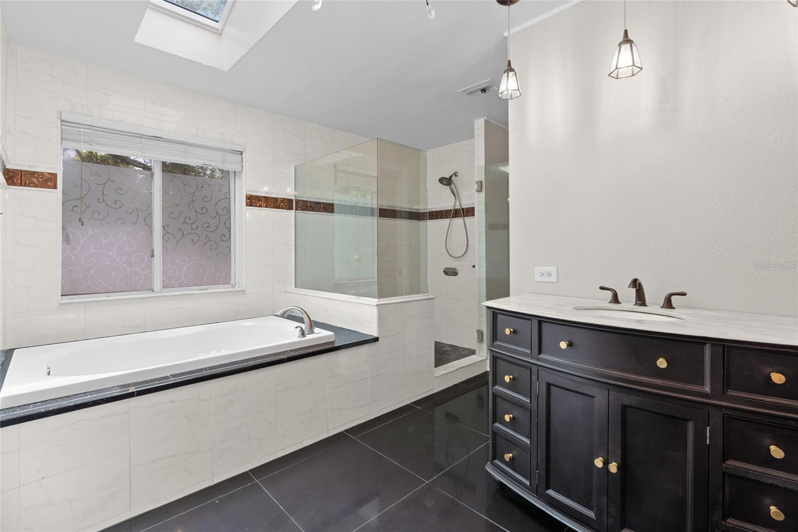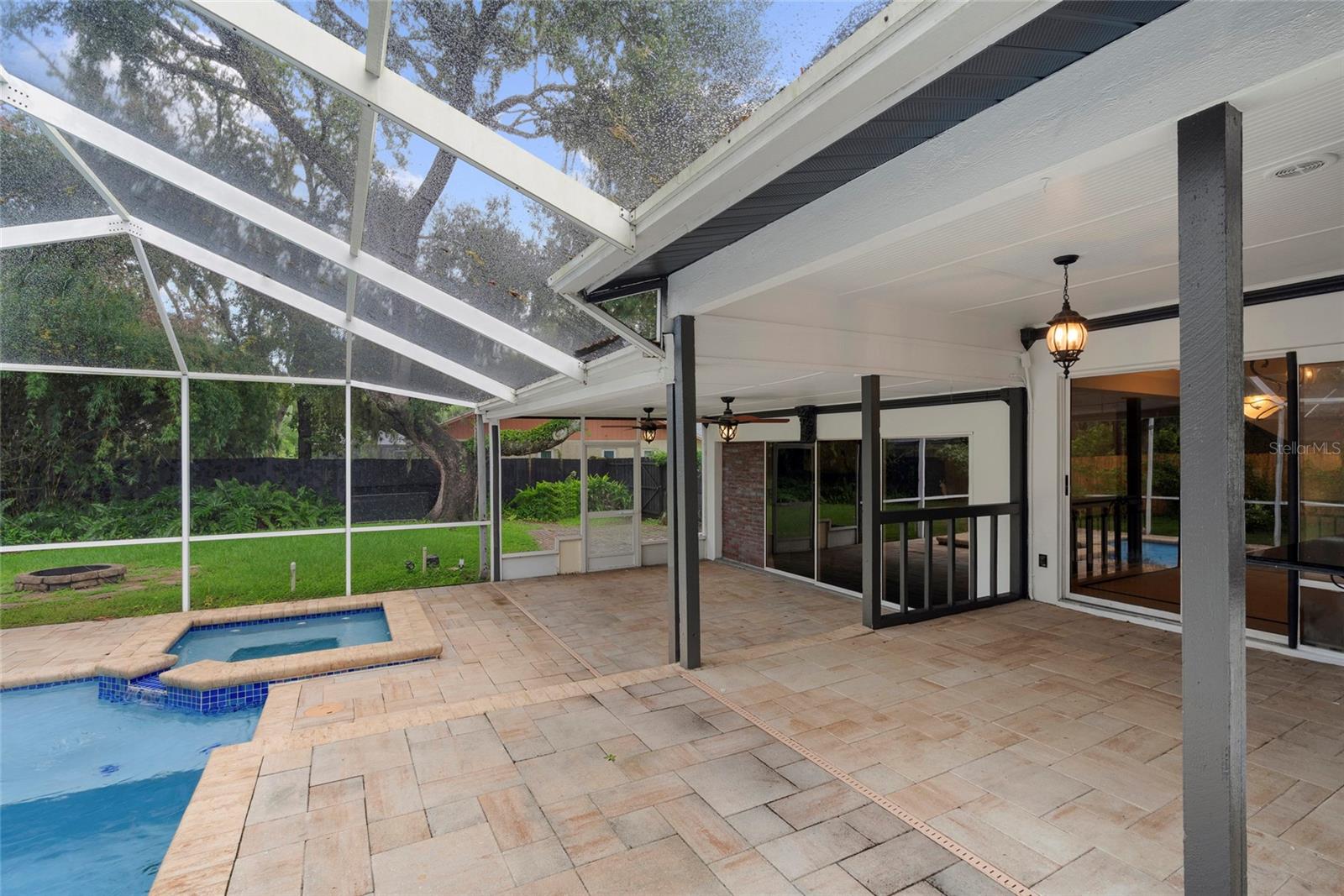 This BEAUTIFUL remodeled 3 bedroom, 3 full bath home on over a QUARTER ACRE is upgraded with gorgeous custom home accents. After stepping up the grand brick entry with high vaulted entry and entering in the foyer, the front door opens into a large, welcome and opening living area with vaulted ceilings, decorative crown molding, and custom tile flooring throughout. Through the dining area and into the kitchen, you will find an upgraded wood kitchen with stone counters, TWO built in pantry areas, a desk / work area, eat in area, and PASS THROUGH windows that flow through the window to the outdoor bar space. PERFECT for entertaining, this home even has a custom wet bar! On the other side of the kitchen you will find a second dining area that steps down into a second living area, featuring the custom wet bar, wood burning fireplace, and built in custom shelving. Off this area is one bedroom and full bathroom. Upstairs you find a HUGE primary suite with a separate office and RETRACTABLE half wall (with built in storage), outside upper deck area, a MASSIVE walk in closet with GORGEOUS built in closet organization, two vanities, a soaking tub, and a standing shower. Down the hallway you find the upstairs laundry room, and the third bedroom, with its own private bathroom, walk in closet, and office. Heading outside, the gorgeous paver patio has multiple levels with tons of room for patio furniture, a bar that connects to the kitchen via passthrough windows, a HUGE pool, and heated spa hot tub. This AMAZING custom home will not last long.
