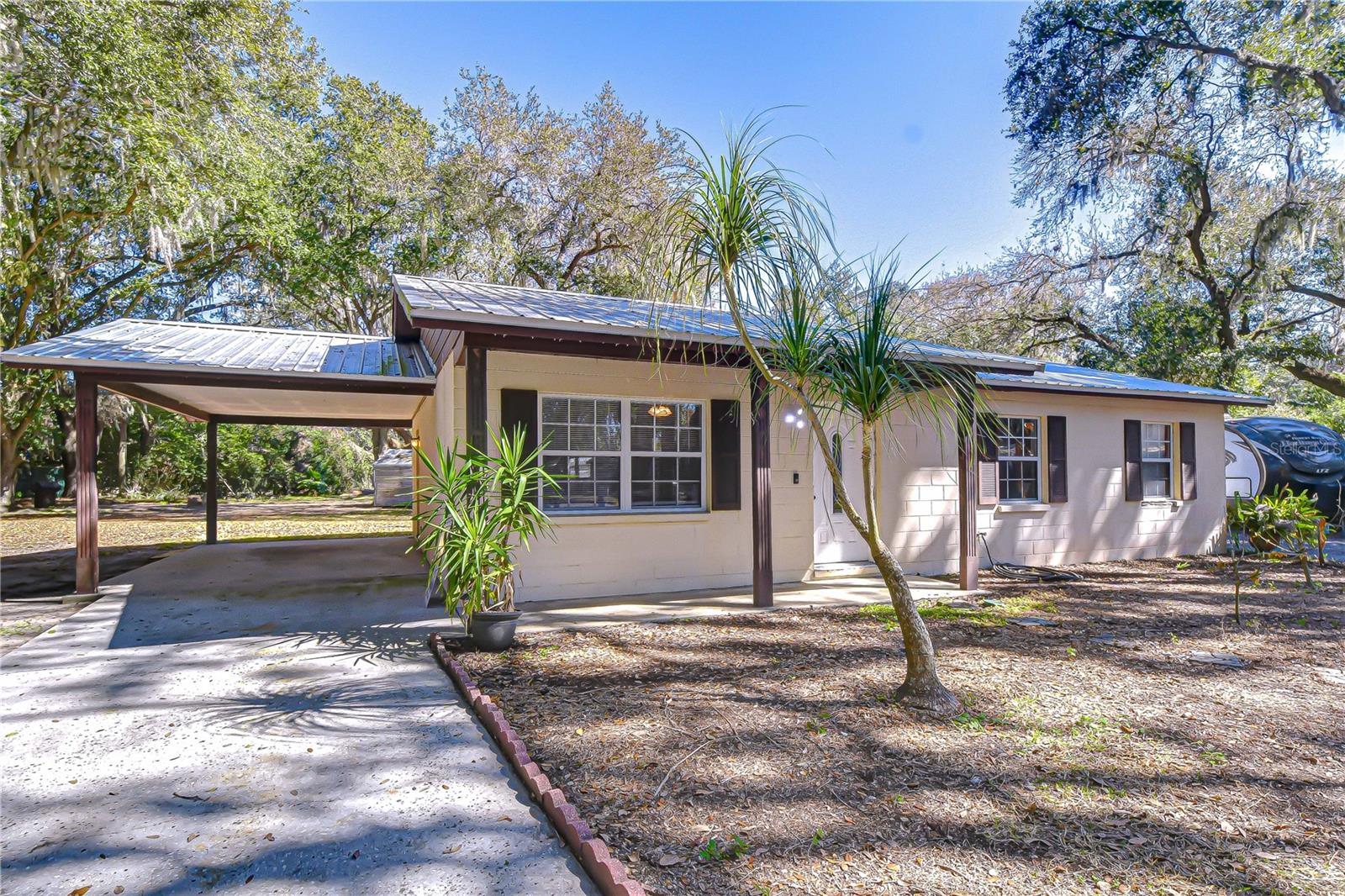 Well-maintained, affordable 3-bedroom, 1-bath home on a generous corner lot with no rear neighbors—offering real privacy and plenty of space to stretch out. Standout feature: a newer metal roof (installed within the last 2 years) built to handle Florida's weather for the next 30+ years—no worries about leaks or costly replacements down the line. Step inside to a clean, functional layout with fresh tile floors throughout, a modern kitchen boasting granite countertops, brand-new cabinets, and updated appliances that make everyday cooking and cleanup a breeze. There's also a dedicated laundry room to keep things organized and out of the way. Outside, enjoy a solid patio ideal for weekend barbecues, family time, or just relaxing after a long day. The large lot gives you room to add an ADU in the future for extra family space, guests, or income potential. For the hands-on crowd: two work sheds, plus a utility shed already wired with electricity and washer/dryer hookups if you prefer laundry outdoors. And an RV hookup right beside the house—perfect for your rig, trailer, boat, or additional parking without jamming up the driveway. This is a practical, upgraded home with thoughtful improvements, priced right and ready for you to move in and enjoy. These properties don't stay on the market long come see it for yourself today before its gone!