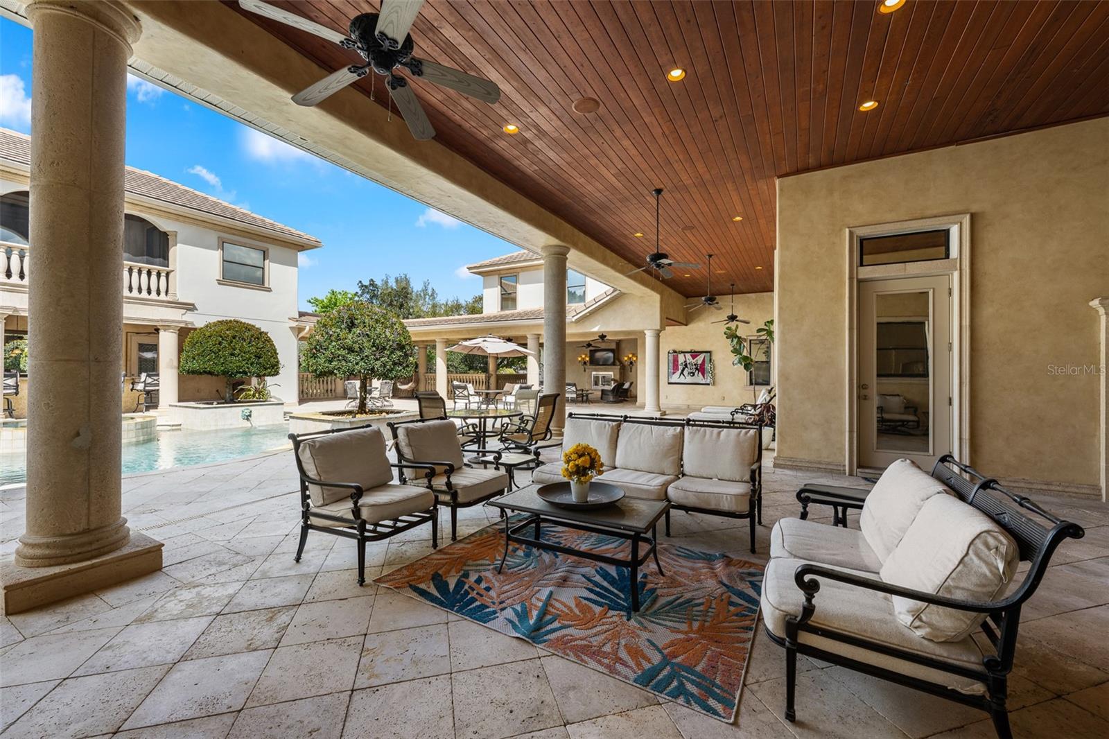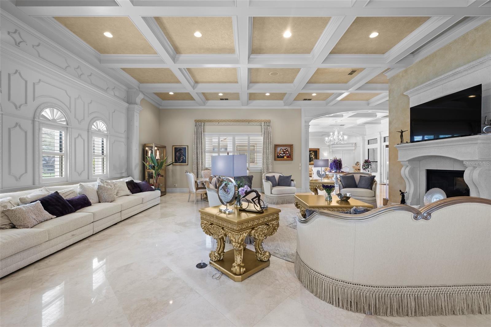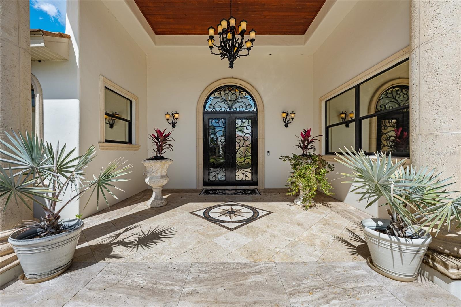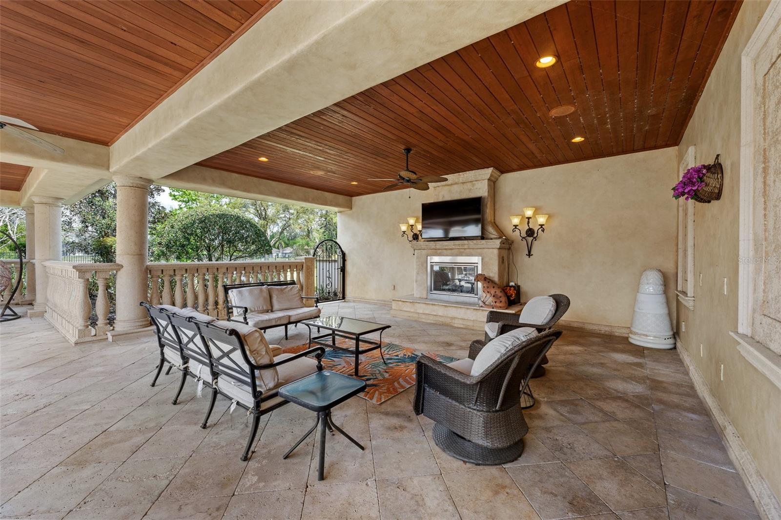 Extraordinary luxury residence situated over 1.4 beautiful acres, offering privacy and discretion, and positioned on a scenic pond. This one-of-one, Mediterranean masterpiece, greets you with a gated, circular driveway centered around a magnificent fountain while offering an astounding floor plan that features a detached guest house, and can be available fully furnished. The interior radiates sophistication, beginning in the grand double door entrance, soaring coffered ceilings throughout the living area, complemented by architectural excellence around every corner, a stunning cast stone double-sided fireplace and endless detailed millwork throughout. A key focal point of this estate is a chef’s culinary dream, featuring a considerable center island anchored by a striking light fixture. This high-end kitchen is equipped for grand-scale entertaining with a 48” Wolf cooktop, a 6-foot GE Monogram hidden panel refrigerator, dual built-in ovens, two dishwashers and a separate pantry room, with glass cabinets and a huge island. The living spaces flow seamlessly, offering multiple gathering and conversation areas, accented by a chic grand piano, formal dining room and a hidden powder bath. Retreat to ultimate privacy with five spacious bedrooms, including two first-level, primary suites both with oversized walk-in showers, deep soaking tubs and multiple built out closets. A grand staircase or elevator will guide the path to the upstairs entertainment area featuring the media room, fitness area/game room flex space, and two additional bedrooms. A separate guest house apartment with private access offers a full kitchen, living room, bedroom, bath and balcony over the courtyard as a secluded haven for visitors. For the automotive enthusiast, an oversized four-car garage gives ample space along with a dedicated storage room within the garage. The estate transforms into a personal resort within the travertine courtyard, featuring a heated pool, spillover spa, and multiple areas for gathering and entertaining. This outdoor space is unmatched, boasting a covered summer kitchen with bistro seating, alongside a separate bar countertop, and two covered areas offering an outdoor fireplace or tv viewing and lots of storage. This scenic space is adjacent to the spacious grass backyard, all of which is fenced and ideal for yard games or pets to play freely. Between Tampa and Lakeland, this residence combines the charm of historic Plant City with the privacy and luxury details of an outstanding estate.