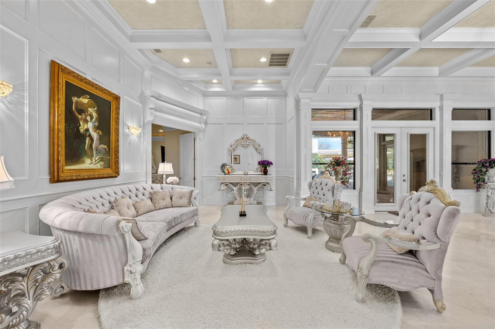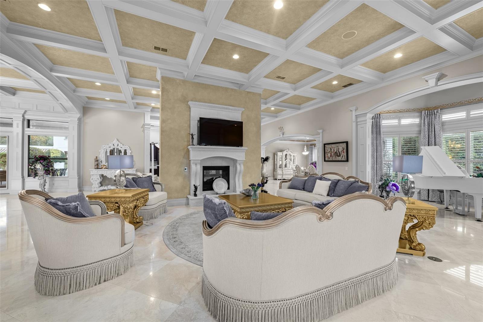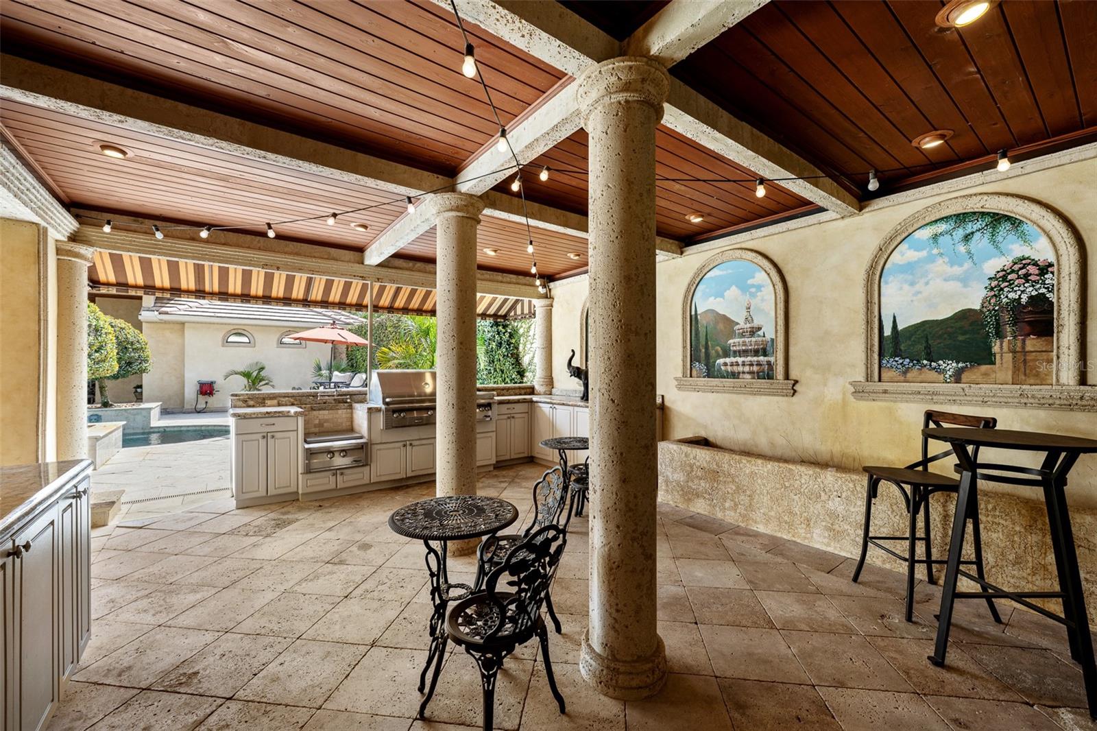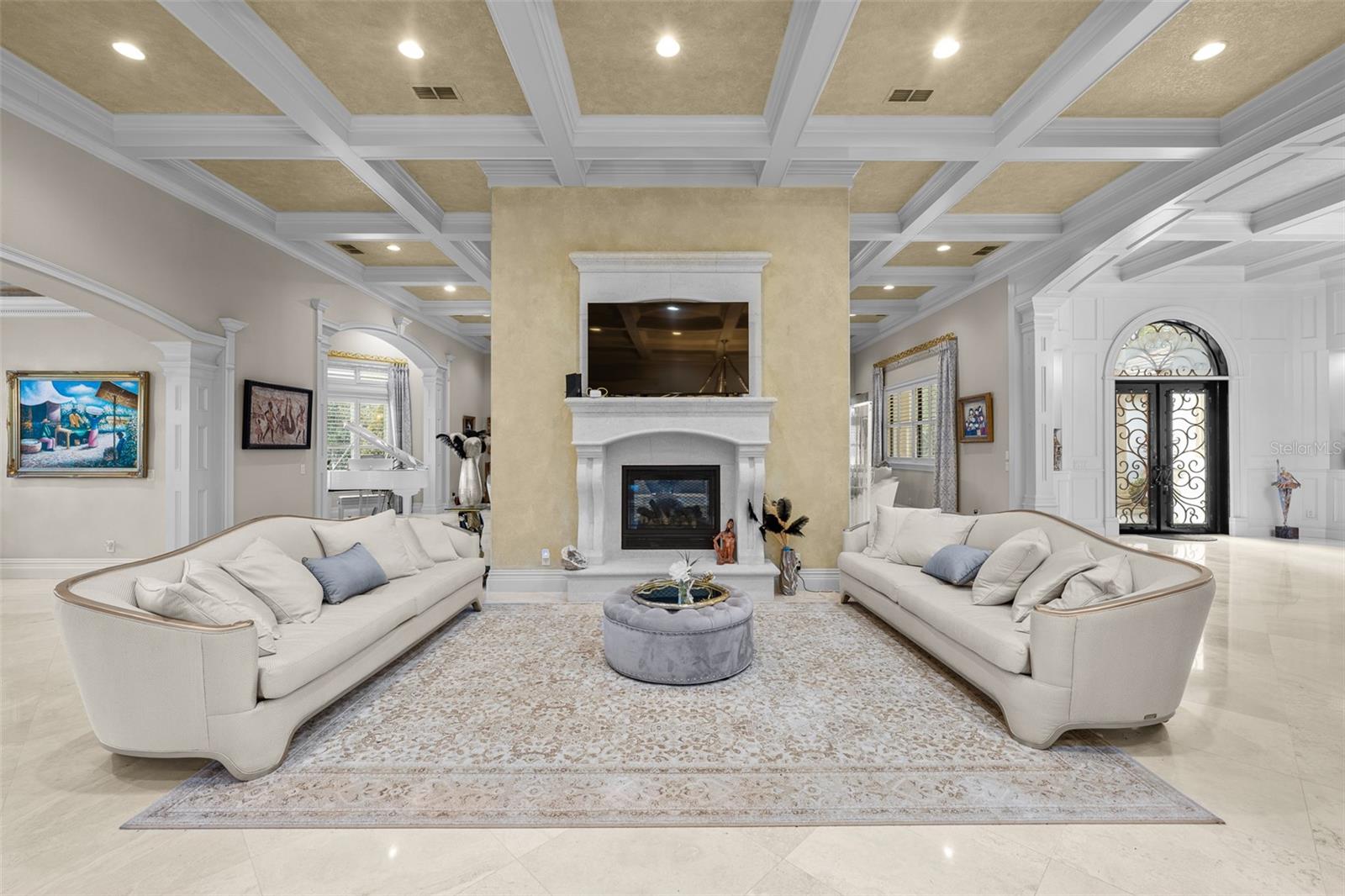 Extraordinary luxury residence situated over 1.4 beautiful acres, offering privacy and discretion, and positioned on a scenic pond. This one-of-one, Mediterranean masterpiece, greets you with a gated, circular driveway centered around a magnificent fountain while offering an astounding floor plan that features a detached guest house, and can be available fully furnished. The interior radiates sophistication, beginning in the grand double door entrance, soaring coffered ceilings throughout the living area, complemented by architectural excellence around every corner, a stunning cast stone double-sided fireplace and endless detailed millwork throughout. A key focal point of this estate is a chef’s culinary dream, featuring a considerable center island anchored by a striking light fixture. This high-end kitchen is equipped for grand-scale entertaining with a 48” Wolf cooktop, a 6-foot GE Monogram hidden panel refrigerator, dual built-in ovens, two dishwashers and a separate pantry room, with glass cabinets and a huge island. The living spaces flow seamlessly, offering multiple gathering and conversation areas, accented by a chic grand piano, formal dining room and a hidden powder bath. Retreat to ultimate privacy with five spacious bedrooms, including two first-level, primary suites both with oversized walk-in showers, deep soaking tubs and multiple built out closets. A grand staircase or elevator will guide the path to the upstairs entertainment area featuring the media room, fitness area/game room flex space, and two additional bedrooms. A separate guest house apartment with private access offers a full kitchen, living room, bedroom, bath and balcony over the courtyard as a secluded haven for visitors. For the automotive enthusiast, an oversized four-car garage gives ample space along with a dedicated storage room within the garage. The estate transforms into a personal resort within the travertine courtyard, featuring a heated pool, spillover spa, and multiple areas for gathering and entertaining. This outdoor space is unmatched, boasting a covered summer kitchen with bistro seating, alongside a separate bar countertop, and two covered areas offering an outdoor fireplace or tv viewing and lots of storage. This scenic space is adjacent to the spacious grass backyard, all of which is fenced and ideal for yard games or pets to play freely. Between Tampa and Lakeland, this residence combines the charm of historic Plant City with the privacy and luxury details of an outstanding estate.