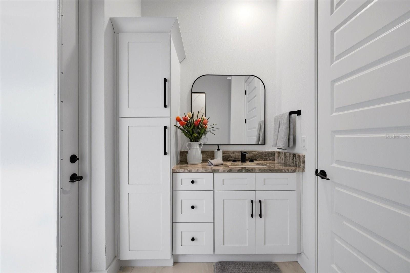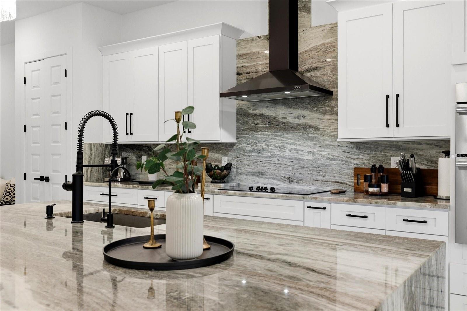Contemporary luxury home designed for living and entertaining, featuring a private office, full home theater, and a versatile game room/gym that can easily serve as a guest suite or 5th bedroom. The spa-inspired owner’s suite offers a private retreat with sitting area, dual custom walk-in closets, and direct access to the backyard. The owner’s bathroom is designed for relaxation, featuring a Jacuzzi tub, dual showerheads, private water closet, and dual vanities with a dedicated makeup station. The chef’s kitchen is the heart of the home, showcasing a waterfall stone island, 36-inch cooktop, built-in oven and microwave, and a spacious walk-in pantry—perfect for everyday living and hosting. Enjoy seamless indoor-outdoor living with sliding glass doors leading to oversized front and rear porches with custom wood ceilings, plus a fully equipped outdoor kitchen ideal for entertaining while enjoying breathtaking sunset views. Each additional bedroom is generously sized with its own private bathroom, complemented by high ceilings and 8-foot interior doors throughout. Additional highlights include an iron double-door entry, a striking foyer with stone accents, natural elements, and a modern chandelier, as well as a spacious laundry room with ample storage. All designer chandeliers convey. The 3-car garage offers flexibility to accommodate up to 4 vehicles and includes built-in storage. A paver driveway extends from the entrance, enhancing curb appeal and functionality. No HOA. No CDD. Enjoy privacy, space, and luxury living in a peaceful setting.