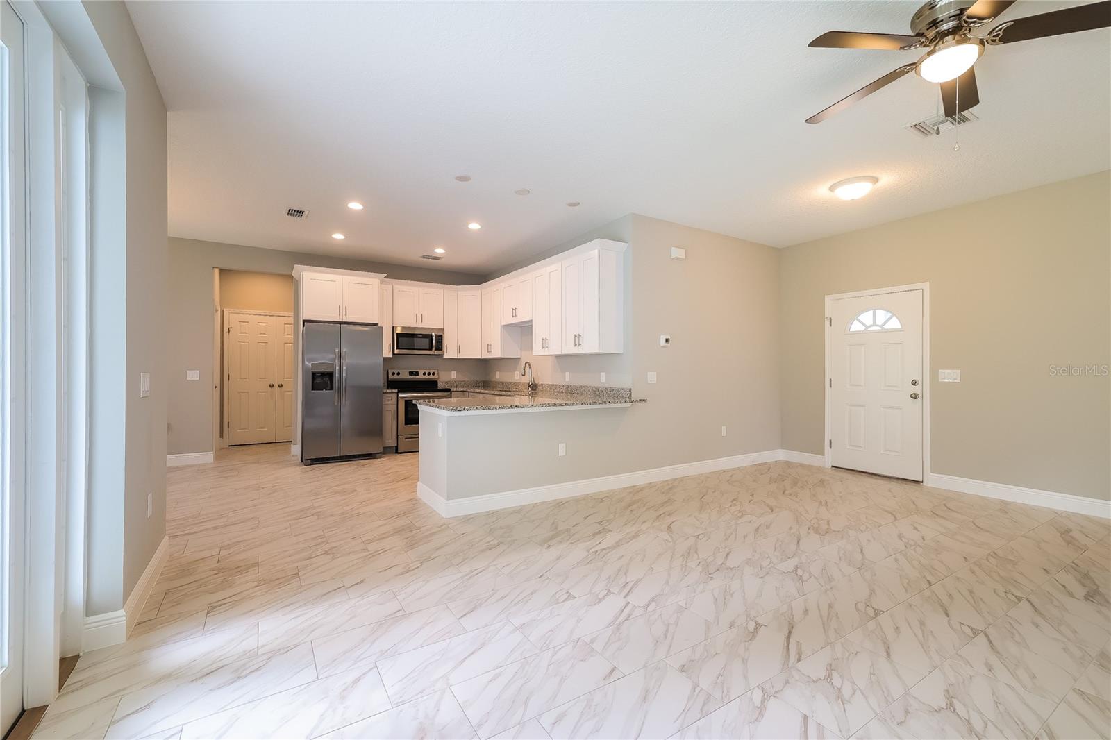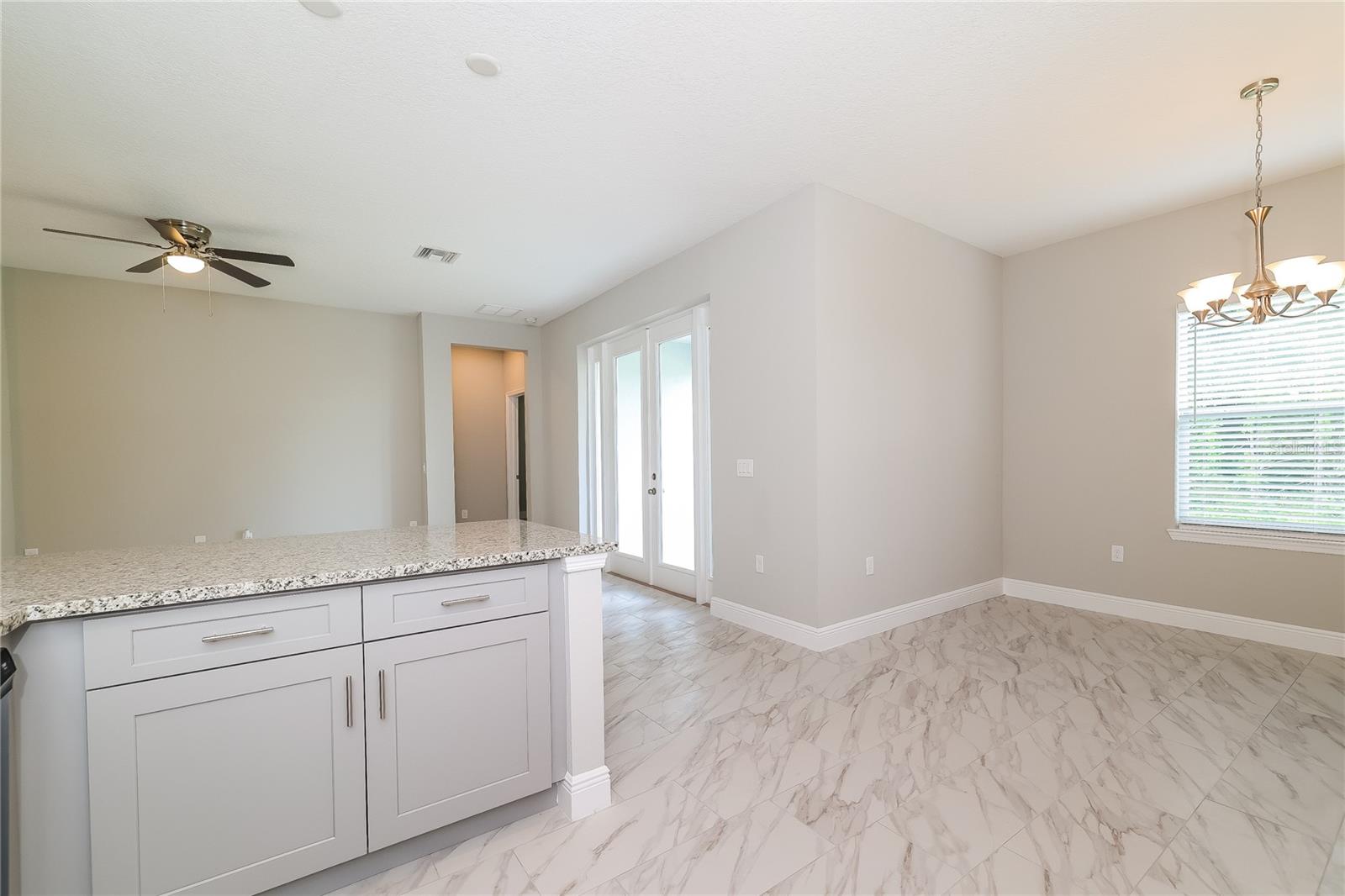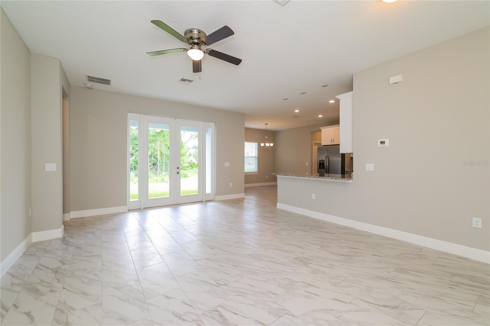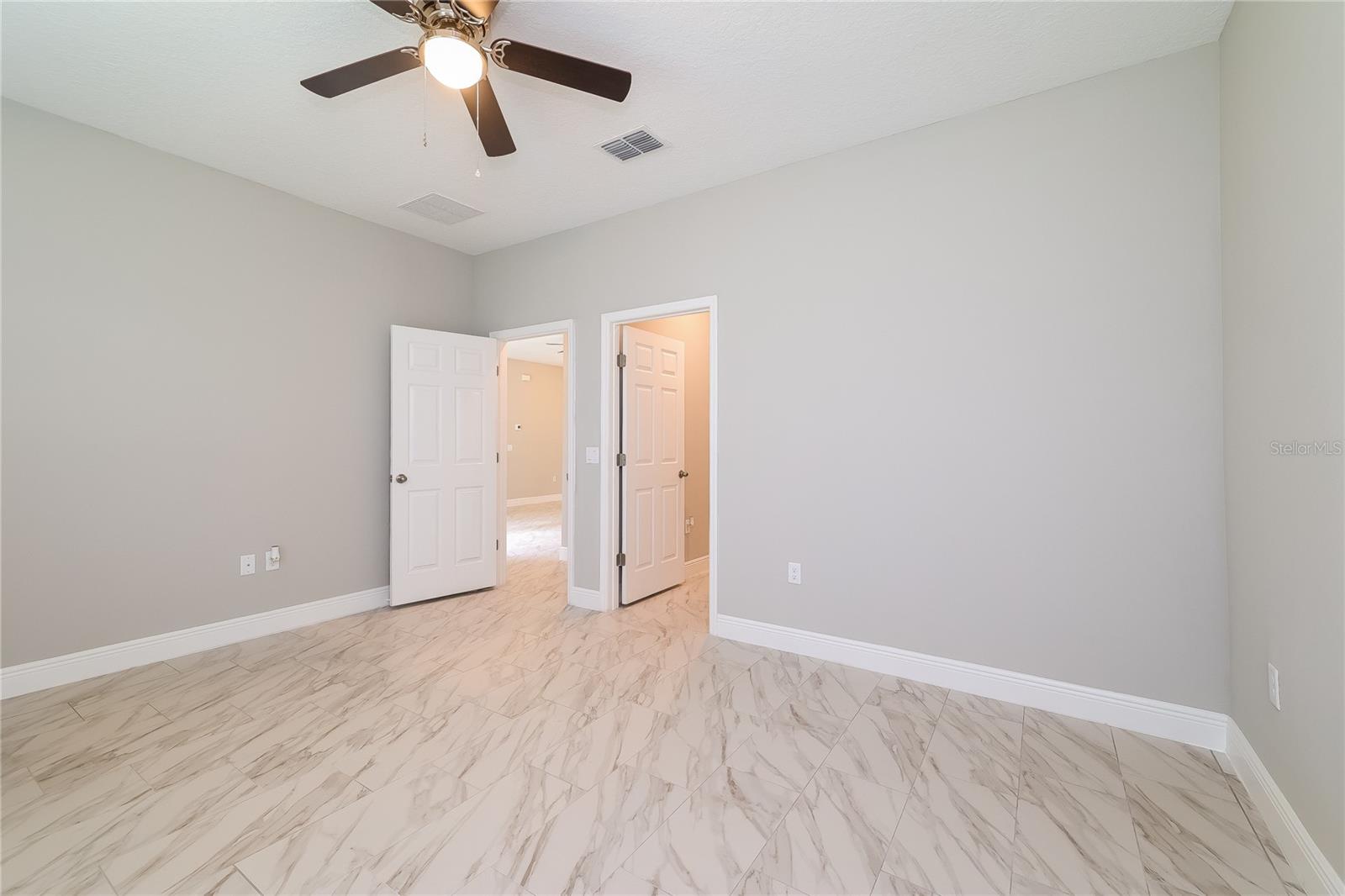 This spacious single-story 3-bedroom, 2-bathroom home with a 2-car garage and covered lanai is not to be missed. Featuring a seamless flow from the living room to the dining area and kitchen, which features ample counter space, a closet pantry, and natural light throughout sliding glass doors leading to a covered back patio. The master bedroom offers privacy with dual sinks, a large shower enclosure, a generous walk-in closet, and additional linen storage. Other features include granite countertops, stainless steel appliances, ceiling fans, and tile flooring throughout.