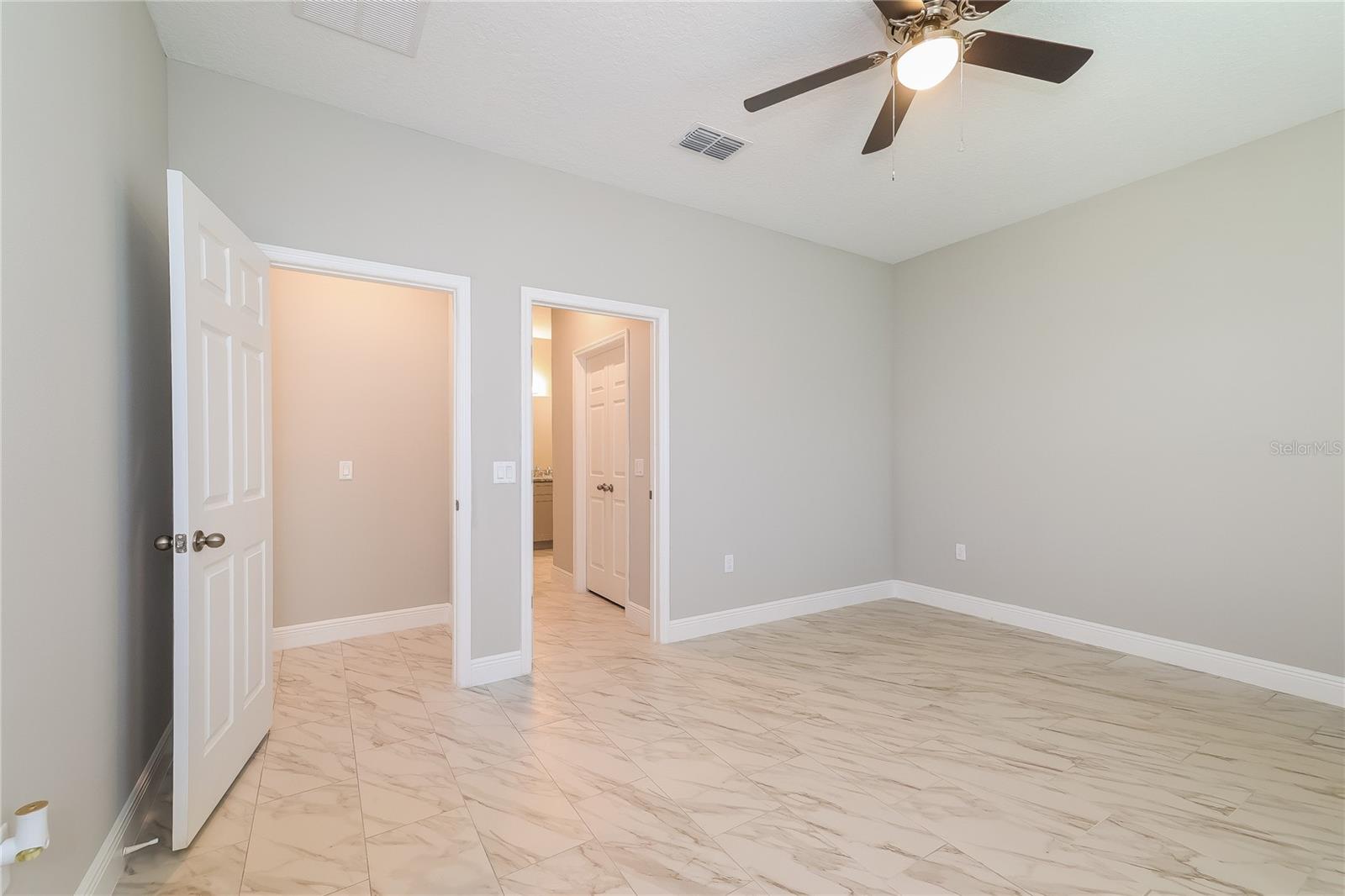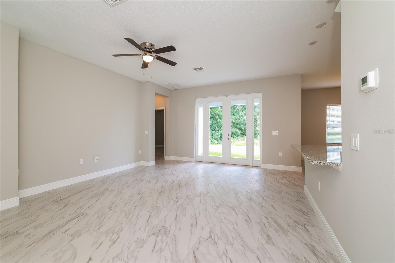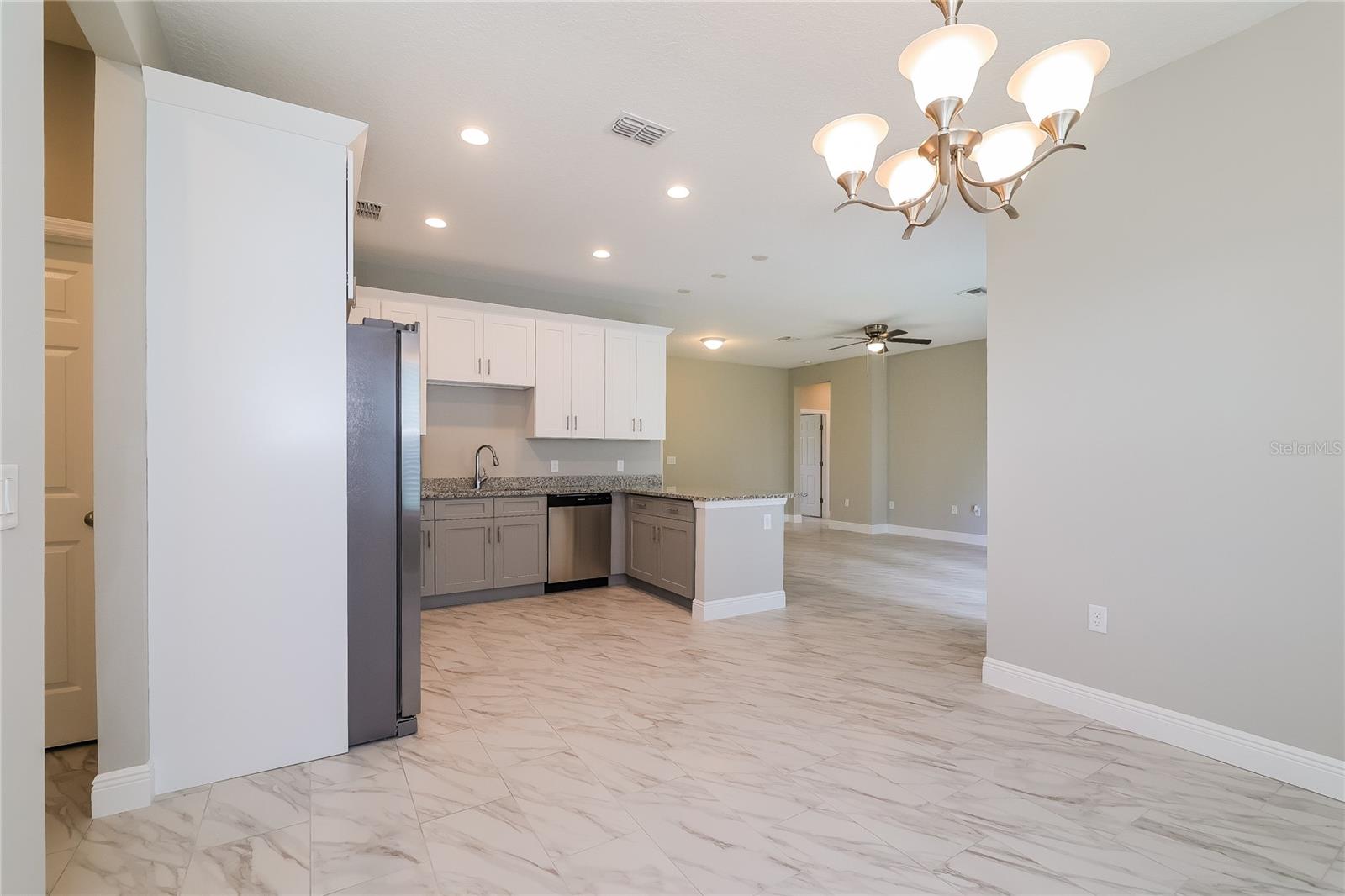 This spacious single-story 3-bedroom, 2-bathroom home with a 2-car garage and covered lanai is not to be missed. Featuring a seamless flow from the living room to the dining area and kitchen, which features ample counter space, a closet pantry, and natural light throughout sliding glass doors leading to a covered back patio. The master bedroom offers privacy with dual sinks, a large shower enclosure, a generous walk-in closet, and additional linen storage. Other features include granite countertops, stainless steel appliances, ceiling fans, and tile flooring throughout.