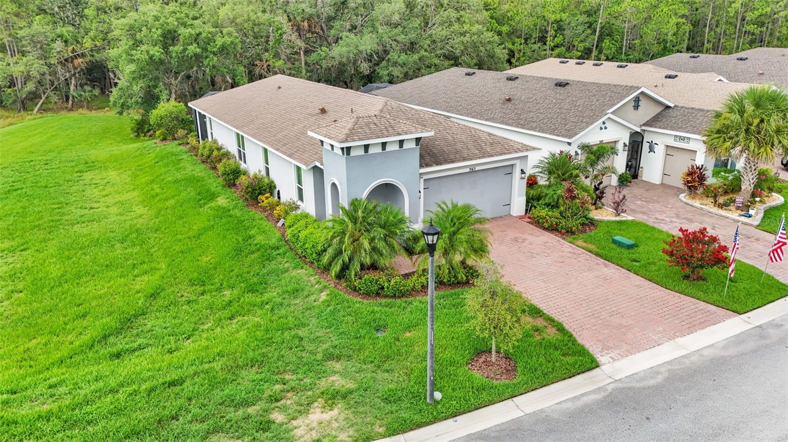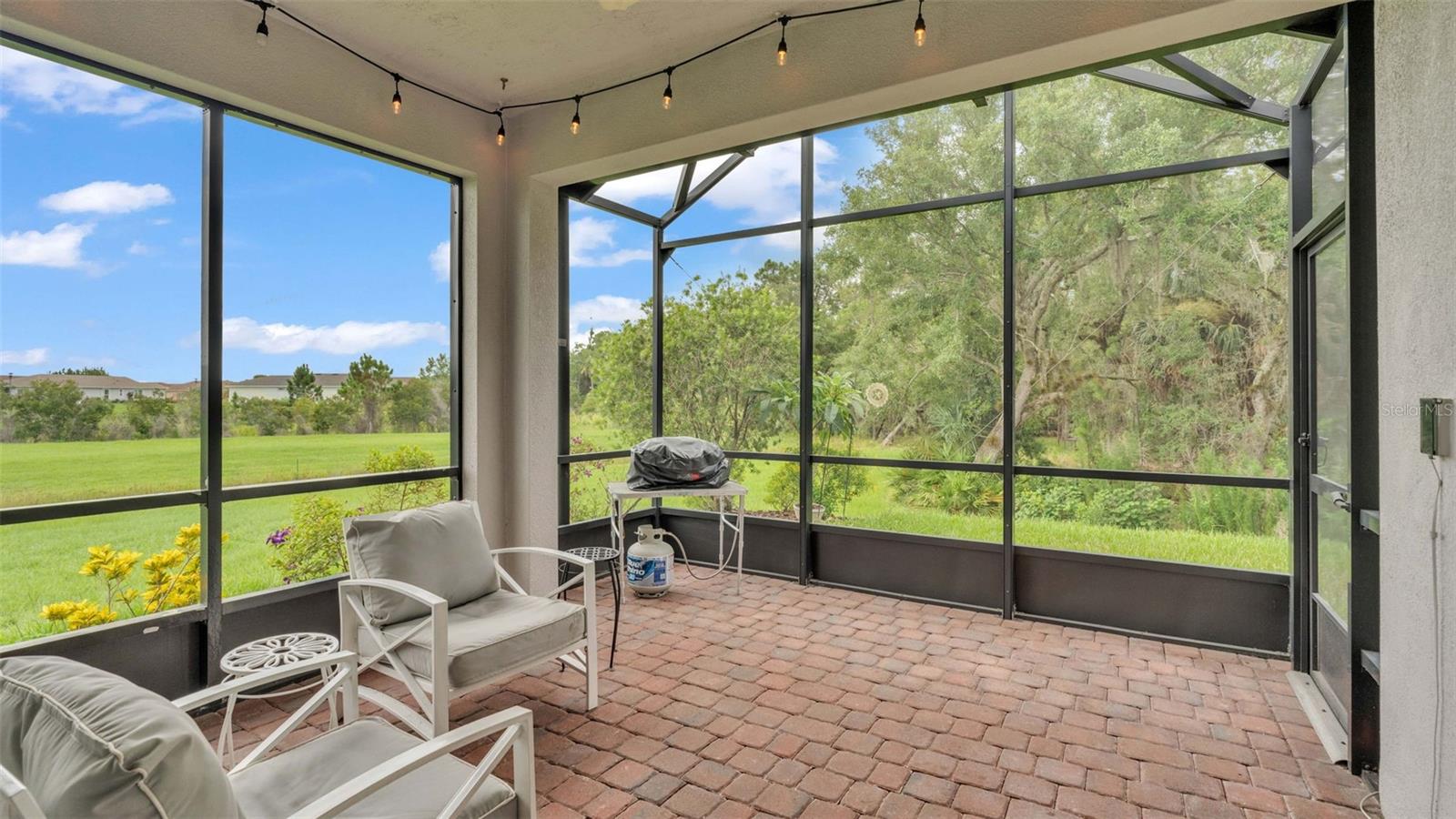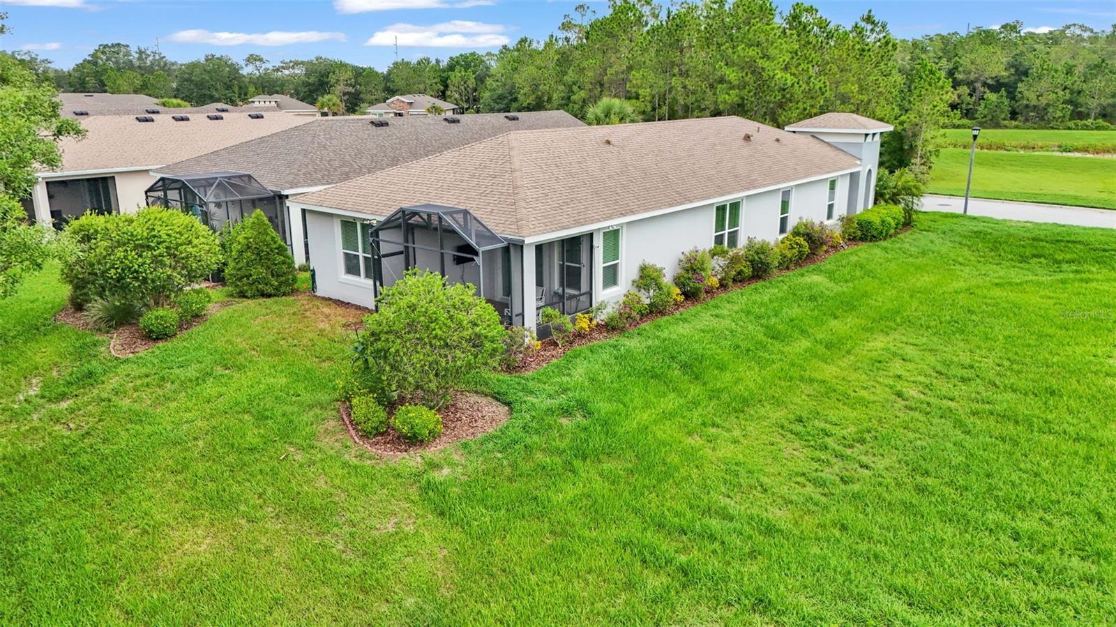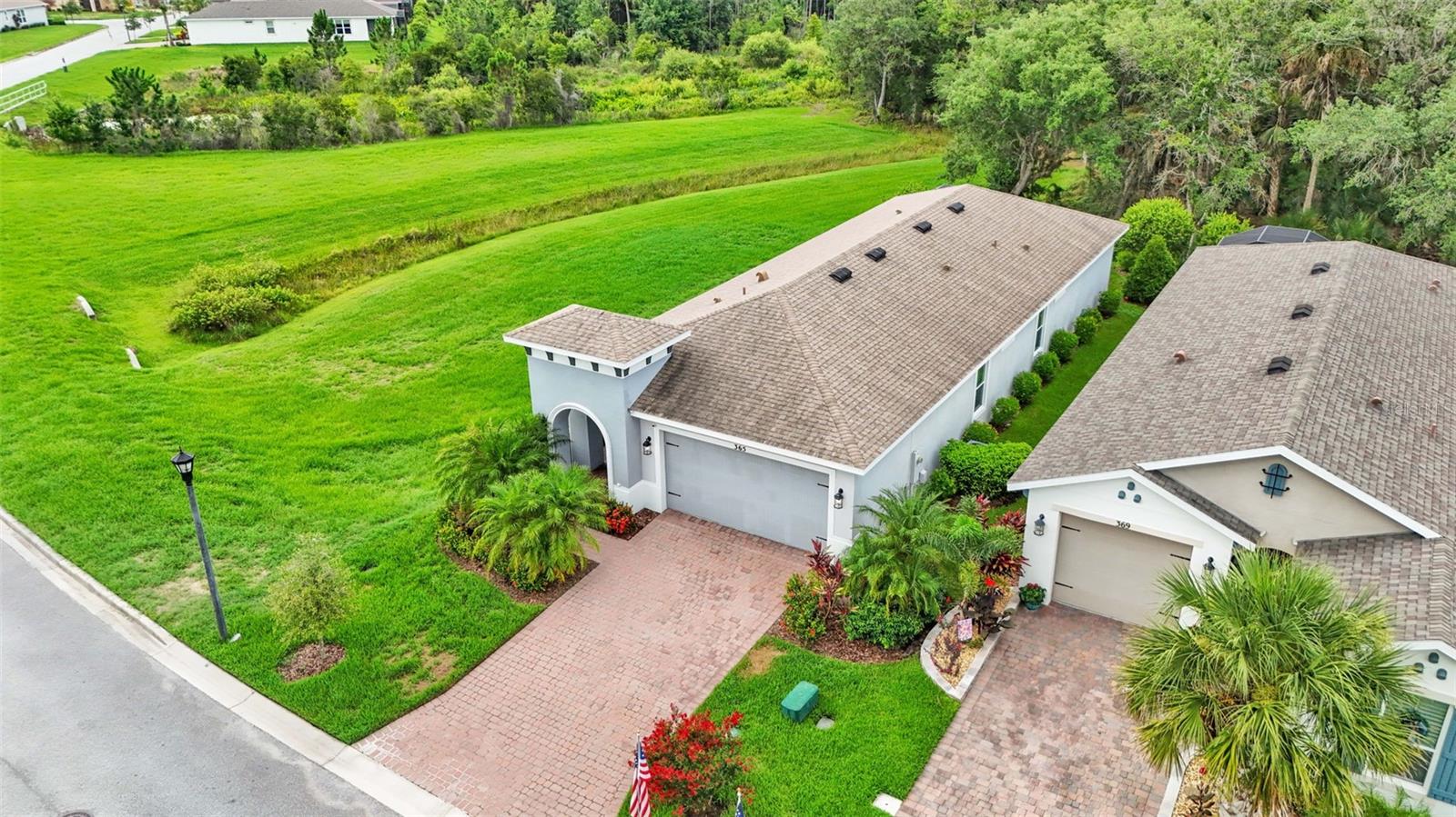 Welcome to this impeccably maintained Brescia Model home, part of the desirable Garden Series Collection, offering 1,703 sq. ft. of comfortable living space. Nestled on a prime lot with no rear-facing (south) or side (east) neighbors, this home provides unparalleled privacy and tranquility. Enjoy the serene wooded conservation area and breathtaking sunrises from your backscreen lanai. This quiet haven even offers views of SpaceX launches! Key Features: Spacious Living: The model features 8’ doors throughout, a large master bedroom with an en-suite master bath, dual sinks, and a walk-in shower. Versatile Den: The spacious den/office/study can be used as an additional bedroom, craft room, music room, or man cave. Interior Highlights: Modern Kitchen: Quartz countertops, upgraded dishwasher and garbage disposal, and a large walk-in pantry. Pre-wired Convenience: Pendant lighting and dining room fan/light wiring, plus cable connections in all rooms. Functional Laundry Room: Includes cabinets for extra storage. Safety Features: Grab bars in the master bath. Exterior Highlights: Garage Upgrades: Epoxy finish on the two-car garage floor, golf cart electrical outlets. Enhanced Structure: Foam-infused cinder block construction. Security & Lighting: Outlets in soffits for security and decorative lights, upgraded landscaping maintained by HOA, rear floodlights, crystalline front door insert, and hose bibs on each corner. Water Softener: Digitally controlled for your convenience. Optional Extras: Interior furniture can be included with the transaction. Enjoy the 55+ Lifestyle Experience the vibrant, award-winning, gated 55+ golf course community in sunny Central Florida. This community spans 4,300 acres of wooded conservation area and offers: Recreation: Two 18-hole golf courses, 14 swimming pools, tennis courts, pickleball, softball, bocce ball, and horseshoes. Social: Over 250 clubs and groups, a butterfly garden, dog parks, and three on-site restaurants. Convenience: Easy access to theme parks, airports, and both the east and west coasts. HOA: The HOA fees include lawn care and TV/fiber internet. Don’t miss this opportunity to enjoy all that Central Florida has to offer. Schedule your private showing today!