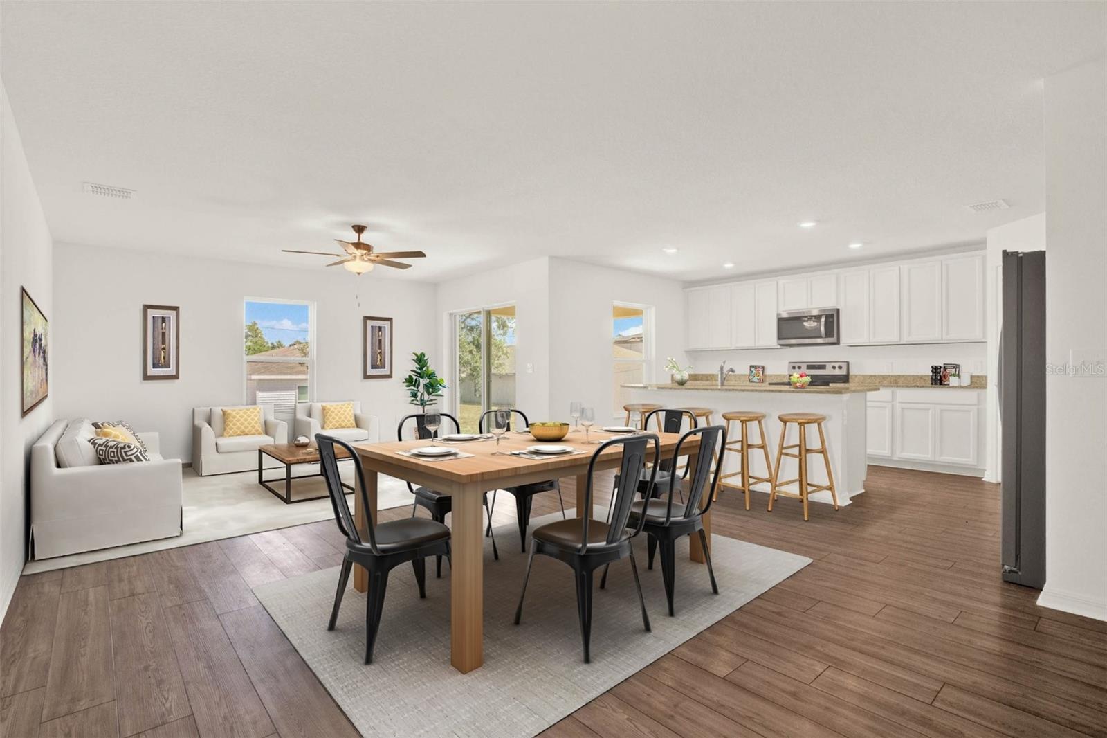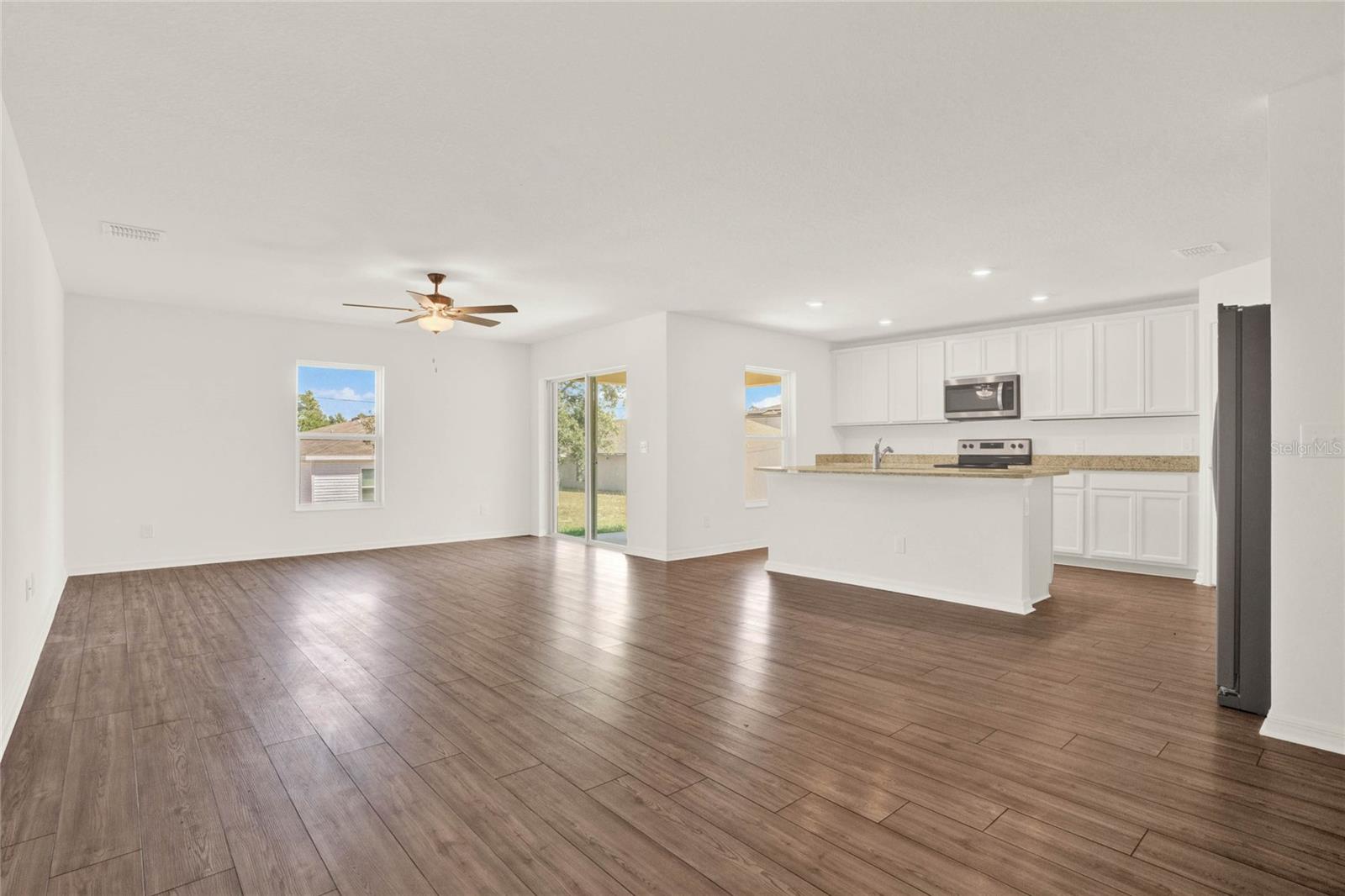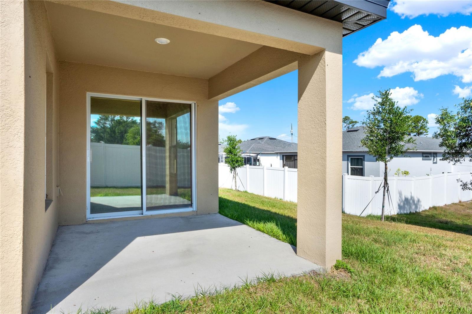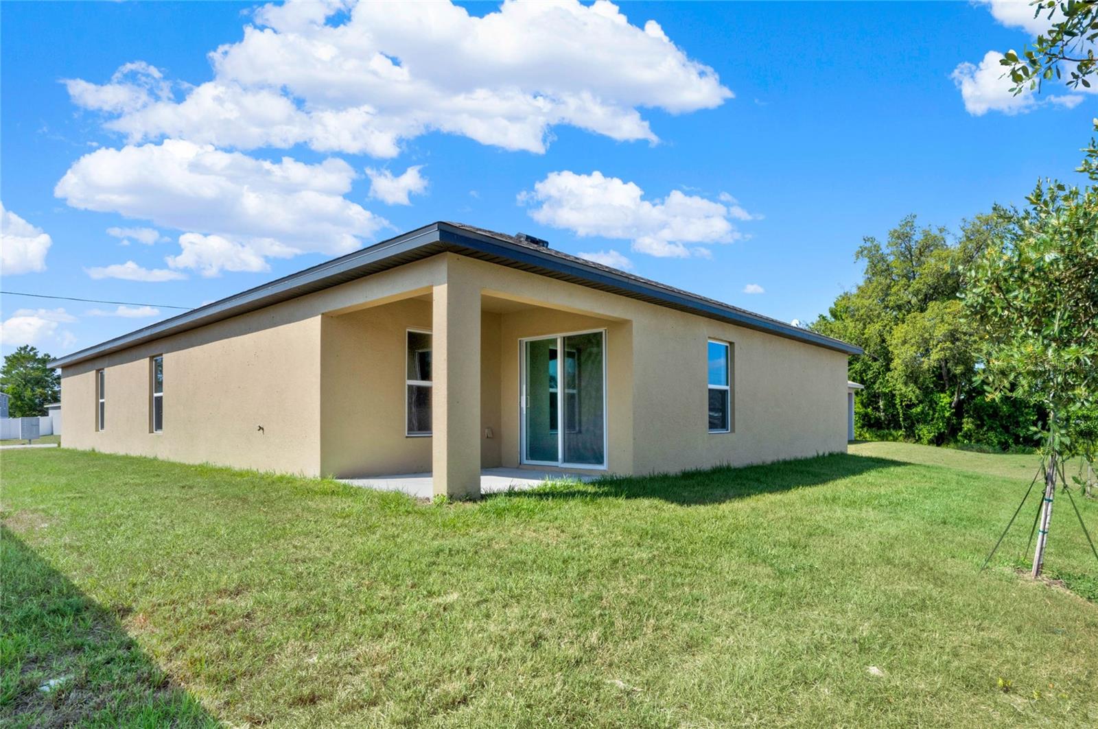 One or more photo(s) has been virtually staged. Nestled in a tranquil neighborhood, this pristine 5-bedroom, 3-bathroom home, built in 2023 and never lived in, offers modern comfort and style. Boasting 1,984 sq ft of living space, the open layout of the living room, dining room, and kitchen welcomes you with high ceilings and abundant natural light. The kitchen features stainless steel appliances and an extra-large island with space for a breakfast bar, perfect for enjoying those quick meals with your loved ones. All bedrooms offer ample storage, natural light, and space, ensuring everyone feels right at home. Retreat to the master bedroom with its spacious walk-in closet and luxurious en suite bathroom featuring a dual vanity. Outside, the shaded patio beckons for relaxation in the warm Florida weather, while the spacious backyard provides somewhere the littles ones can play freely. With parks, lakes, and nature preserves nearby, there's no shortage of outdoor activities. Just a short drive to Walt Disney World, this home offers the perfect blend of tranquility and convenience. Additionally, this home offers peace of mind with some transferable builder warranty. Don't miss out on this gorgeous home, schedule your private showing TODAY!!!
