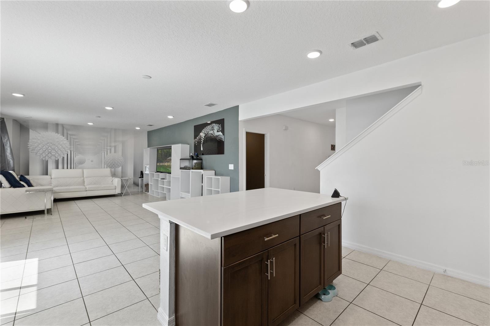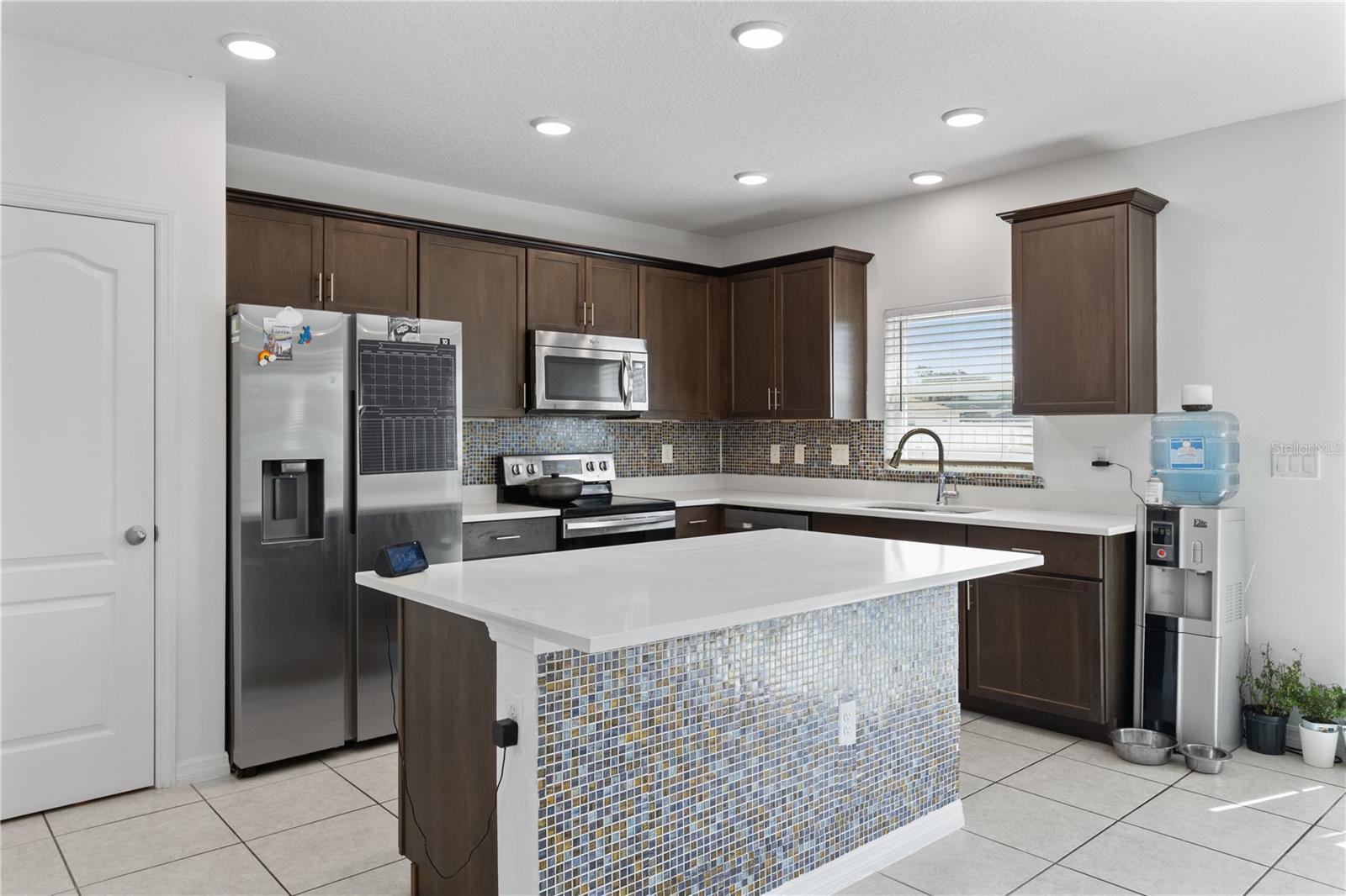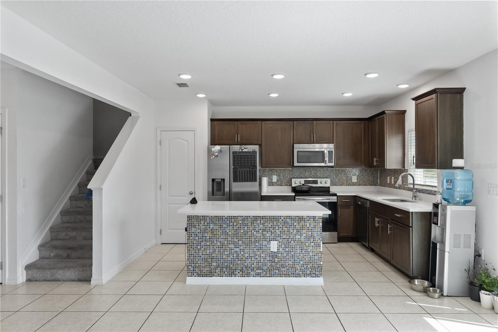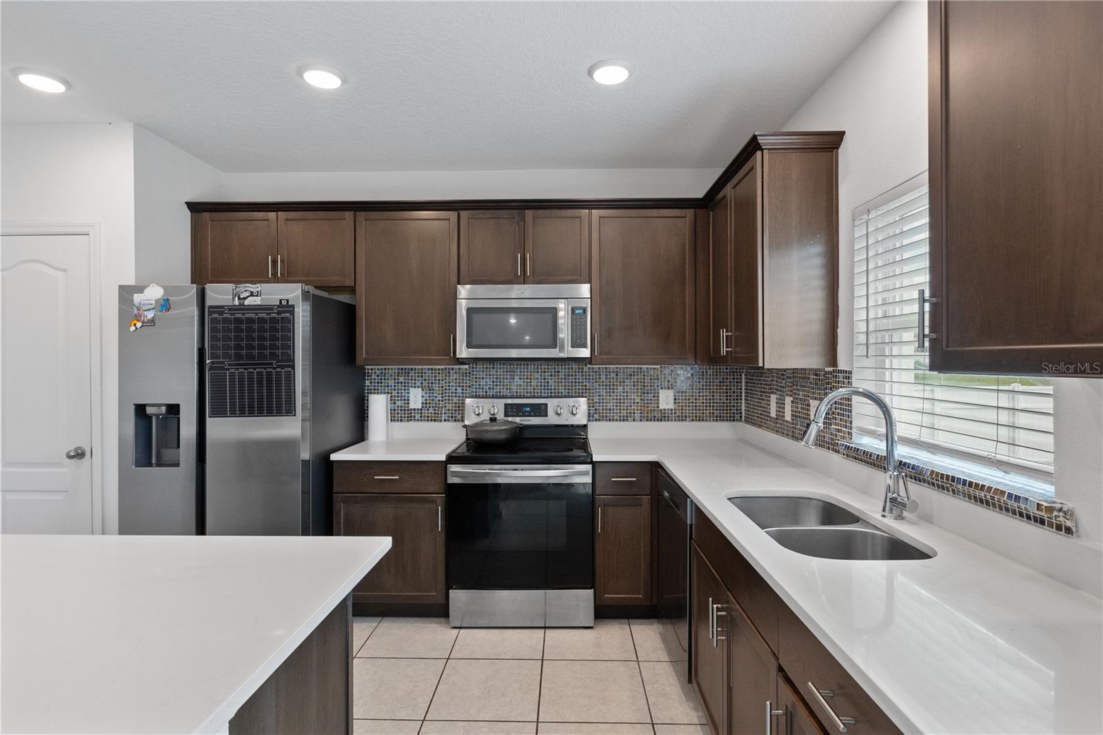 Built in 2020, this spacious 5 bedroom, 3 bath home is move-in ready! Beautiful kitchen with quartz countertops, stainless steel appliances, and plenty of cabinets make meal prep a dream. One bedroom and a full bath on first floor, plus a versatile partially-finished garage space that could be used as an office, workout space, or extra storage. Upstairs you will find a spacious master bedroom with a walk-in closet, full attached bathroom, with a double vanity. Three additional bedrooms, a full bathroom, and second-floor laundry make this convenient layout complete. Enjoy super-low electricity bills thanks to solar panels that will transfer to the new owner for only $193/mo. Located on the Kissimmee / Poinciana line in Polk. Co. Low HOA includes internet. Don't miss out!