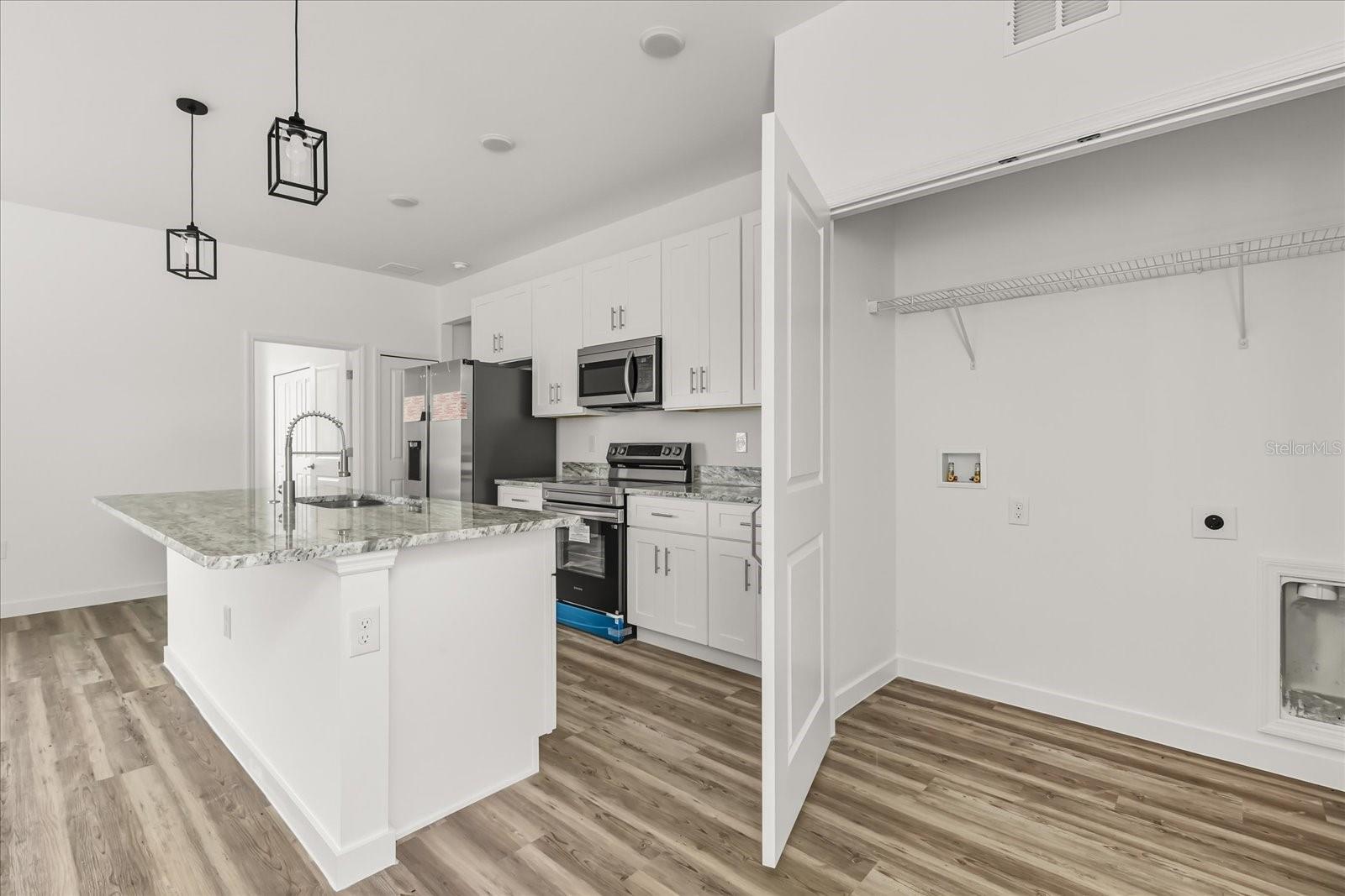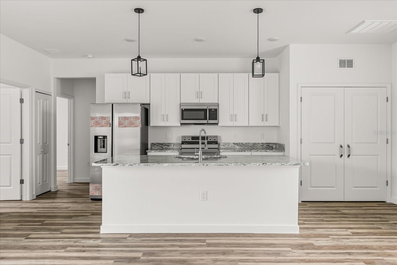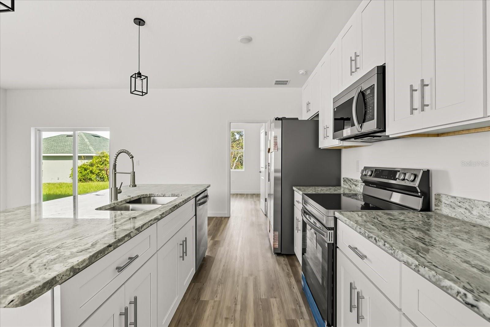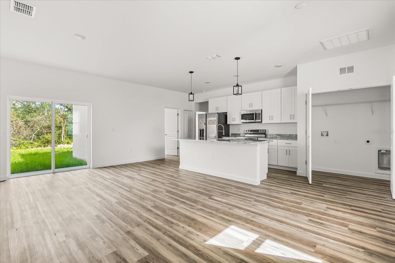 One or more photo(s) has been virtually staged. Unique opportunity to buy this new construction home with $10,000 towards your closing costs (when using the Builder's Lender) or LEASE THIS PROPERTY UNTIL MARCH/2026 FOR $2200/ MONTH AND 50% OF THIS AMOUNT GOING TOWARDS THE PURCHASE. This stunning new construction single-family home was built in 2025 and offers the perfect blend of modern luxury and functional design. Tons of upgrades come included! Experience an open floor plan with high ceilings and luxury vinyl wood flooring throughout, creating a bright and inviting atmosphere. The spacious kitchen features white shaker-style cabinets, stainless steel appliances—including an upgraded fridge with ice dispenser—and granite countertops. The large island seamlessly integrates with the family room, which opens to sliding doors leading to a generous backyard, ideal for outdoor entertaining. The primary bedroom, thoughtfully positioned on the left side of the house for extra privacy, boasts a walk-in closet with charming barn doors. The en-suite bathroom includes a double vanity with granite countertops, a luxurious oversized shower, and elegant porcelain tiles. The guest bedrooms on the right side are spacious enough to accommodate queen-sized beds and feature built-in closets for ample storage. All bedrooms are designed for comfort and convenience. Additional highlights include a laundry closet in the kitchen. The property offers a 2-car garage, perfect for parking and storage. Close to Poinciana Amenity center, where residents enjoy resort-style amenities such as a community pool, spa, fitness room, basketball and tennis courts, and a clubhouse. The community's location is unmatched, with a new commercial development just one block away, and Poinciana Towne Center only 9 miles away, featuring restaurants, shops, and essential services. Don’t miss out on this exceptional opportunity!