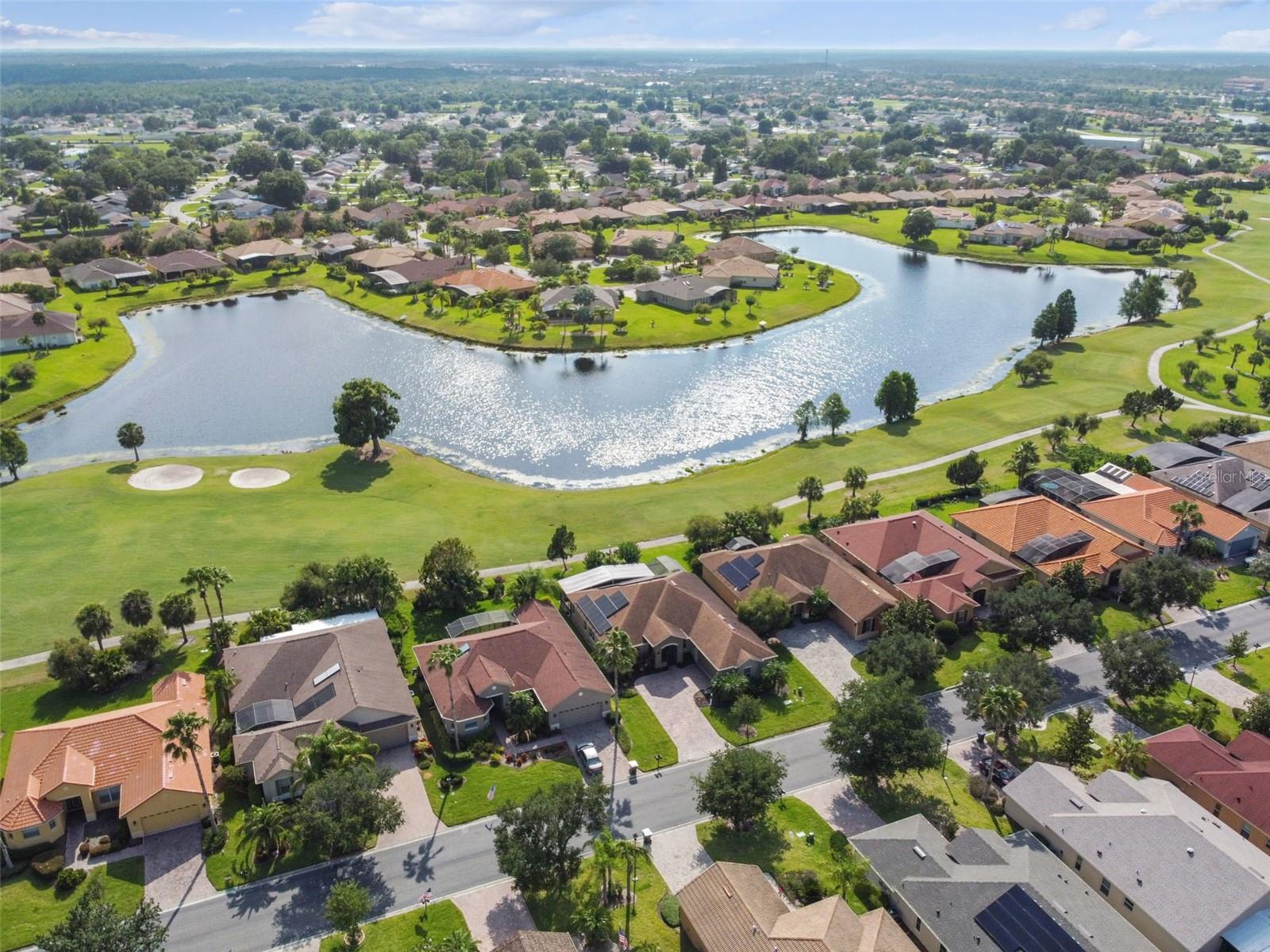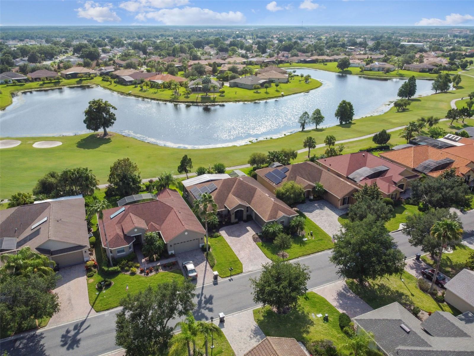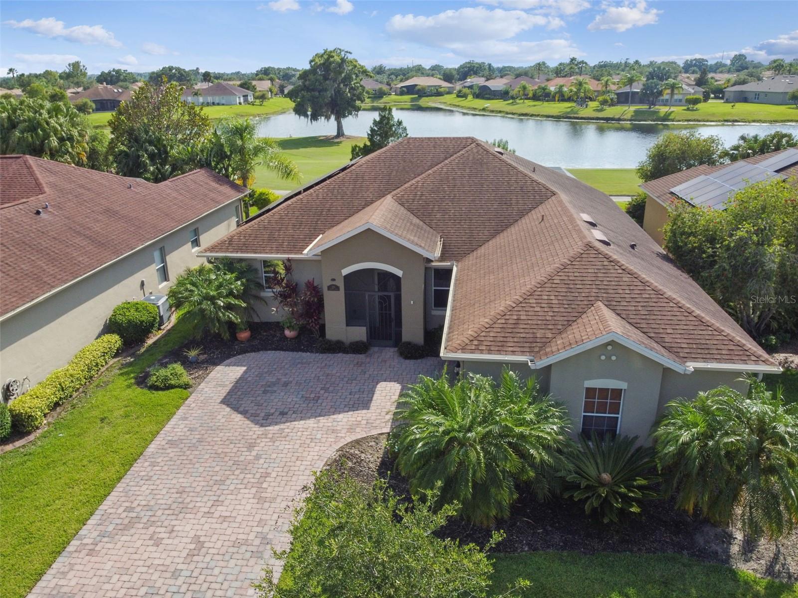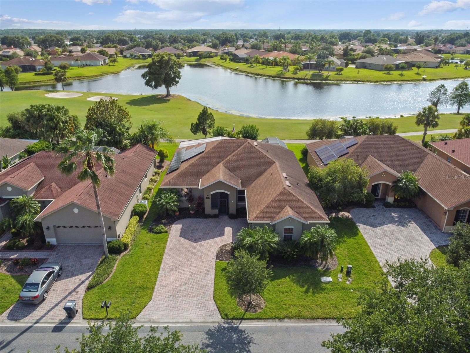 Check out this beautiful and well maintained Savoy model. This home is loaded with upgrades. Starting in the Kitchen you have 42" wood cabinets with pull out drawers in bottom cabinets. Granite counter tops with glass backsplash. Stainless steel appliances upgraded in 2019. New frosted glass pantry and laundry doors. New garbage disposal. Laundry room is off the Kitchen with washer / dryer and upper cabinets for convenience. Chair rails in living area. New 5 1/4" baseboards, Crown Molding and rounded corners throughout this home. New large moldings around the newly installed windows (2020), Picture window in Dining room and picture / sliders in Master bedroom and 2nd bedroom. The Master bathroom, Jack and Jill bathroom and the 1/2 bathroom have all been beautifully and thoughtfully remodeled. 24x24 Porcelain tile in every room. All newer installed ceiling fans and light fixtures. Pelican water softener installed in 2020. Water heater replaced in 2022. Take stunning photographs or just lounge on the expansive Lanai (added in 2018) that overlooks the gorgeous Golf course and Pond. A/C replaced in 2020. Roof replaced in 2017. Solar Panels installed in 2020 (will be paid off in full at closing). Electric bill is $33.87 each month.....Seller is motivated.....Call to view this incredible Home that could be yours in 2024.