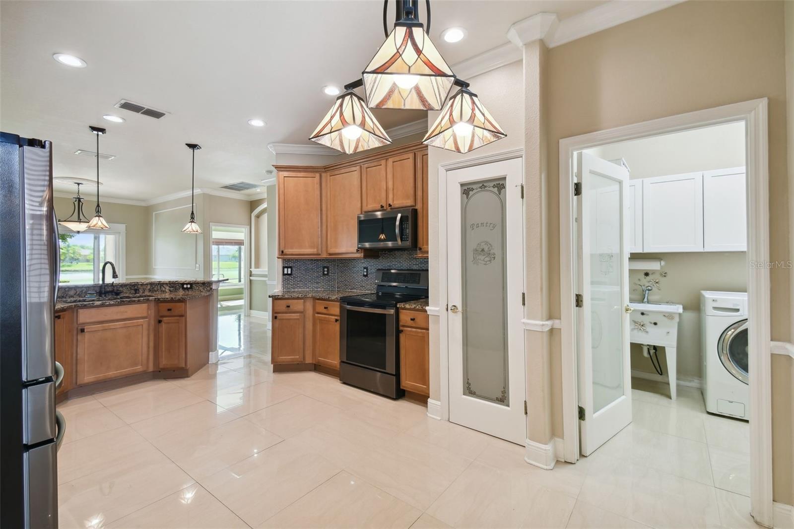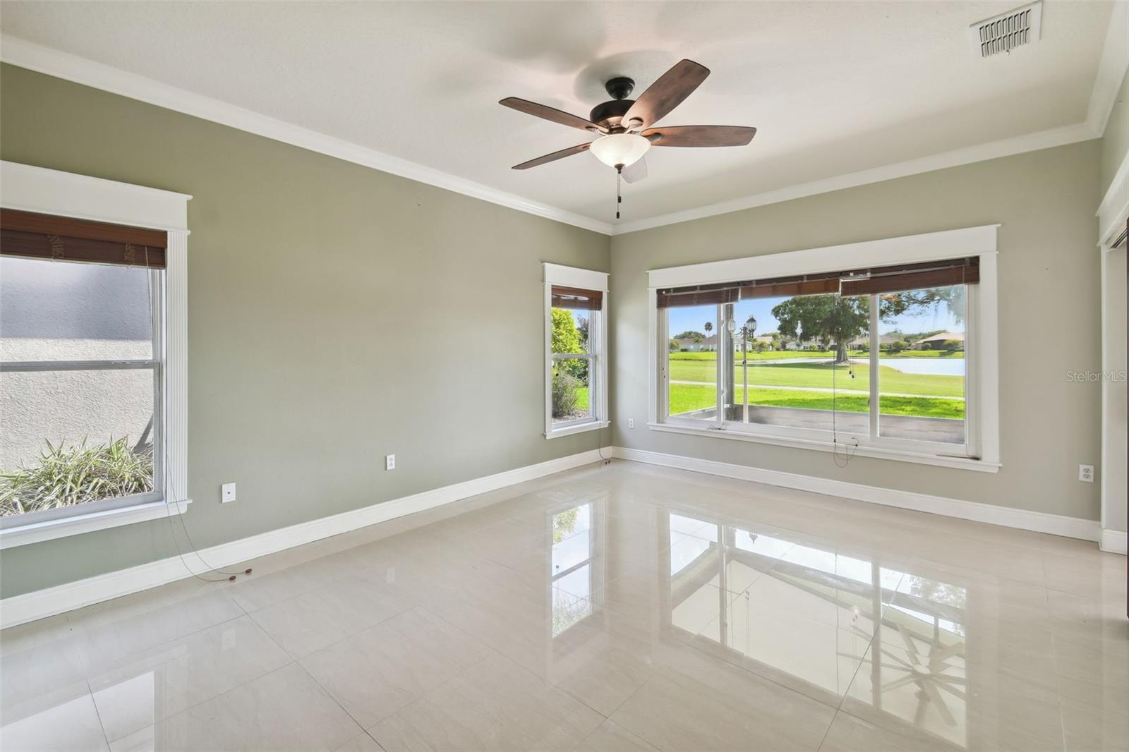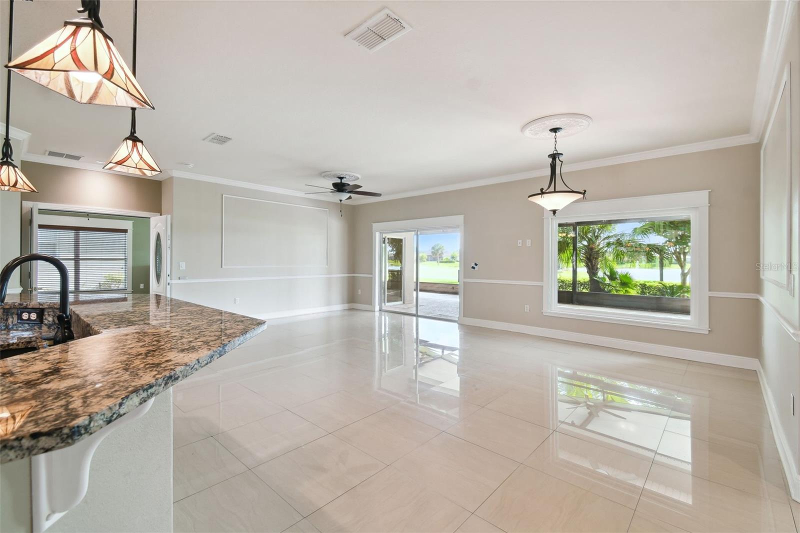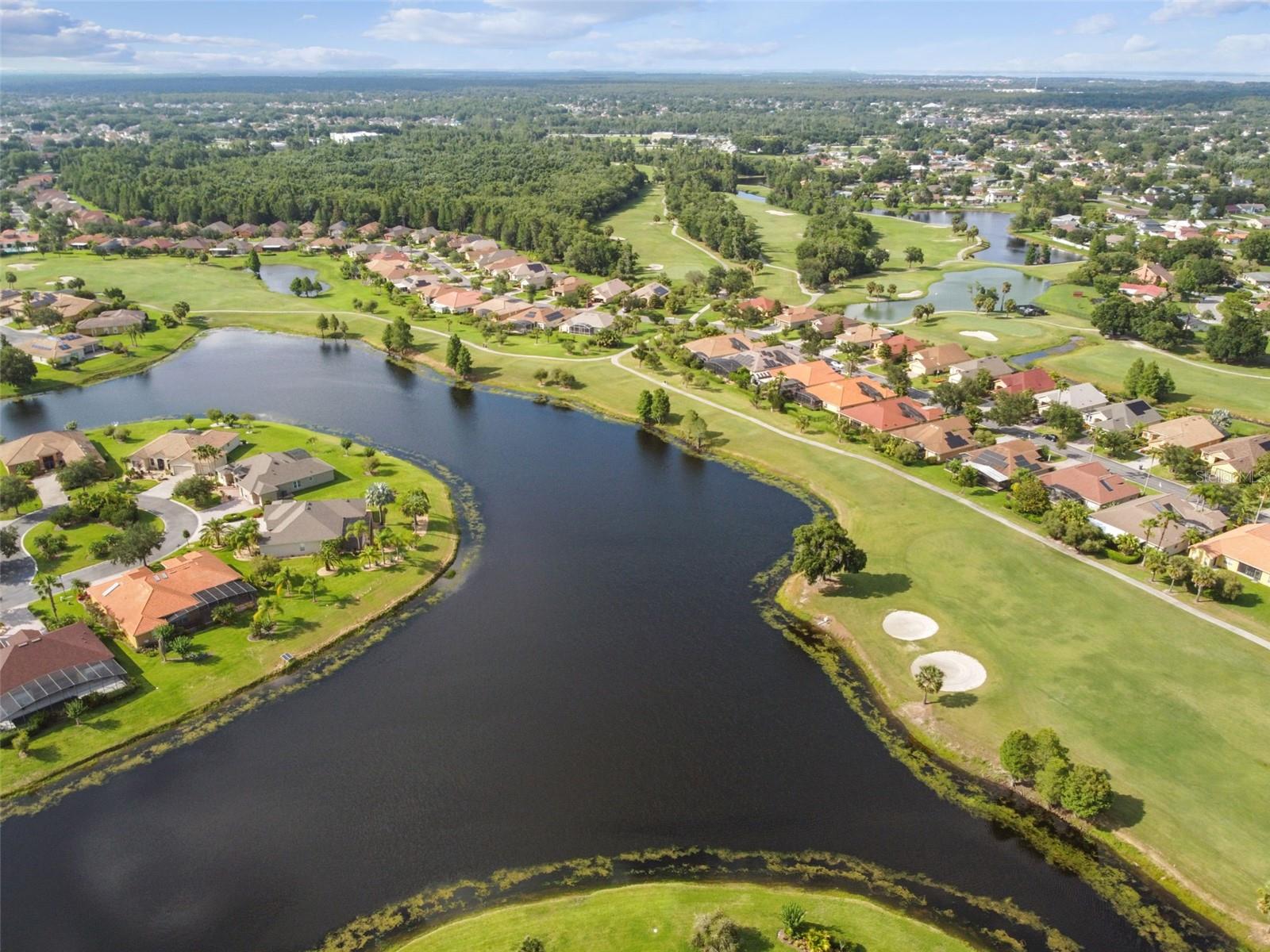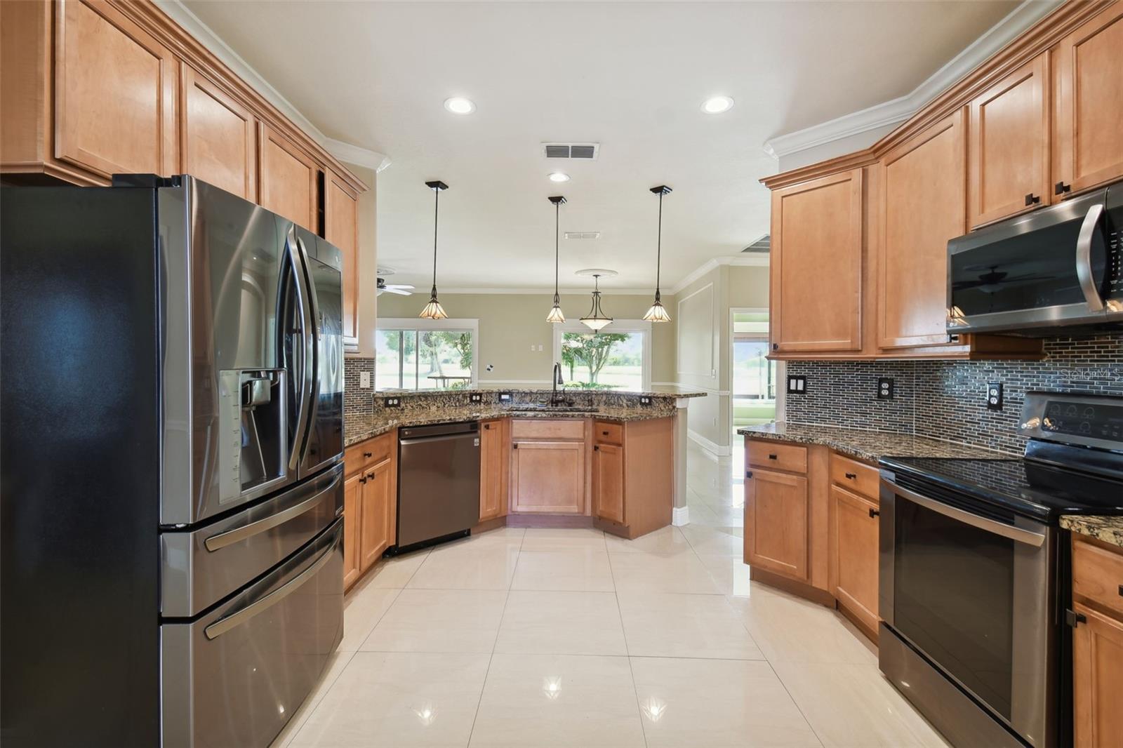 Check out this beautiful and well maintained Savoy model. This home is loaded with upgrades. Starting in the Kitchen you have 42" wood cabinets with pull out drawers in bottom cabinets. Granite counter tops with glass backsplash. Stainless steel appliances upgraded in 2019. New frosted glass pantry and laundry doors. New garbage disposal. Laundry room is off the Kitchen with washer / dryer and upper cabinets for convenience. Chair rails in living area. New 5 1/4" baseboards, Crown Molding and rounded corners throughout this home. New large moldings around the newly installed windows (2020), Picture window in Dining room and picture / sliders in Master bedroom and 2nd bedroom. The Master bathroom, Jack and Jill bathroom and the 1/2 bathroom have all been beautifully and thoughtfully remodeled. 24x24 Porcelain tile in every room. All newer installed ceiling fans and light fixtures. Pelican water softener installed in 2020. Water heater replaced in 2022. Take stunning photographs or just lounge on the expansive Lanai (added in 2018) that overlooks the gorgeous Golf course and Pond. A/C replaced in 2020. Roof replaced in 2017. Solar Panels installed in 2020 (will be paid off in full at closing). Electric bill is $33.87 each month.....Seller is motivated.....Call to view this incredible Home that could be yours in 2024.