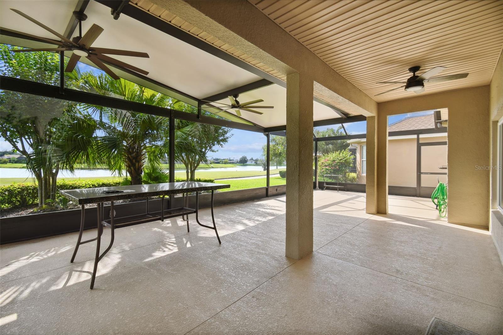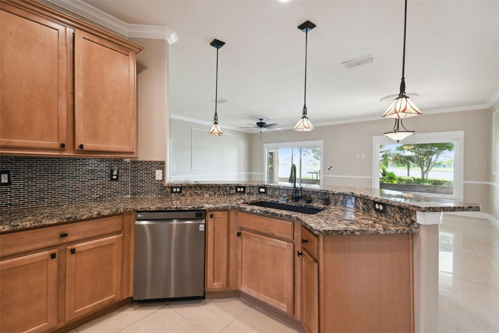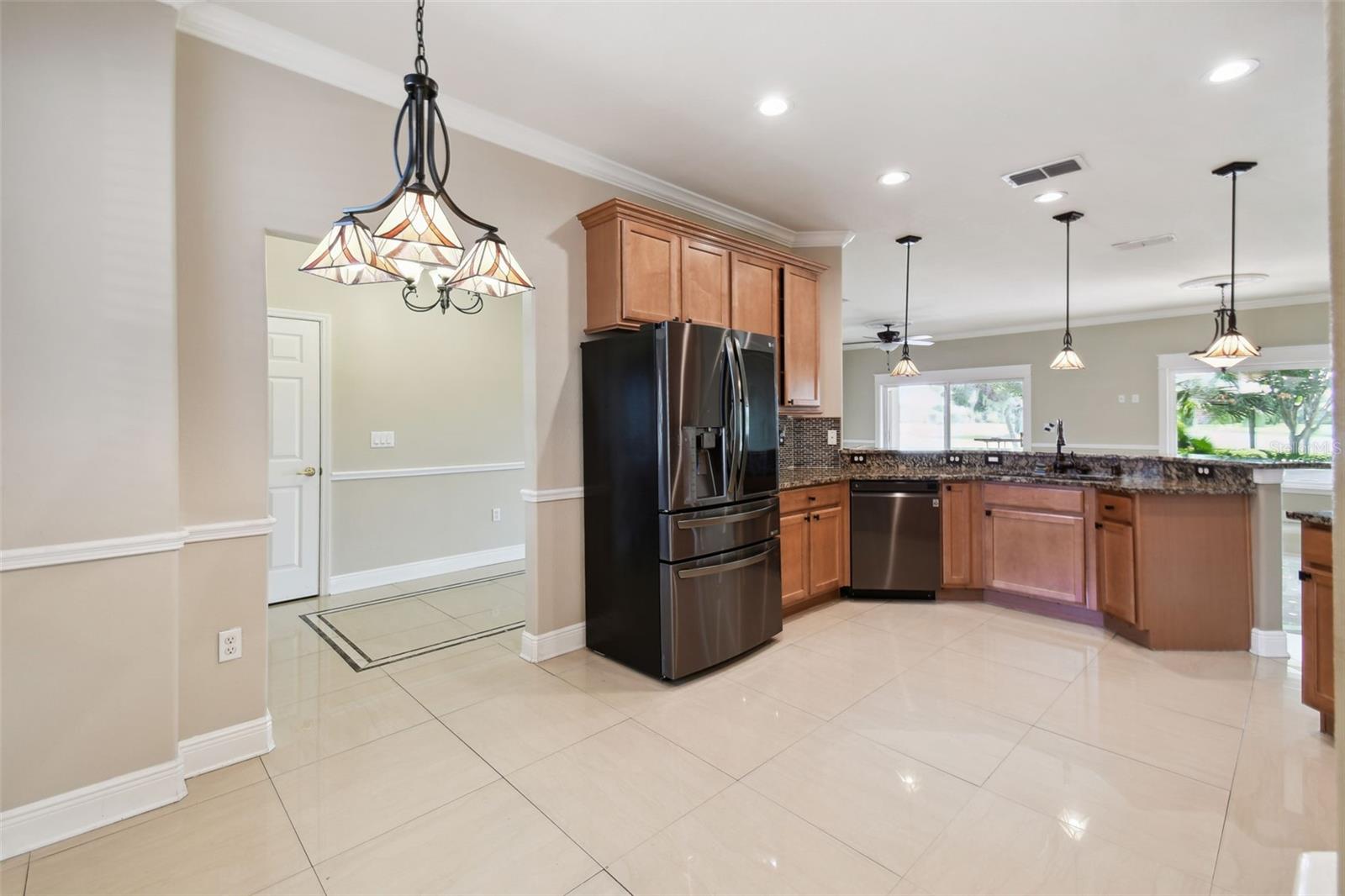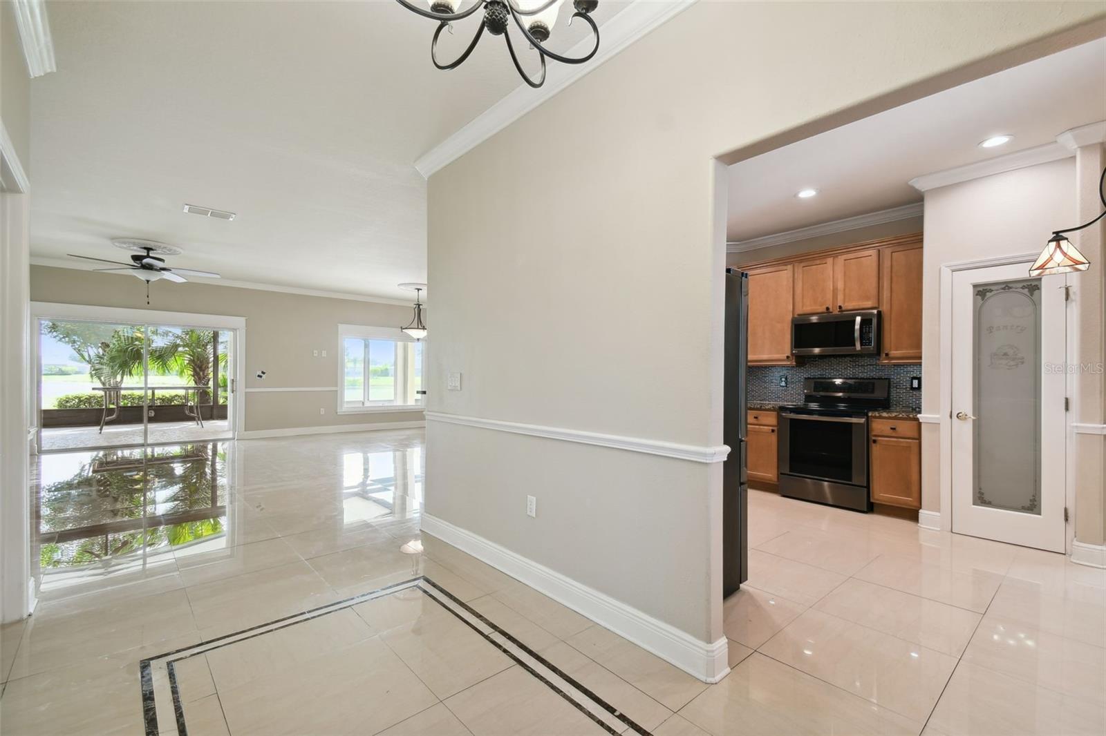 Check out this beautiful and well maintained Savoy model. This home is loaded with upgrades. Starting in the Kitchen you have 42" wood cabinets with pull out drawers in bottom cabinets. Granite counter tops with glass backsplash. Stainless steel appliances upgraded in 2019. New frosted glass pantry and laundry doors. New garbage disposal. Laundry room is off the Kitchen with washer / dryer and upper cabinets for convenience. Chair rails in living area. New 5 1/4" baseboards, Crown Molding and rounded corners throughout this home. New large moldings around the newly installed windows (2020), Picture window in Dining room and picture / sliders in Master bedroom and 2nd bedroom. The Master bathroom, Jack and Jill bathroom and the 1/2 bathroom have all been beautifully and thoughtfully remodeled. 24x24 Porcelain tile in every room. All newer installed ceiling fans and light fixtures. Pelican water softener installed in 2020. Water heater replaced in 2022. Take stunning photographs or just lounge on the expansive Lanai (added in 2018) that overlooks the gorgeous Golf course and Pond. A/C replaced in 2020. Roof replaced in 2017. Solar Panels installed in 2020 (will be paid off in full at closing). Electric bill is $33.87 each month.....Seller is motivated.....Call to view this incredible Home that could be yours in 2024.