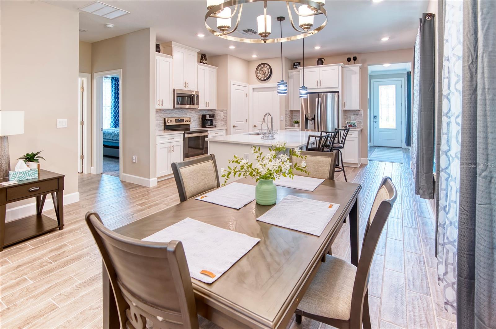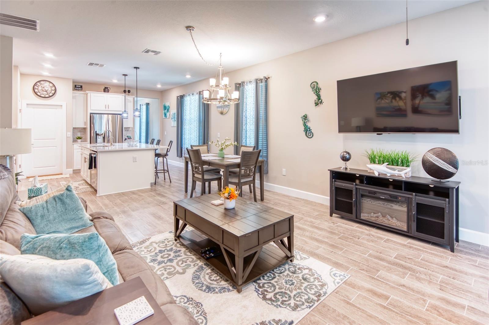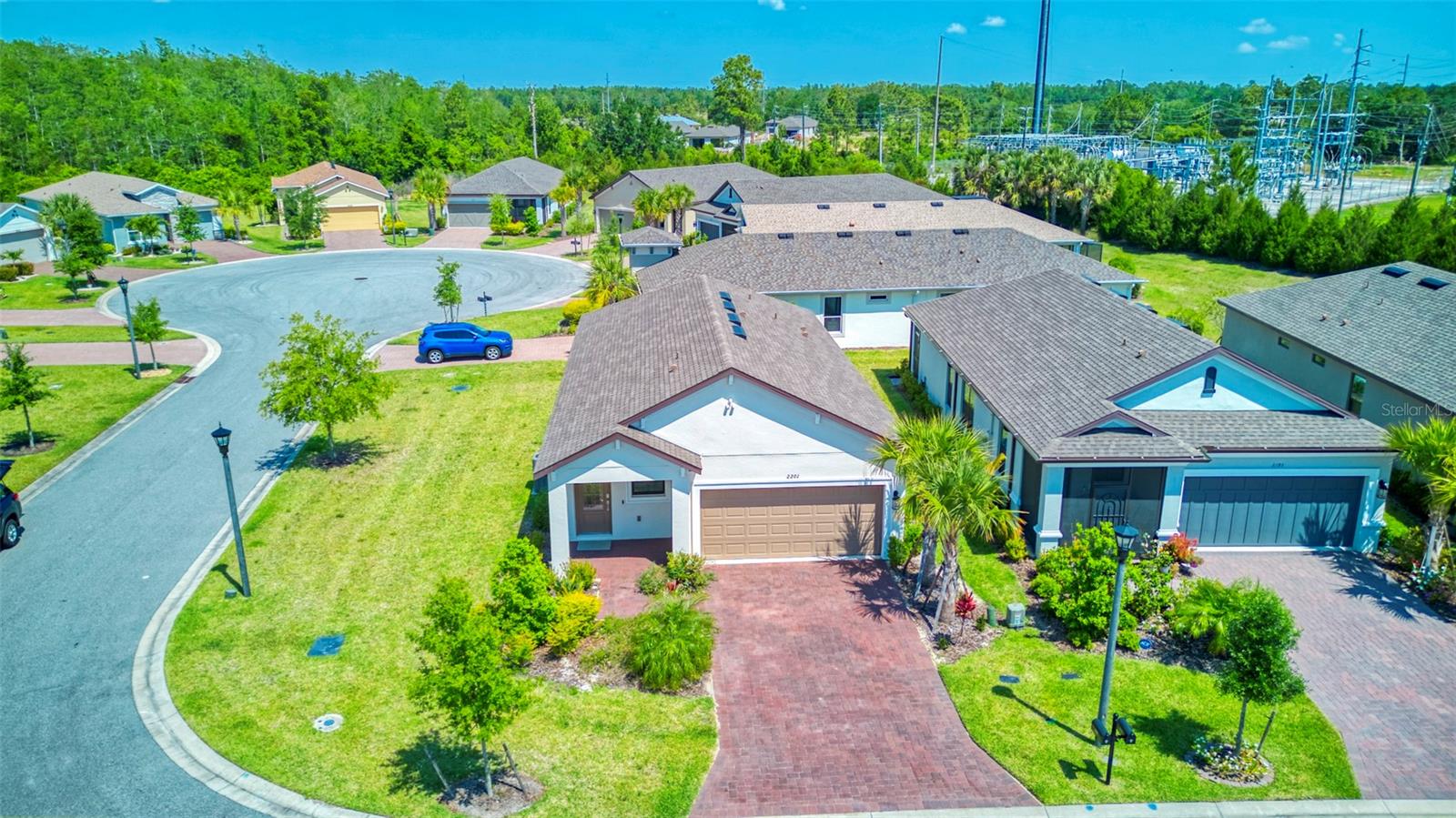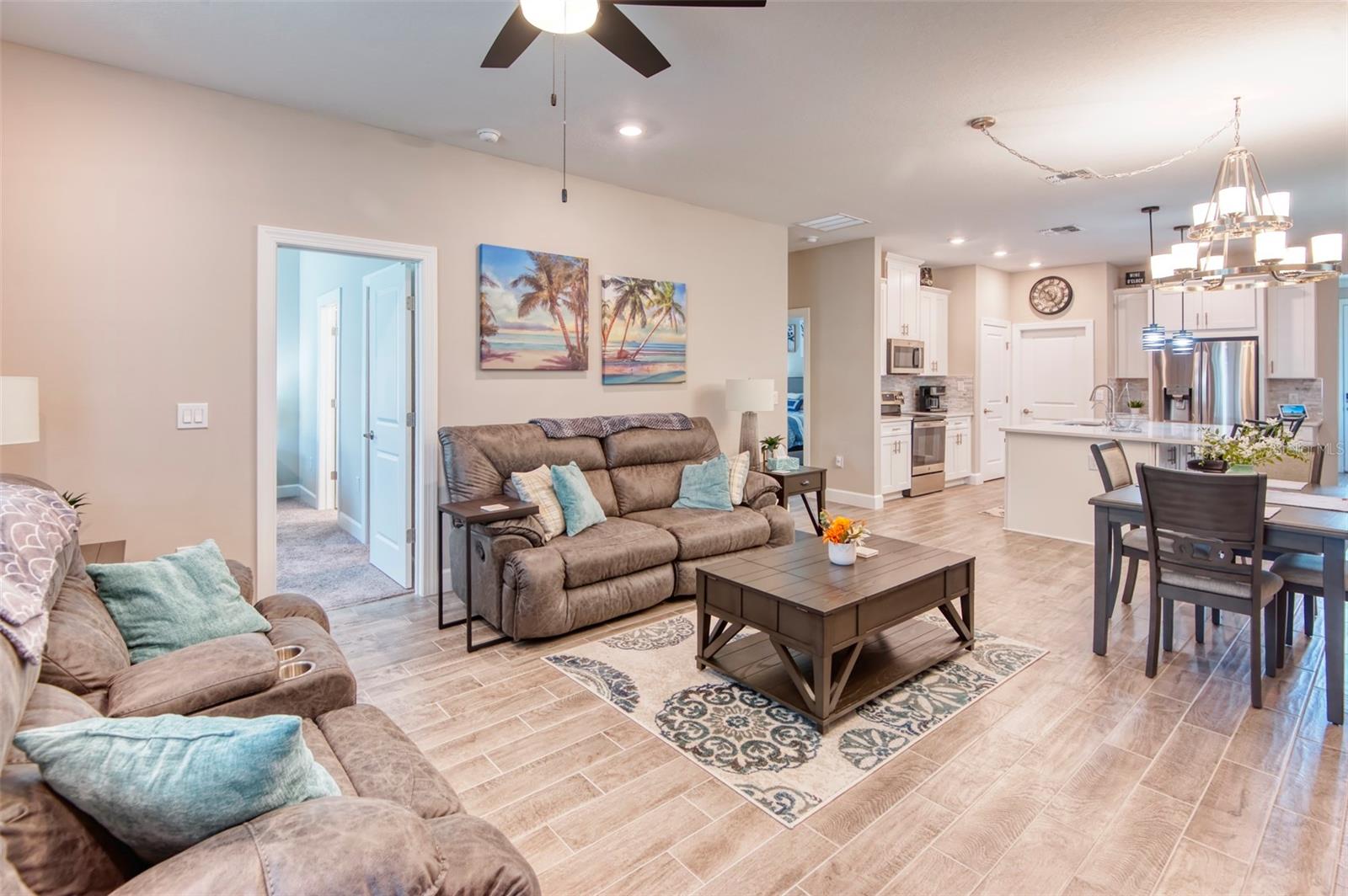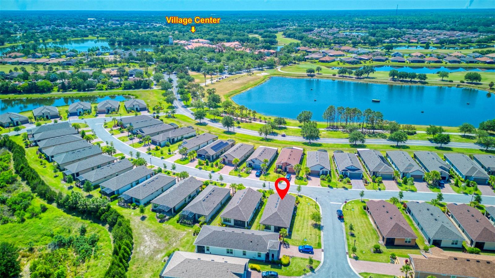 PRICE REDUCTION! This well-maintained 2022 completed home is ready for FUN! This home is move in ready and makes it easy to enjoy the resort lifestyle in Solivita, the award winning 55 Plus Community. Located on a corner lot at the entrance of a charming cul de sac, this MUST SEE Amalfi Model is located in the quiet Viareggio neighborhood and is close to the Solivita Village Center, a hub for so many activities. This home features 2 bedrooms, 2 bathrooms, a separate laundry room with washer/dryer, and a 2-car garage. The kitchen features pendant lightings over a large island, quartz countertops, ample cabinets with plenty of counter space for food preparation, a pantry, along with stainless steel appliances. The large kitchen island has additional storage cabinets in the front and rear. The combination Great Room/Dining area is great for entertaining and the covered and screened lanai is a relaxing spot to enjoy your morning coffee. You will love the spacious feel of this home, the wood look tile floors in the main living areas, the window treatments, and ceiling fans in the Great Room and Bedrooms. The home shows like a model home! The main bedroom with an ensuite bathroom features a walk-in closet and a tile shower and tile flooring. The guest bedroom features a double door closet and the guest bathroom, with tub has wall and floor tile. Additional upgrades include 5-inch baseboards throughout the house, a Nest Thermostat, Digital Front Door Key Pad, and epoxy flooring in both the lanai and garage. Near the Village find Stonegate Golf's facilities which even has its own Driving Range. Come enjoy the good life in Solivita with 14 community pools, including an indoor pool complete with a second floor indoor track, 2 HUGH amenity centers with gyms and so much more, 2 championship golf courses, 3 restaurants, a ballroom, pharmacy, concierge, full team of lifestyles staff, over 200 social clubs to join, major sports and fitness options such as pickleball, tennis, softball, bocci ball, shuffleboard and much more all nestled on over 4200 acres of natural beauty and conveniently located to Disney and the Orlando International Airport. This home is move in ready. Make this your home to own!