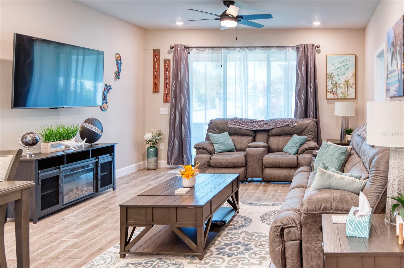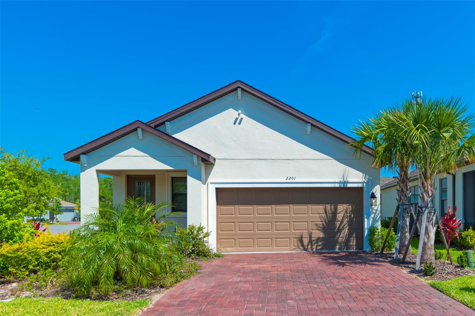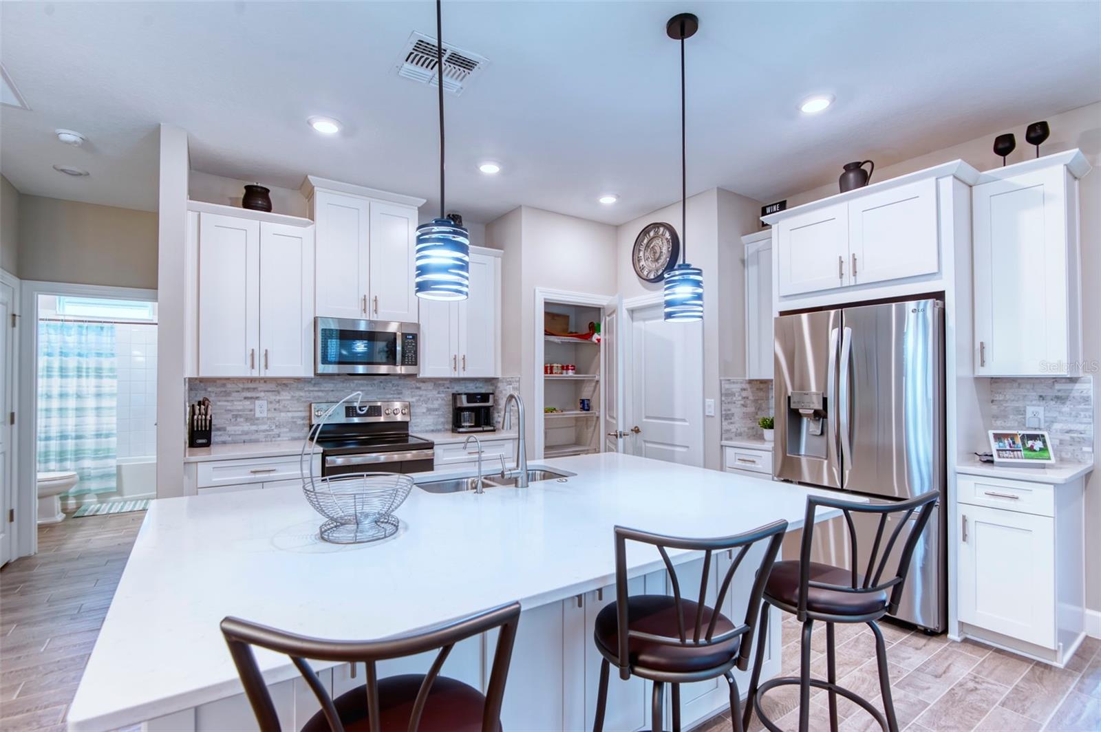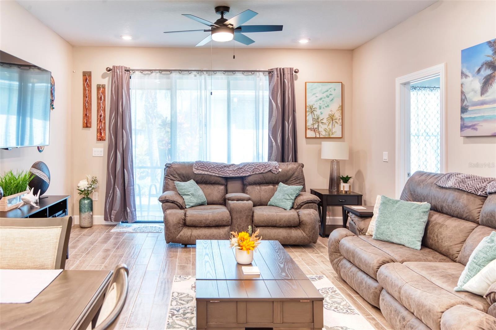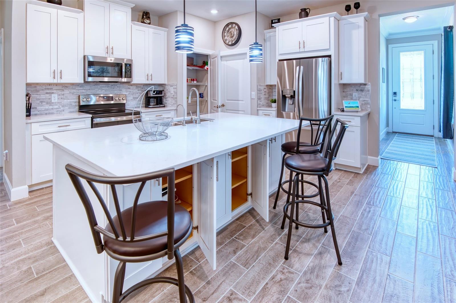 PRICE REDUCTION! This well-maintained 2022 completed home is ready for FUN! This home is move in ready and makes it easy to enjoy the resort lifestyle in Solivita, the award winning 55 Plus Community. Located on a corner lot at the entrance of a charming cul de sac, this MUST SEE Amalfi Model is located in the quiet Viareggio neighborhood and is close to the Solivita Village Center, a hub for so many activities. This home features 2 bedrooms, 2 bathrooms, a separate laundry room with washer/dryer, and a 2-car garage. The kitchen features pendant lightings over a large island, quartz countertops, ample cabinets with plenty of counter space for food preparation, a pantry, along with stainless steel appliances. The large kitchen island has additional storage cabinets in the front and rear. The combination Great Room/Dining area is great for entertaining and the covered and screened lanai is a relaxing spot to enjoy your morning coffee. You will love the spacious feel of this home, the wood look tile floors in the main living areas, the window treatments, and ceiling fans in the Great Room and Bedrooms. The home shows like a model home! The main bedroom with an ensuite bathroom features a walk-in closet and a tile shower and tile flooring. The guest bedroom features a double door closet and the guest bathroom, with tub has wall and floor tile. Additional upgrades include 5-inch baseboards throughout the house, a Nest Thermostat, Digital Front Door Key Pad, and epoxy flooring in both the lanai and garage. Near the Village find Stonegate Golf's facilities which even has its own Driving Range. Come enjoy the good life in Solivita with 14 community pools, including an indoor pool complete with a second floor indoor track, 2 HUGH amenity centers with gyms and so much more, 2 championship golf courses, 3 restaurants, a ballroom, pharmacy, concierge, full team of lifestyles staff, over 200 social clubs to join, major sports and fitness options such as pickleball, tennis, softball, bocci ball, shuffleboard and much more all nestled on over 4200 acres of natural beauty and conveniently located to Disney and the Orlando International Airport. This home is move in ready. Make this your home to own!