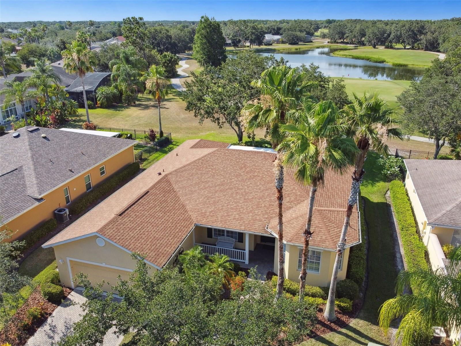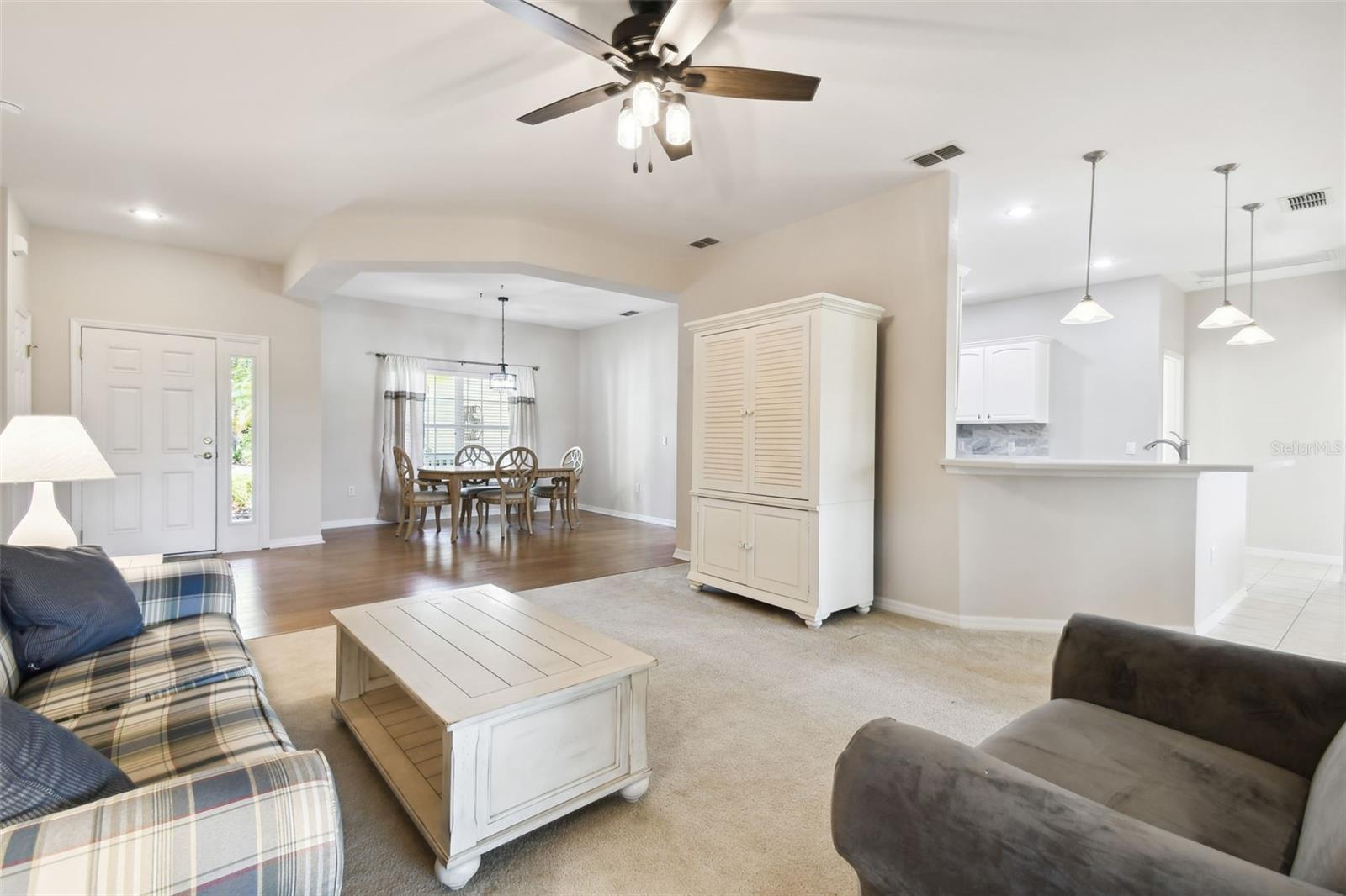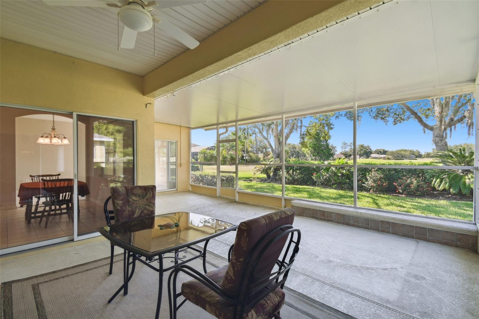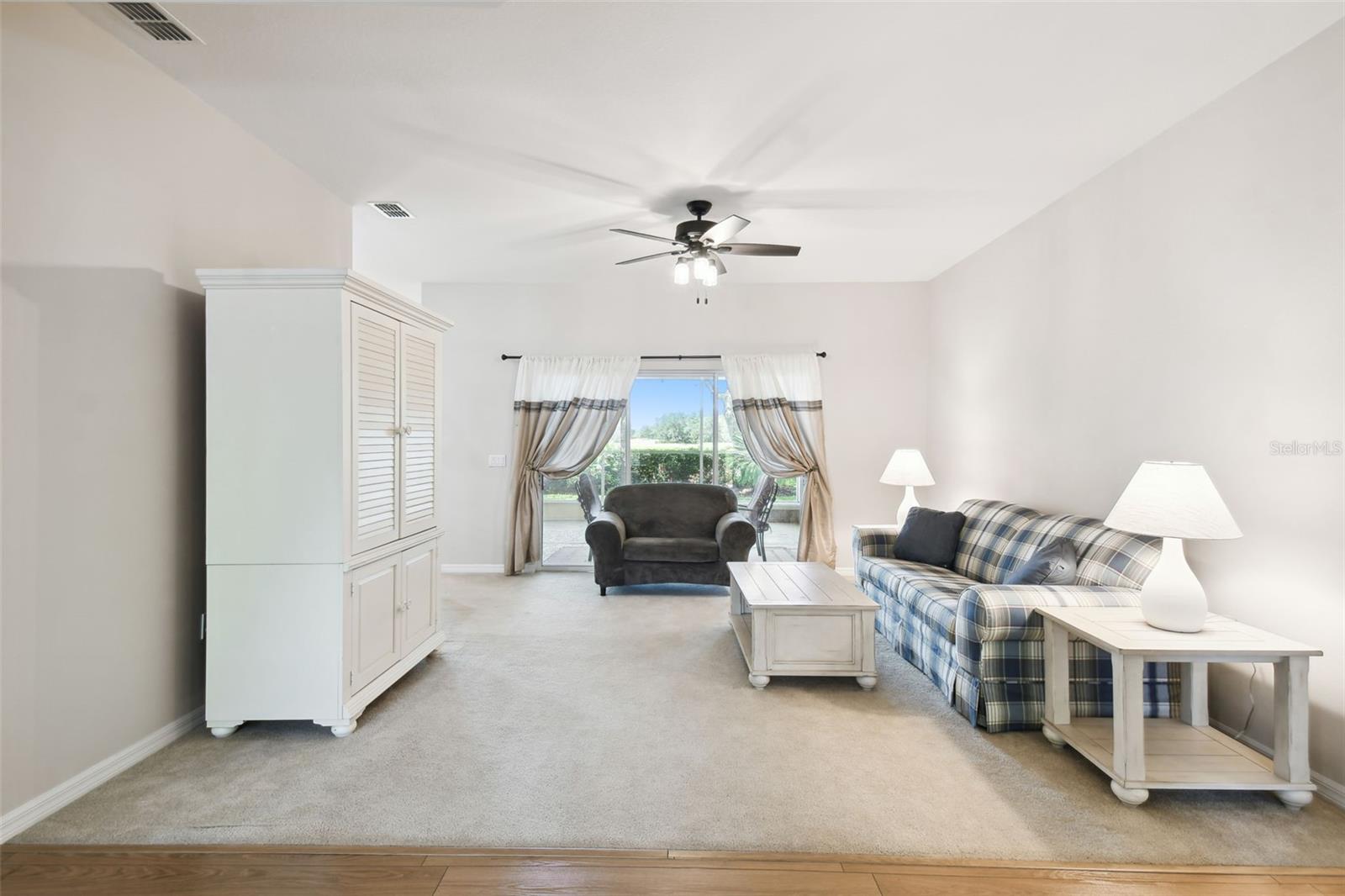 Welcome to this elegant Carnegie model home offering breathtaking views of the 15th hole of the prestigious Stonegate Oaks Golf Course. Located close to the South gate making entering and leaving the community a breeze. This home features a newer roof (2019) and HVAC system (2018), ensuring comfort and peace of mind. The highlight of this property is the extended, screened, and covered lanai with an insulated ceiling and drainage system, providing a perfect space to enjoy the stunning golf course vistas. Inside, the modern kitchen boasts stainless steel appliances (2019), Corian countertops, 37" upper cabinets with crown molding, pull-out drawers in the lower cabinets, and recessed and pendant lighting, offering ample counter space and functionality. The foyer and dining room are adorned with elegant laminate flooring, while the kitchen and bathrooms feature durable ceramic tile. The great room, Florida room, and bedrooms are carpeted for added comfort. THE CARPET AND EXISTING LAMINATE CAN BE REPLACED BY SELLER PRIOR TO CLOSING WITH A FULL PRICE OFFER AND A NON-REFUNDABLE ESCROW MONEY DEPOSIT. ASK THE AGENT FOR FULL DETAILS. The spacious Florida room opens directly to the lanai, making it an ideal spot for indoor-outdoor living. The generously sized primary suite includes two walk-in closets. The primary bathroom is a retreat with Corian counters, mirrored medicine cabinets, dual raised vanities, a makeup area, a garden tub, and a shower. Additional features include a large laundry room with a pantry and built-in cabinets, and an extended garage with 6' of additional space, epoxy-painted floors with confetti chips, a 40-gallon water heater (2020), a wash basin, and extra shelving. The whole house Pelican water softener and filtration system further enhance the quality of living. This beautifully maintained home, with its exterior painted in 2022, is located within a short distance of the neighborhood pool. The Community Development District (CDD) debt payment is fully paid. Don't miss the opportunity to own this stunning property that perfectly blends elegance, comfort, and modern amenities. Solivita is an award winning 55+ community featuring over 4200 acres of wetlands, parks and lakes, 150,000 sq ft of state of the art amenities and work out facilities, 3 restaurants, pharmacy with sundry store, 14 heated swimming pools, 5 heated spas, 2 dog parks, tennis courts, pickleball courts, shuffleboard, bocce ball, billiards room, art gallery, community garden, butterfly garden, 2 championship 18-hole golf courses. The large ball room hosts almost nightly events and the more than 200 clubs will ensure that you can find something fun to do! Join the travel club, the pizza club, the Disney club or do nothing at all while you sit peacefully in one of the many quiet park settings. Voted one of the top 6 communities in America, Solivita is close to the theme parks, beaches, and all the wonderful adventures that Central Florida has to offer. Solivita is a little piece of paradise. Call us today!