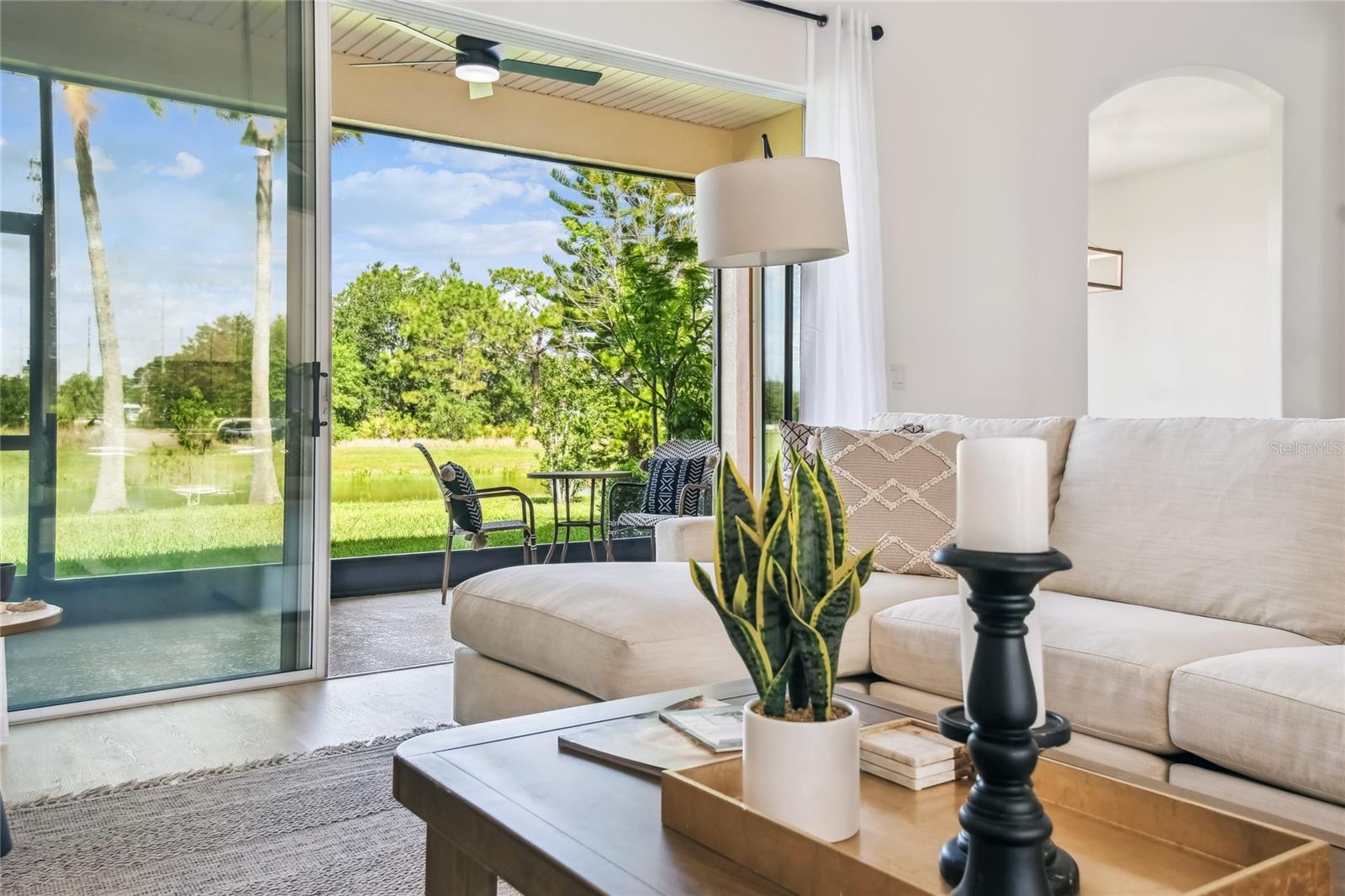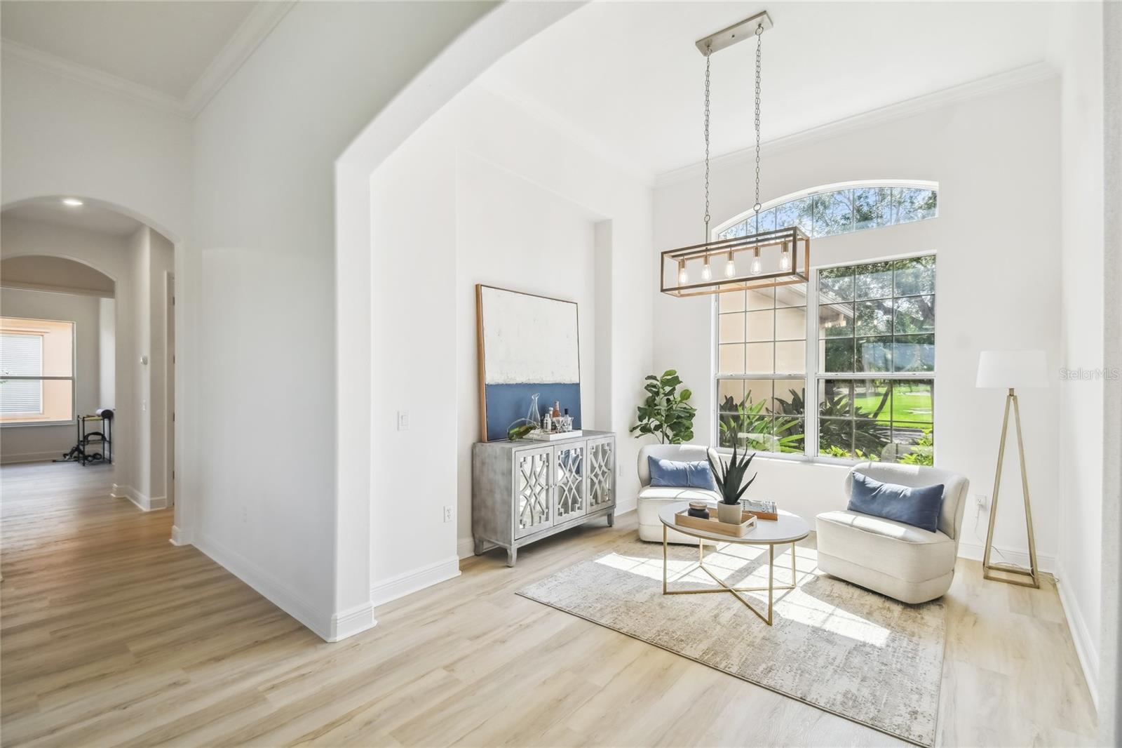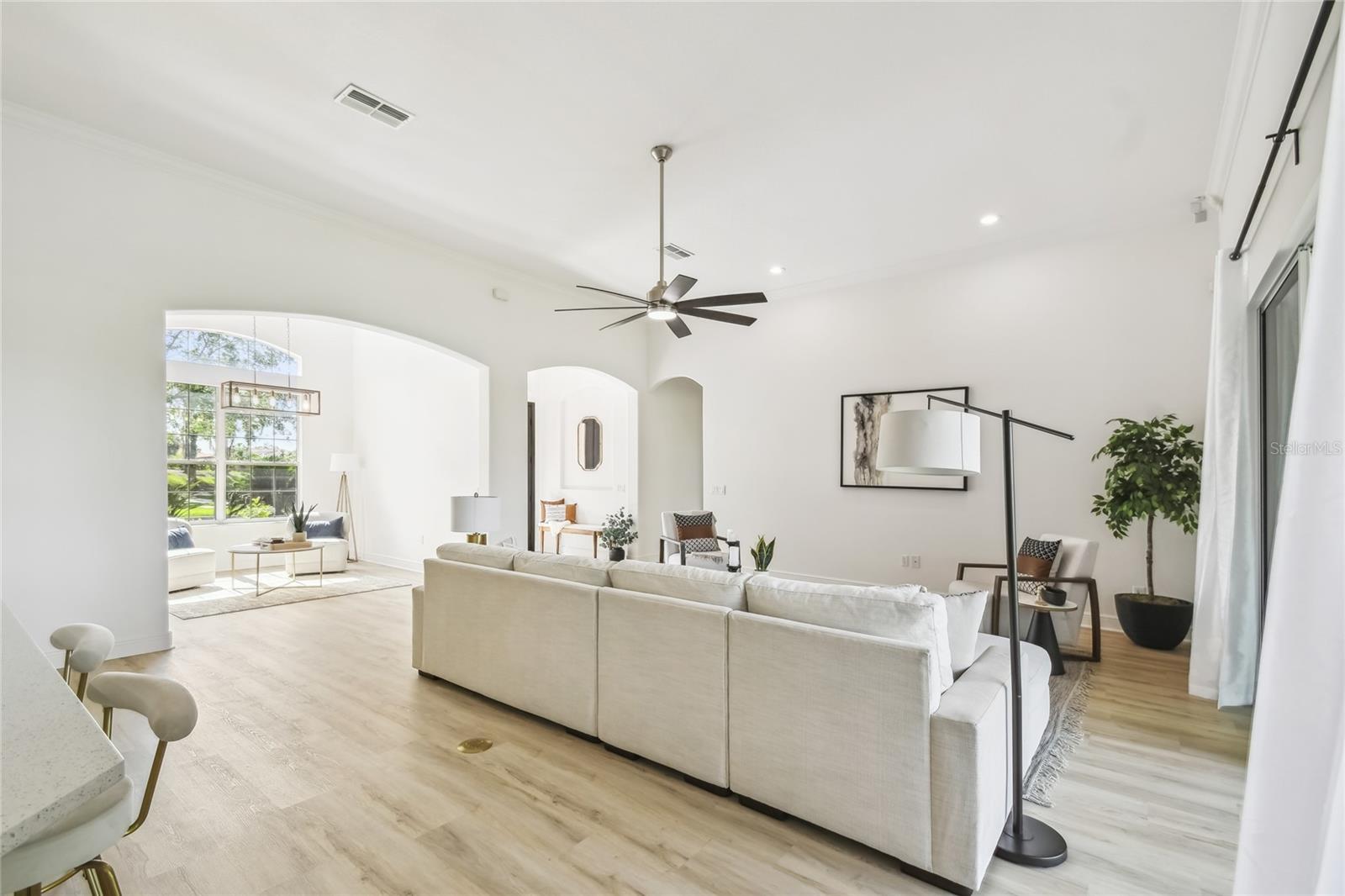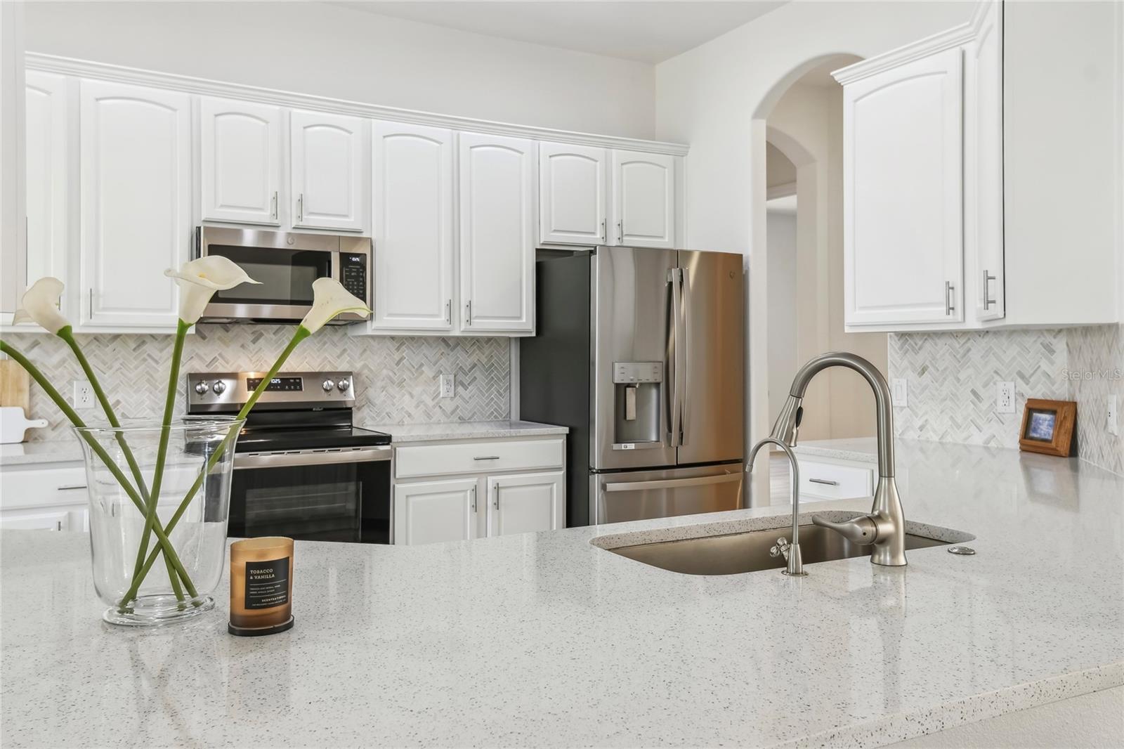This stunning, fully REMODELED barrel tile roof Verona model offers modern touches throughout, perfectly situated across from the GOLF COURSE with serene rear WATER VIEWS and a spacious 3-CAR GARAGE.** Click on VIRTUAL TOUR link 1 to see MATTER PORT 3D VIDEO and virtually walk through this home.** Twelve-foot ceilings greet you as you enter through the elegant double glass doors, creating a welcoming entryway. Featuring 3 bedrooms, 2.5 baths, plus a DEN, this thoughtfully designed home offers plenty of space for everyone and a layout that’s ideal for everyday living and entertaining. The open-concept kitchen is a showstopper, showcasing: 42-inch cabinetry with lower drawer pull-outs, All-NEW STAINLESS STEEL appliances, Gorgeous QUARTZ countertops, polished herringbone tile backsplash AND a newly EXTENDED BREAKFAST BAR that enhances flow and functionality. Adjacent to the kitchen, the dining room features a beautiful BAY WINDOW, creating a spacious and inviting area. Luxury vinyl plank (LVP) flooring throughout (no carpet!), CROWN MOLDING, and SMART LIGHTS and FANS add a stylish touch. The PRIMARY SUITE has been beautifully upgraded with raised vanities, DUAL SINKS, quartz counters, PORCELAIN TILE WALK-IN shower, and the addition of a stunning oval-shaped free-standing tub, bringing a true spa-like feel.The addition of a LINEN CABINET provides convenience and storage space. A split floor plan offers privacy, with two additional bedrooms and a full bath located on the opposite side of the home—ideal for guests. The versatile den can serve as a 4th bedroom option, office, or home gym to suit your lifestyle. ALL bathrooms, including the half bath, have been beautifully renovated with new countertops, mirrors, cabinetry, and updated hardware for a fresh, modern look. The covered and NEWLY SCREENED lanai offers water views and lush landscaping, providing a quiet retreat to relax. Laundry room features a new UTILITY SINK. HWH replaced in 2022. HVAC replaced in 2016. WI-FI ENABLED GARAGE DOOR MOTORS. Located on a quiet CUL-DE-SAC and within easy access to the neighborhood pool, this home is truly a must-see! MOVE-IN READY and styled to impress—don’t miss this exceptional opportunity! Solivita's amenities include: - a manicured SOFTBALL diamond & field - 36 holes of CHAMPIONSHIP GOLF that can be played by joining the Stonegate Golf Club or paying as you go - 2 STATE of the Art AMENITY centers with updated exercise equipment, yoga studio & meeting rooms - 3 restaurants - 14 HEATED POOLS - 17 PICKLEBALL courts - 9 TENNIS courts - 4 BOCCE BALL courts - 4 SHUFFLEBOARD courts - 3 HORSESHOE pits - a BILLIARDS room - miles of bike paths - 2 DOG PARKS (Small & Large Dogs) - Corn Hole - Tot Lot PLAYGROUND - COMMUNITY GARDEN - over 250 resident clubs. The HOA: - maintains the LANDSCAPING & IRRIGATION systems in the common areas as well as at individual homesites - maintains the roads throughout the community - PROVIDES SECURITY with gate guards and mobile patrols including the Polk County Sheriff - allows AUTOMATED GATE ACCESS for residents via license plate readers - provides residents with Fiber Optic Internet & TV service.***Poinciana Lakes Plaza is a MAJOR NEW SHOPPING CENTER that opened directly across from the Solivita Main Gate in Summer of 2024. It features Sprouts Grocery, TJ MAXX, Ross, Burlington, Rack Room Shoes, 5 Below, Ulta, Outback, First Watch, 5 Guys, Urgent Care, Dentist, TD Bank, Petco & Hair Cuttery PLUS MORE TO COME.***