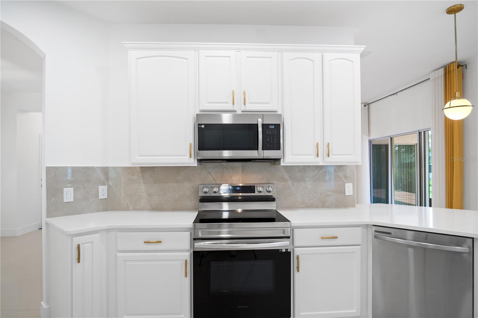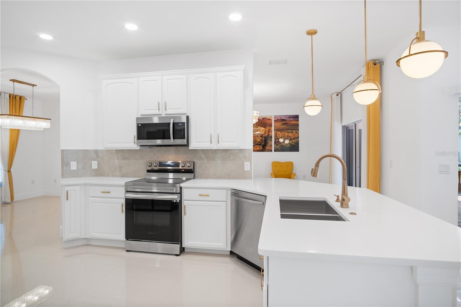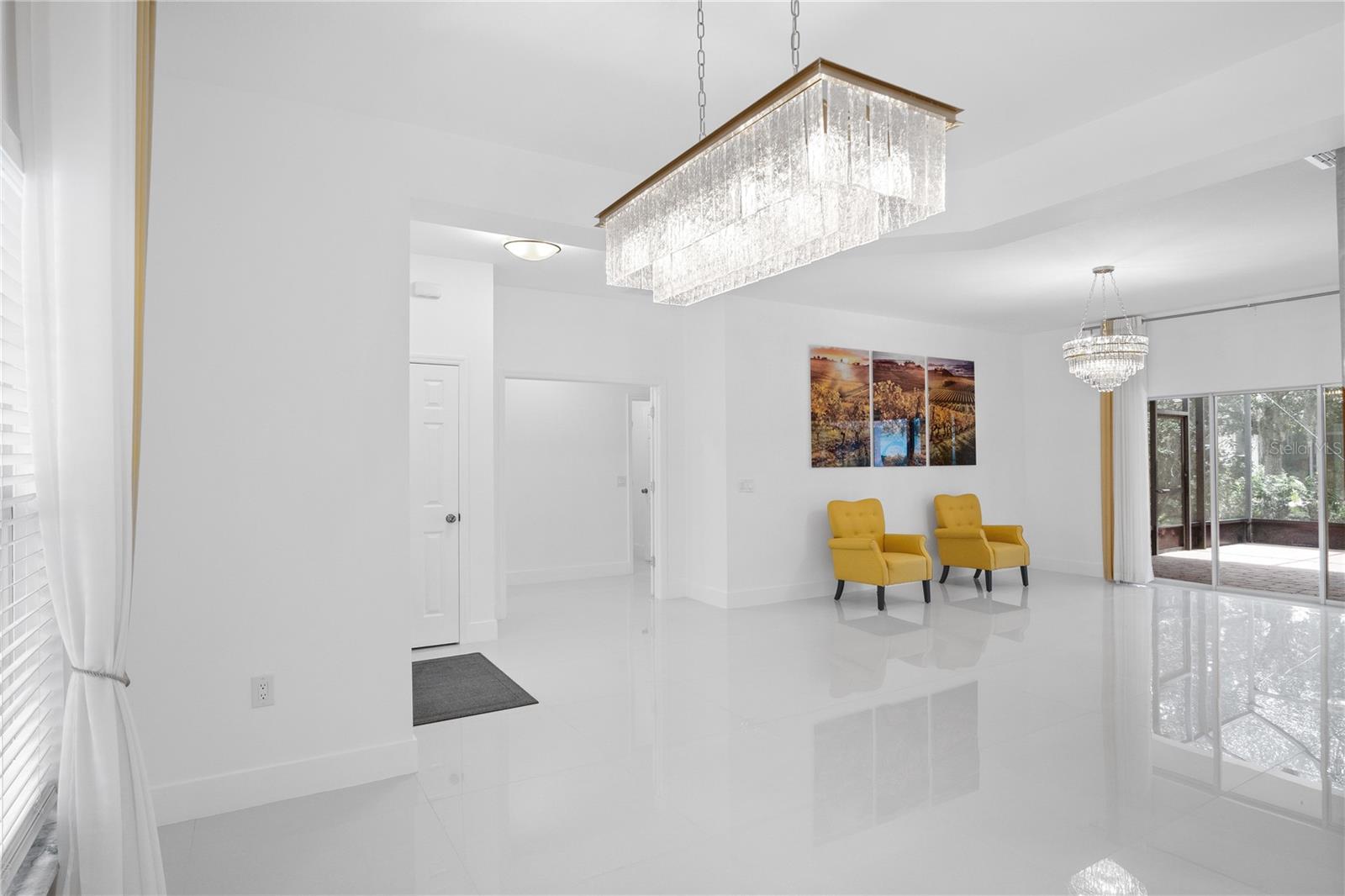 Welcome to this stunning, move-in-ready 2-bedroom, 2-bath single-family residence nestled in the heart of Solivita — one of Central Florida’s premier 55+ communities. Thoughtfully upgraded throughout, this home features brand-new porcelain tile flooring that adds a sleek, modern touch to every room. The spacious primary suite offers two walk-in closets, dual vanities with his-and-hers sinks, a separate shower, and a relaxing garden tub — your own private retreat. The second bedroom and bathroom are perfect for guests or a home office setup. The fully renovated kitchen boasts stainless steel appliances and is ideal for both daily living and entertaining. A full-size washer and dryer are included, along with elegant chandeliers and designer light fixtures that add character and charm throughout the home. Step outside to your private, covered lanai with custom pavers — perfect for enjoying your morning coffee or evening breeze. This home is conveniently located within walking distance of one of Solivita’s many pools and directly across from a scenic park, offering both relaxation and recreation just steps away. Solivita is a gated, golf cart-friendly community filled with amenities including restaurants, multiple pools, parks, tennis courts, golf courses, cricket, fitness centers, and countless clubs and activities. Whether you're looking for an active lifestyle or peaceful Florida living, this home is truly a must-see. Don’t miss the opportunity to make this exceptional home yours — schedule your private tour today!