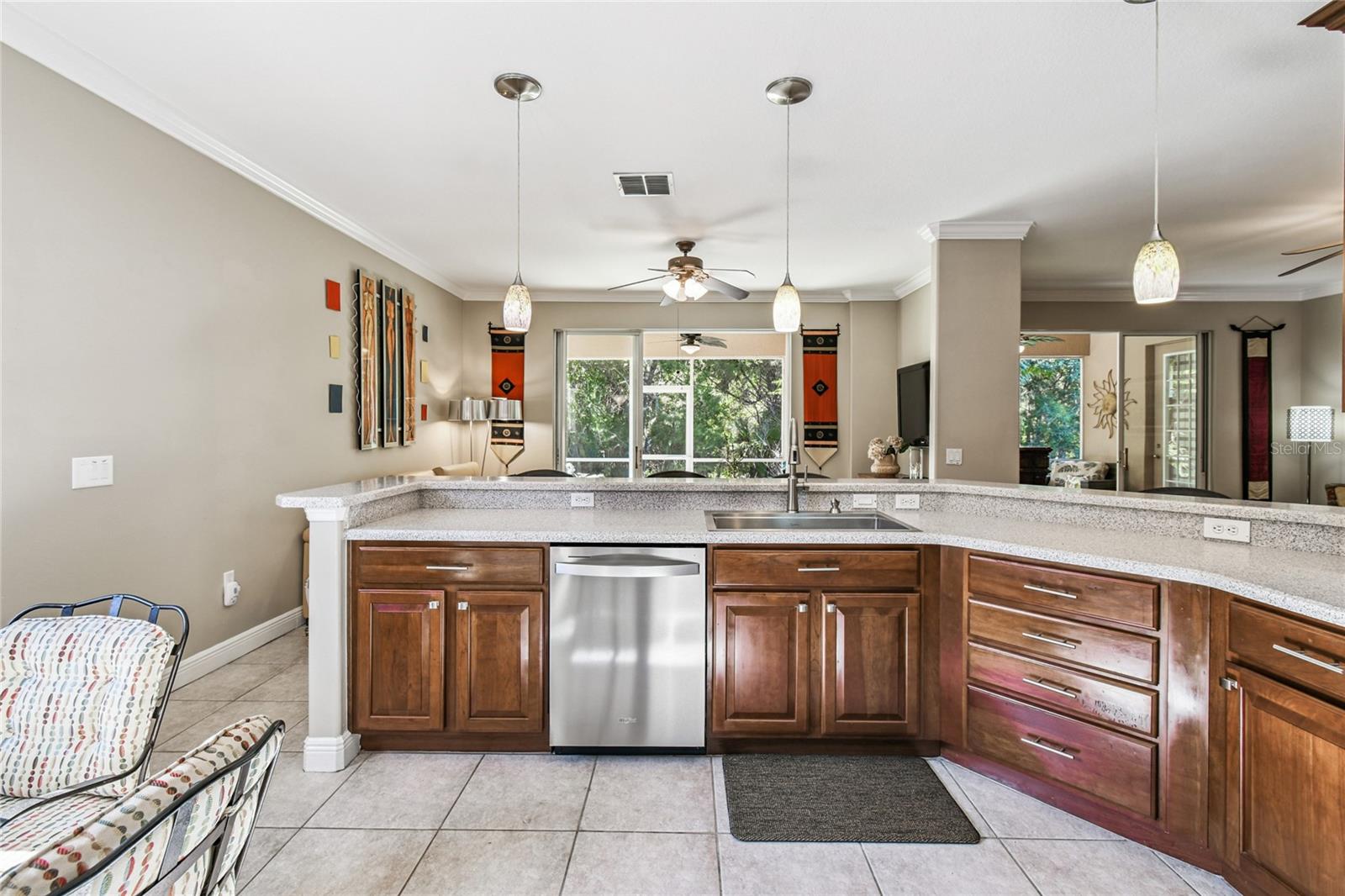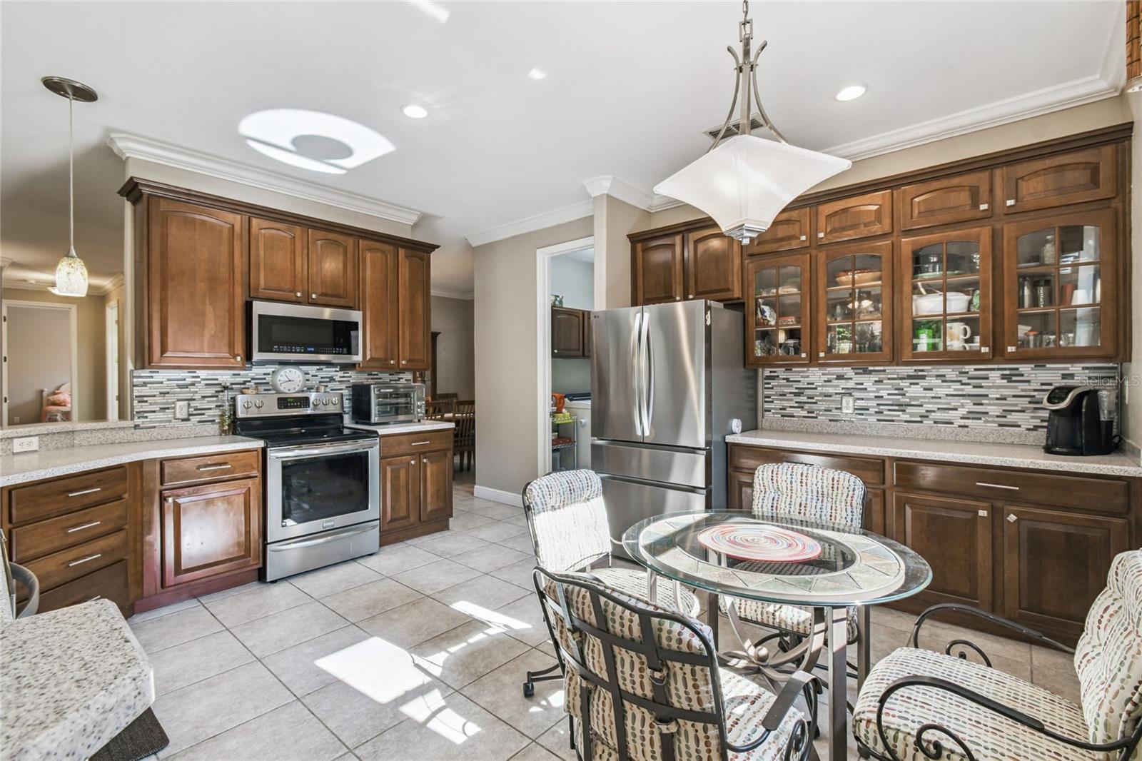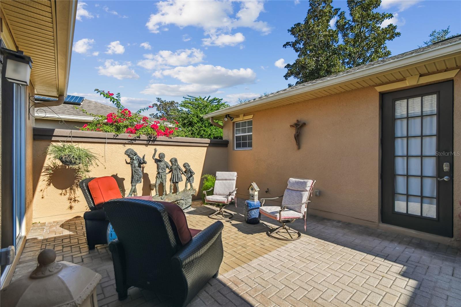 Lovely Bolero Model on Peaceful Conservation Lot with Separate Casita Suite! ROOF REPLACED 2024. HWH 2025. Welcome to this beautifully maintained 3-bedroom, 3-bath Bolero model home, perfectly situated on a serene conservation lot offering privacy and peaceful views. From the moment you enter through the gated, cozy courtyard oasis, you'll appreciate the charm and thoughtful layout this home provides. Inside, you'll find CROWN MOLDING and 18" tile flooring throughout—with no carpets—offering both style and low-maintenance living. The chef’s kitchen is a dream for any cooking enthusiast, featuring 42" glass-front cabinets with convenient lower pull-out shelves, newer stainless steel appliances, Corian countertops, newer sink(2024) and faucet (2025), and a spacious BREAKFAST BAR with PENDANT LIGHTING overlooking the inviting Florida room. The PRIMARY SUITE is a private retreat, boasting a separate sitting area with French door access to the lanai, perfect for enjoying quiet mornings or evenings. The ENSUITE BATHROOM includes a jetted tub, walk-in shower, DUAL SINKS, and TWO generous WALK-IN closets.The second bedroom features sliding doors that open to the front courtyard and has a full bathroom nearby with a tub/shower combo, making it ideal for guests or family members. One of the standout features of this home is the separate CASITA SUITE, complete with PLANK TILE flooring, a full bath, WALK-IN CLOSET, and linen closet. This flexible space is perfect for guests, a private office, or hobby room. Enjoy the outdoors on the SCREENED and COVERED lanai featuring tile flooring with a decorative TILE RUG PATTERN on one end. This peaceful space overlooks the conservation area, where you can relax and enjoy quiet evenings surrounded by the sounds of nature. Additional highlights include a separate laundry room with NEW WASHER and DRYER (2025) included, upper storage cabinets, and a large pantry closet. The two-car garage is finished with EPOXY FLOORING and pull-down attic stairs for added storage. 8' FOOT DOORS and rounded corners. EXTERIOR PAINTED IN 2022. The HOA: - maintains the LANDSCAPING & IRRIGATION systems in the common areas as well as at individual homesites - maintains the roads throughout the community - PROVIDES SECURITY with gate guards and mobile patrols including the Polk County Sheriff - allows AUTOMATED GATE ACCESS for residents via license plate readers - provides residents with Fiber Optic Internet & TV service.***Poinciana Lakes Plaza is a MAJOR NEW SHOPPING CENTER that opened directly across from the Solivita Main Gate in Summer of 2024. It features Sprouts Grocery, TJ MAXX, Ross, Burlington, Rack Room Shoes, 5 Below, Ulta, Outback, First Watch, 5 Guys, Urgent Care, Dentist, TD Bank, Petco & Hair Cuttery PLUS MORE TO COME.***