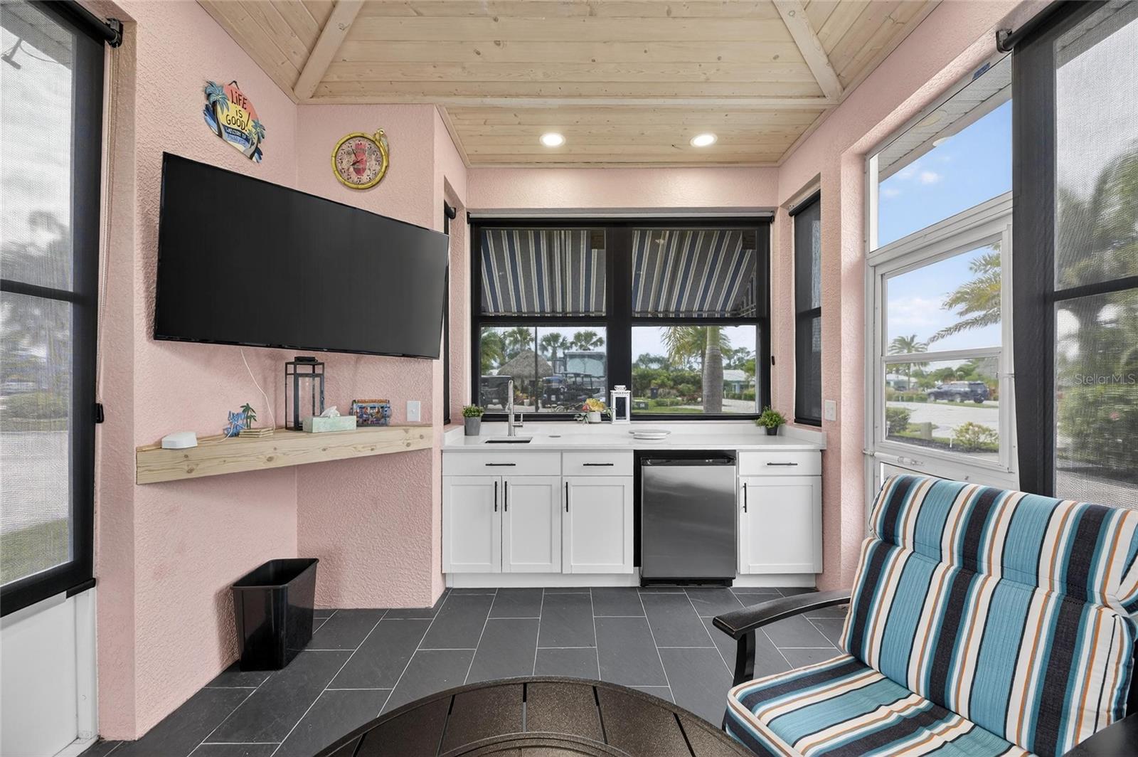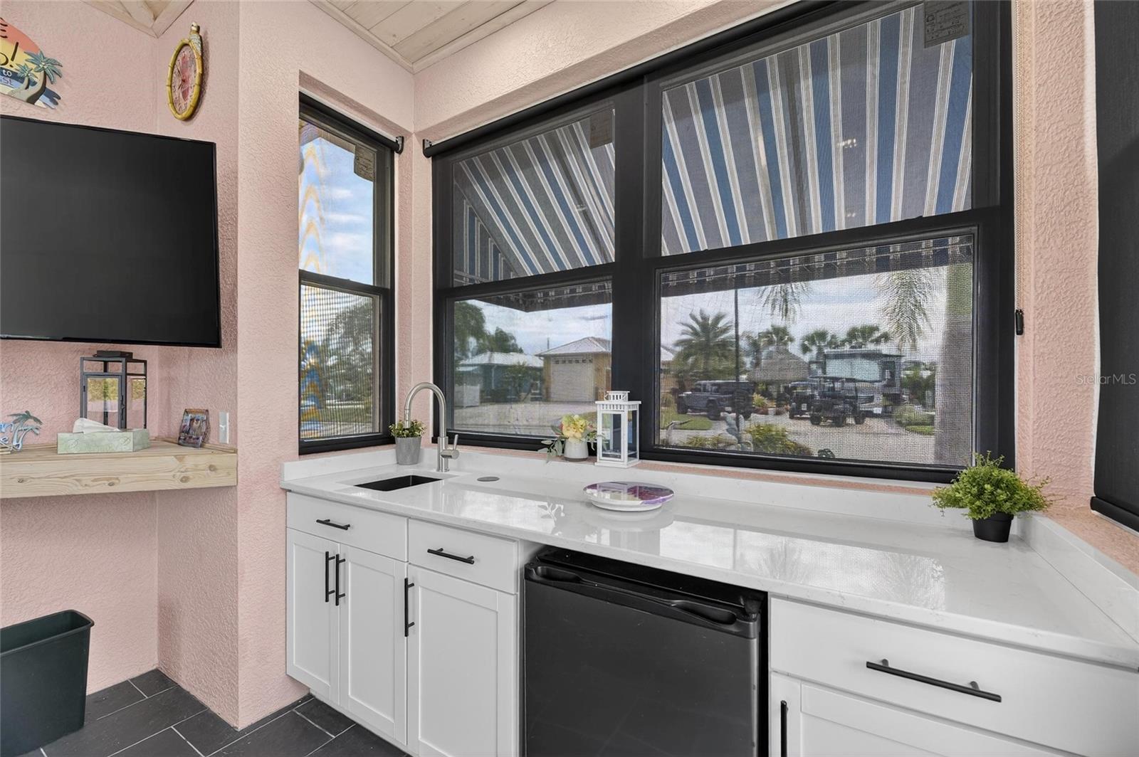 A large custom paver pad, professionally landscaped Lot. This huge enclosed pavilion is your personal paradise! Custom awnings, screened and glass windows in front and vinyl windows on sides make this the perfect entertainment area year round regardless of the weather. Large TV, Solid surface countertop, cabinets, sink and refrigerator convey. Large back patio with adjustable awning to relax in the sun or shade. Positioned next to a very large corner lot and casita this property can be purchased by itself or with the 2 BR/2 Bath next door as a package deal. Check out the adjacent property: 3287 Red Tail Hawk Dr. Bay Lake Motorcoach Resort is a Class A motorcoach resort offering incredible amenities. Owners and visitors can fill their days with activities and club outings or simply relax and enjoy the resort. Whether in search of community, travel, relaxation or recreation, Bay Lake is your home base for the Florida Lifestyle.