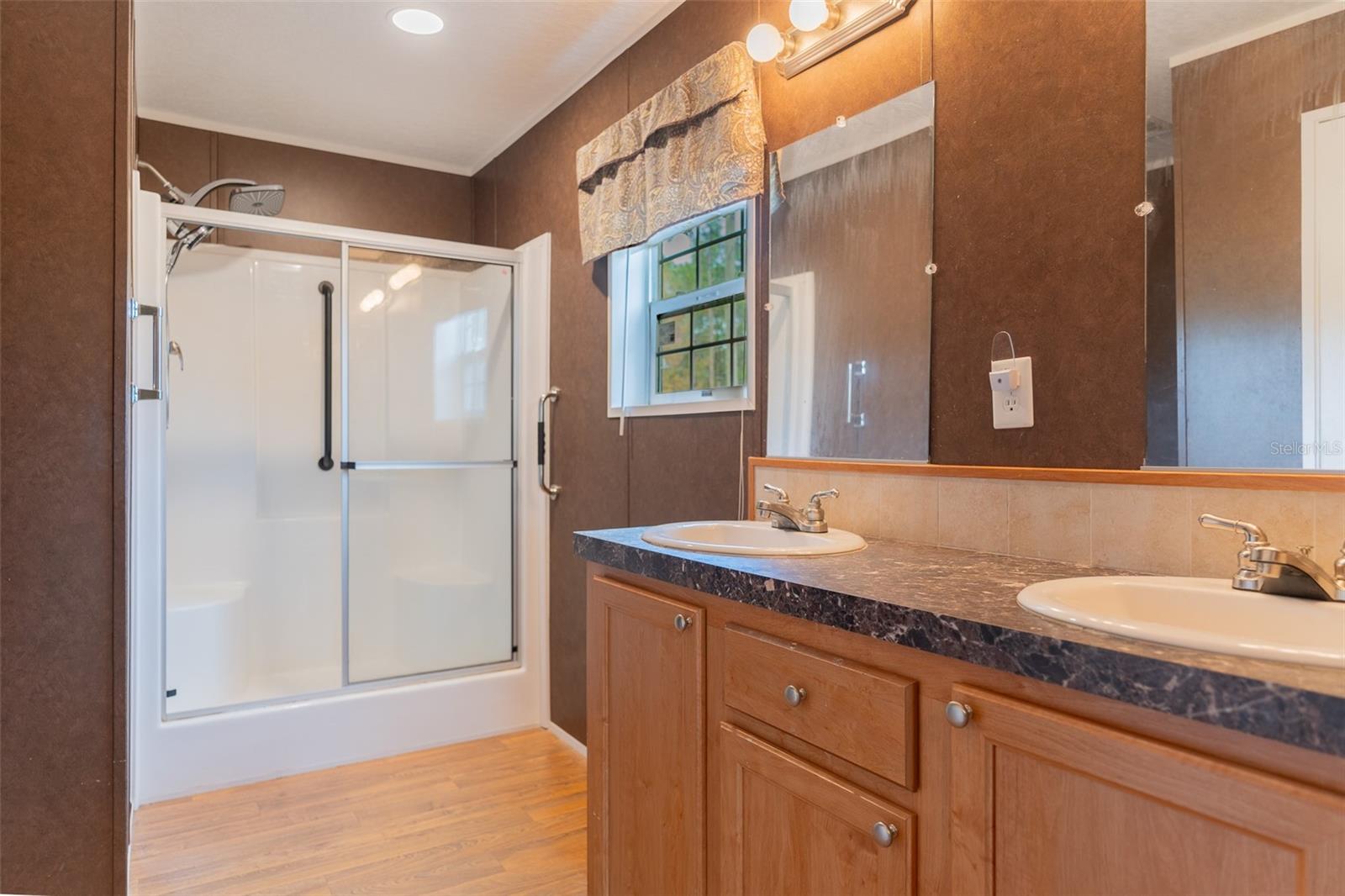 One or more photo(s) has been virtually staged. Nestled on a spacious 1-acre lot, this charming three-bedroom, two-bathroom home is a perfect blend of comfort, accessibility, and modern living. Designed with an open concept layout, this home radiates warmth and invites you to make it your own. Step inside to discover a split bedroom plan, providing privacy for family and guests alike. The expansive primary bedroom is a true retreat, featuring a generous walk-in closet and an en suite bath. Indulge in relaxation with a large stand-up shower equipped with dual showerheads and single vanity with two sinks. The heart of the home, the kitchen, is both functional and stylish, boasting an inviting island with seating that encourages gatherings and culinary creativity. The sleek stainless steel appliances add a modern touch. Natural light floods the home through sliding glass doors, connecting indoor and outdoor living seamlessly. The large covered deck offers the perfect setting for morning coffees or evening gatherings, allowing you to soak in the beauty of your expansive yard. Accessibility is a priority in this home, with wheelchair access at both the front and back entries, ensuring everyone can enjoy this lovely space. An additional feature includes a dedicated laundry room for added convenience and a large storage shed in the backyard, perfect for all of your gardening tools and outdoor gear. This property is more than just a house; it's a lifestyle waiting to be embraced. Don’t miss your chance to own this beautiful home where comfort, accessibility, and outdoor bliss come together. Schedule your private tour today and imagine the possibilities!