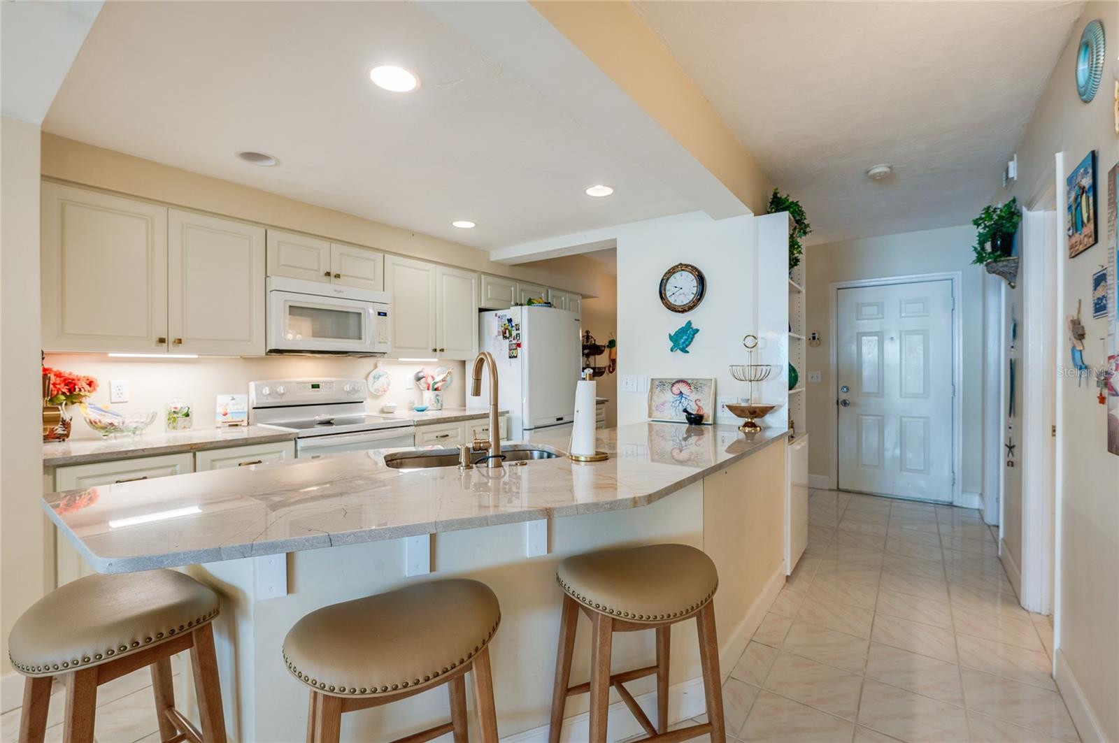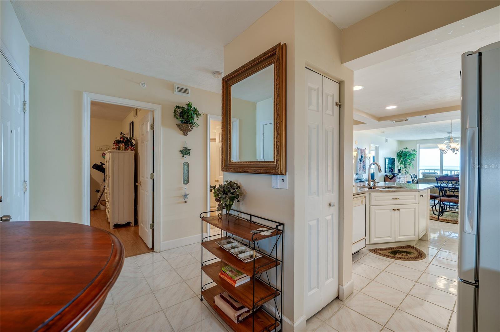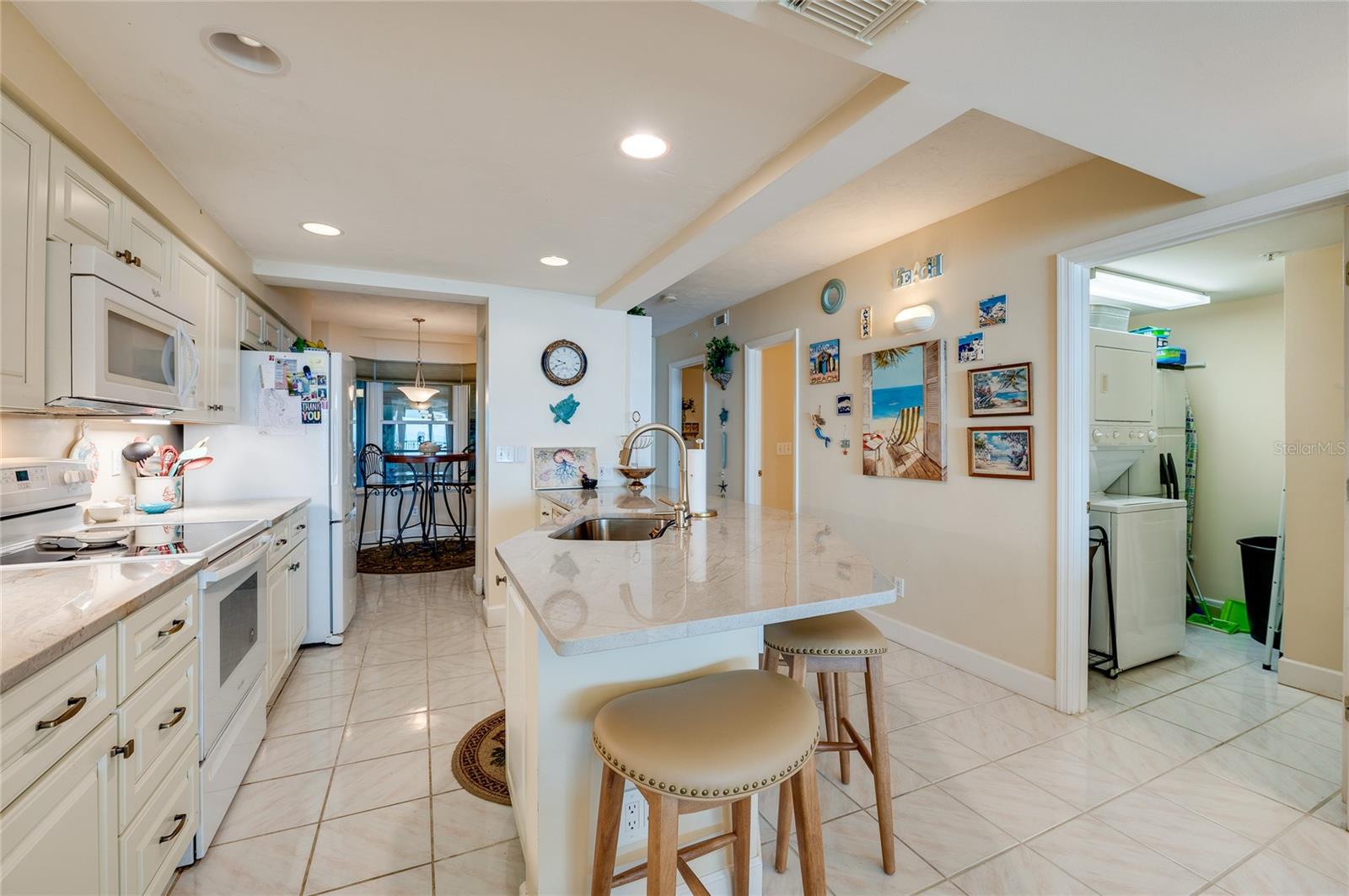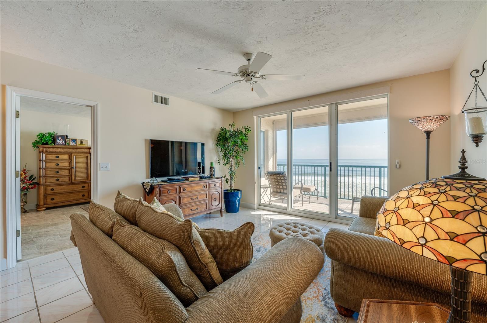 This oceanfront condo boasts million-dollar views from its 3rd-floor balcony, offering a direct view of the Atlantic. Featuring 2 bedrooms and 2 baths, it allows easy access to the private pool and no-drive beach. The oversized balcony, accessible through sliding glass doors in both the living room and master bedroom, invites relaxation and seamless outdoor living. Inside, enjoy high-end updates like quartzite countertops, custom cabinetry with under-cabinet lighting, and spacious walk-in closets. The condo has a breakfast nook and a Roman tub in the master bath. The tile and wood laminate floors throughout make for low-maintenance living, and there's a glass-enclosed lanai perfect for watching sunsets over the Intracoastal. Additional features include motorized hurricane shutters, an in-unit laundry room, and access to resort-style amenities like 3 outdoor pools, Jacuzzis, a large fitness center, and tennis/pickleball courts. Located in the serene Towers at Ponce Inlet, you'll enjoy living in a quaint town with a traffic-free beach, the historic lighthouse, the Marine Science Center, parks, and dining options. Boat dockage and storage are available, making it a boater's paradise.